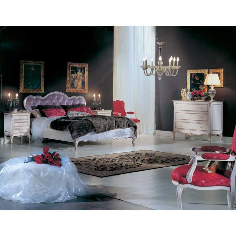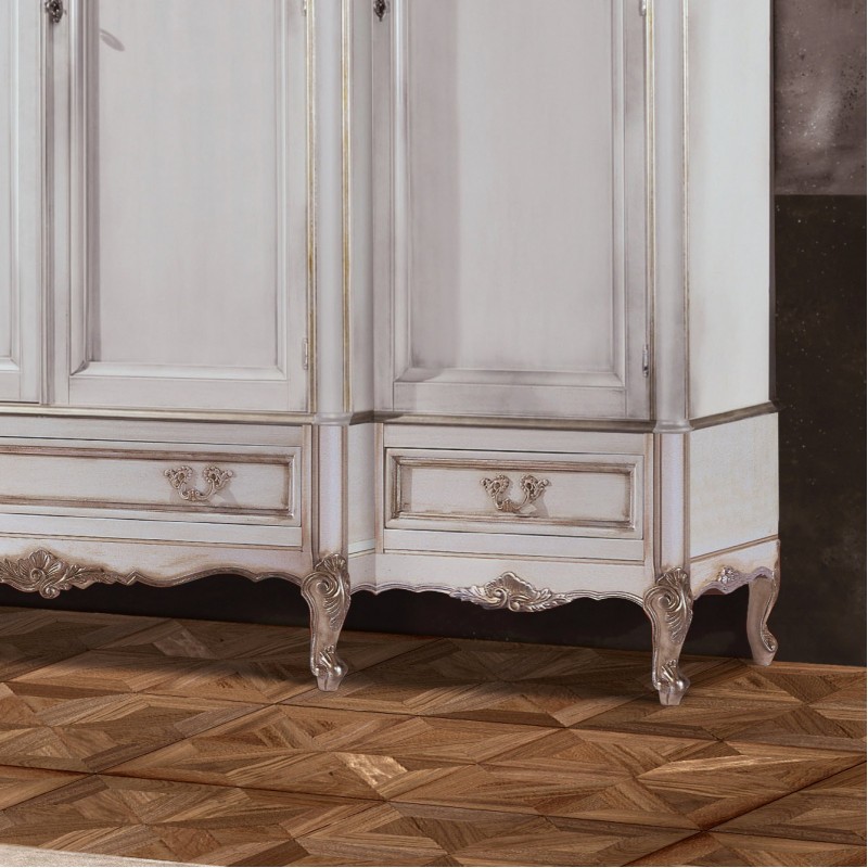 Armadio shabby costruito in legno con angoli smussati e gambe a sciabola, corpo centrale avanzato con due cassetti piccoli laterali e un cassetto grande al centro.. All'interno si trovano ripiani e pali appendiabito per riporre e appendere indumenti, con l'aggiunta dei 3 cassetti per riporre biancheria intima. Trova facilmente posto in camera proteggendo con le porte il suo contenuto all'interno. Unica nel suo genere con la sua particolare laccatura invecchiata creando un bellissimo contrasto con la foglia argento, dando un tocco a un' atmosfera dallo stile romantico.