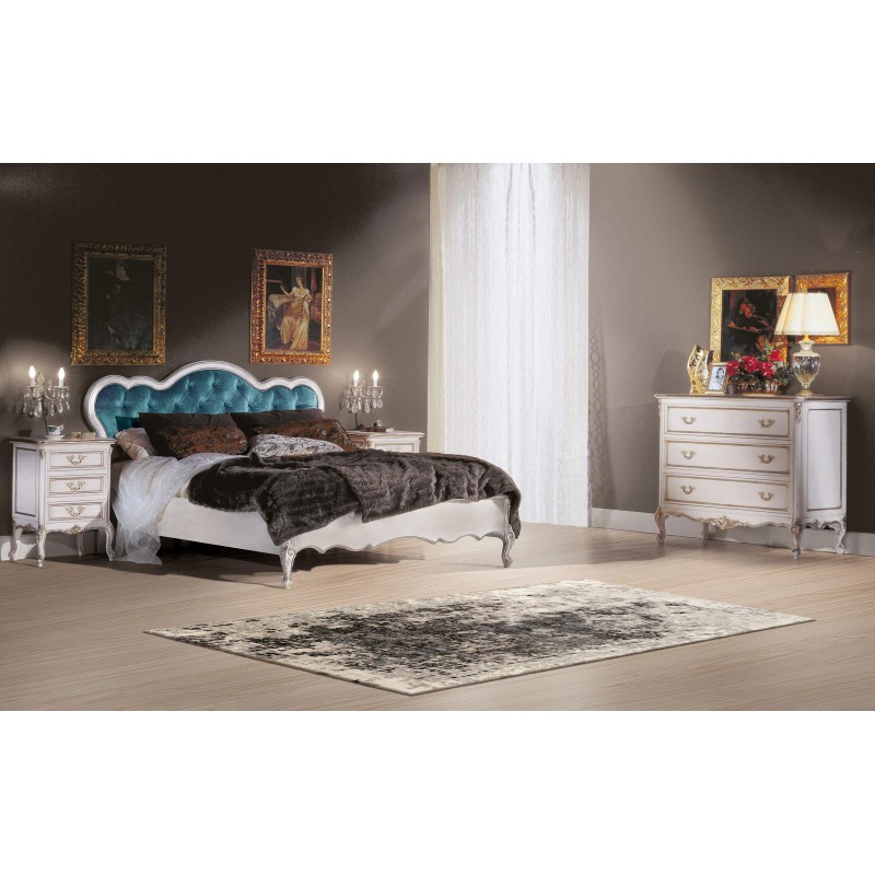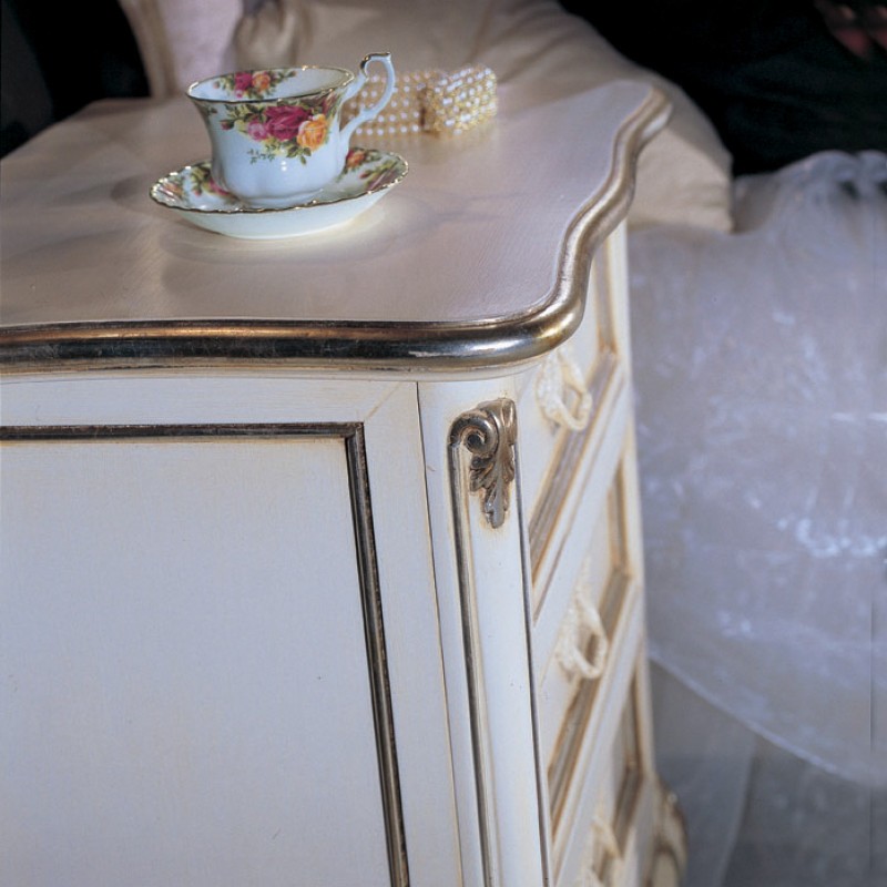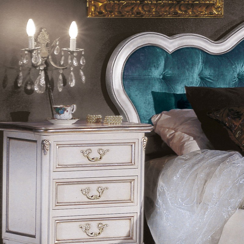 Comodino shabby costruito in legno con angoli smussati e gambe a sciabola. Dotato di 3 cassetti per riporre all'occorrenza biancheria intima e oggetti. Trova facilmente posto in camera o zona giorno proteggendo con i suoi cassetti il suo contenuto all'interno. Unico nel suo genere con la sua particolare laccatura invecchiata creando un bellissimo contrasto con la foglia argento, dando un tocco a un' atmosfera dallo stile romantico.