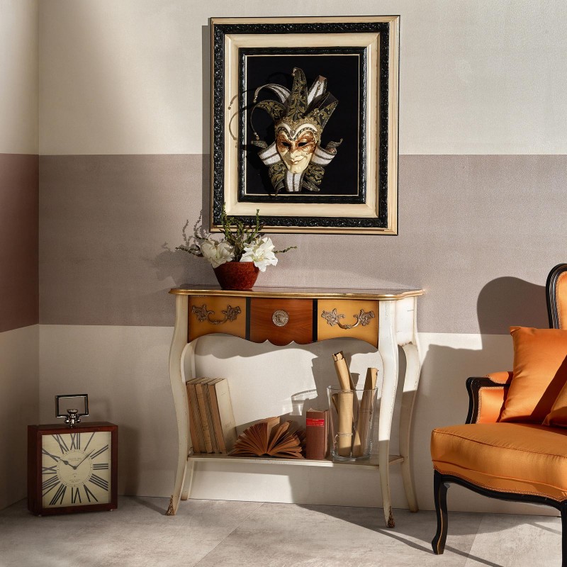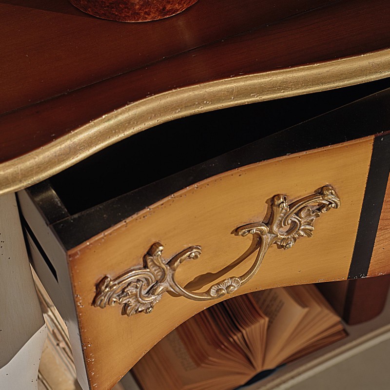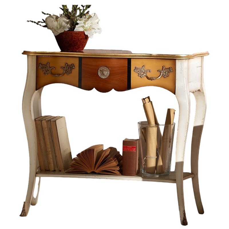Finitura consolle: Struttura laccato bianco invecchiato con piano e cassetto frontale tinta noce ,esterno del frontale del cassetto noce biondo e bordo piano in foglia oro.