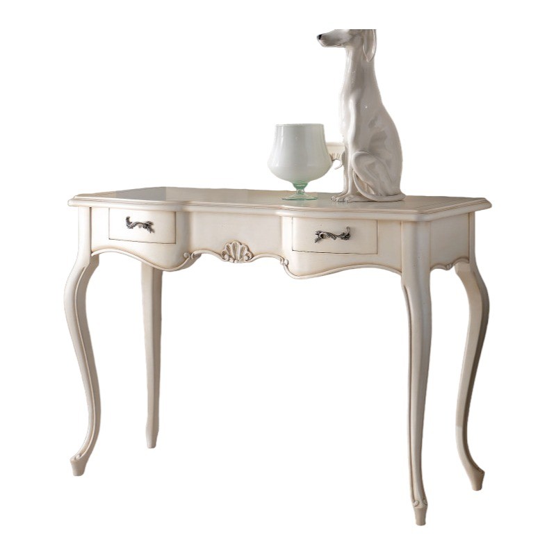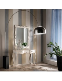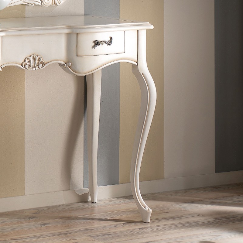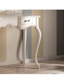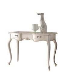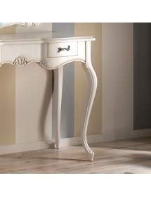 Consolle con due cassetti intagliata con gambe a sciabola e con incisioni sulle gambe, costruita in legno con struttura sagomata dando un tocco di eleganza con la lavorazione a forma di conchiglia. Ideale per la zona giorno o come mobile per l' entrata creando un'atmosfera dallo stile shabby chic.