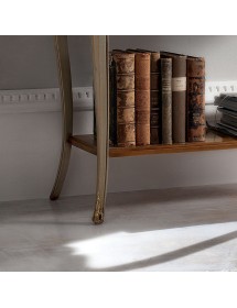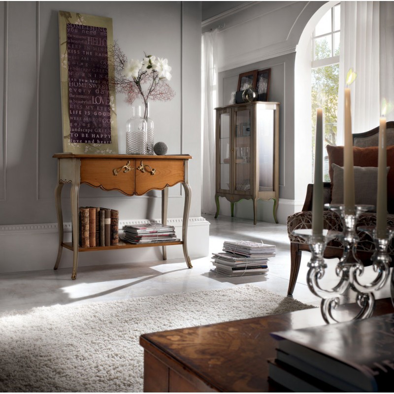Consolle classica con un due ante arricchite da fregi in metallo applicati alla base delle gambe, costruito in legno con gambe arcuate intagliate, un ripiano per appoggiare libri e oggetti. Ideale per la zona giorno o come mobile per l' entrata.