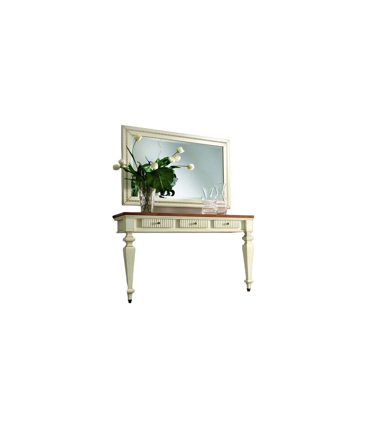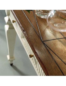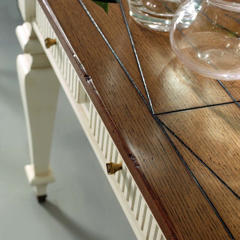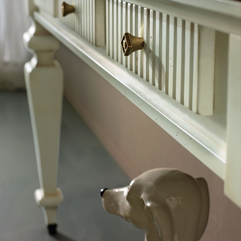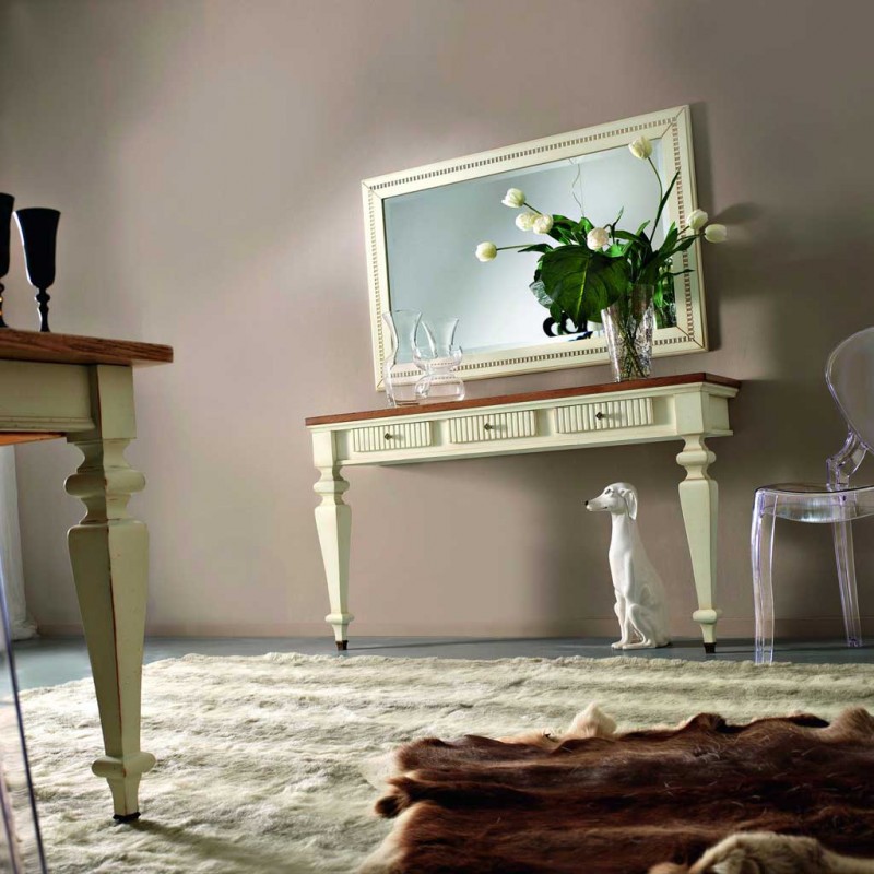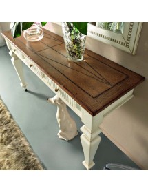 Consolle a muro classica con 3 cassetti con incisioni zigrinate, fianchi riquadrati e fregi in metallo applicati alla base delle gambe, mentre la parte posteriore appoggia direttamente sulla parete del muro, costruito in legno con gambe tornite e piano finemente inciso e spazioso ideale per appoggiare libri e oggetti. Ideale per la zona giorno o come mobile per l' entrata.