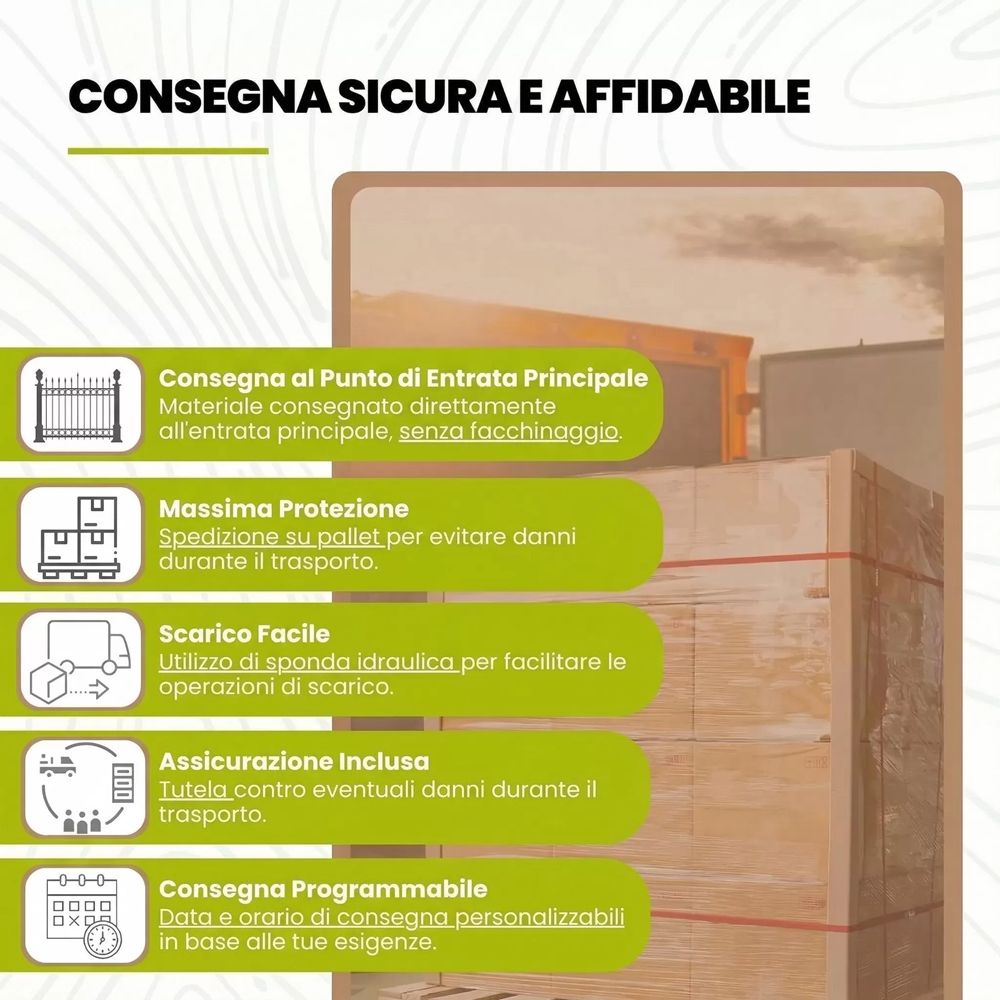 - Consegna al punto di entrata principaleMateriale consegnato direttamente all'entrata principale, senza facchinaggio.