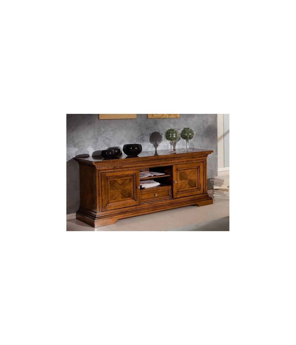 1 PORTA TV IN LEGNO 2 ANTE SCORREVOLI INTARSIO A CROCE 1 CASSETTO CENTRALE L.169 P.53 H.75