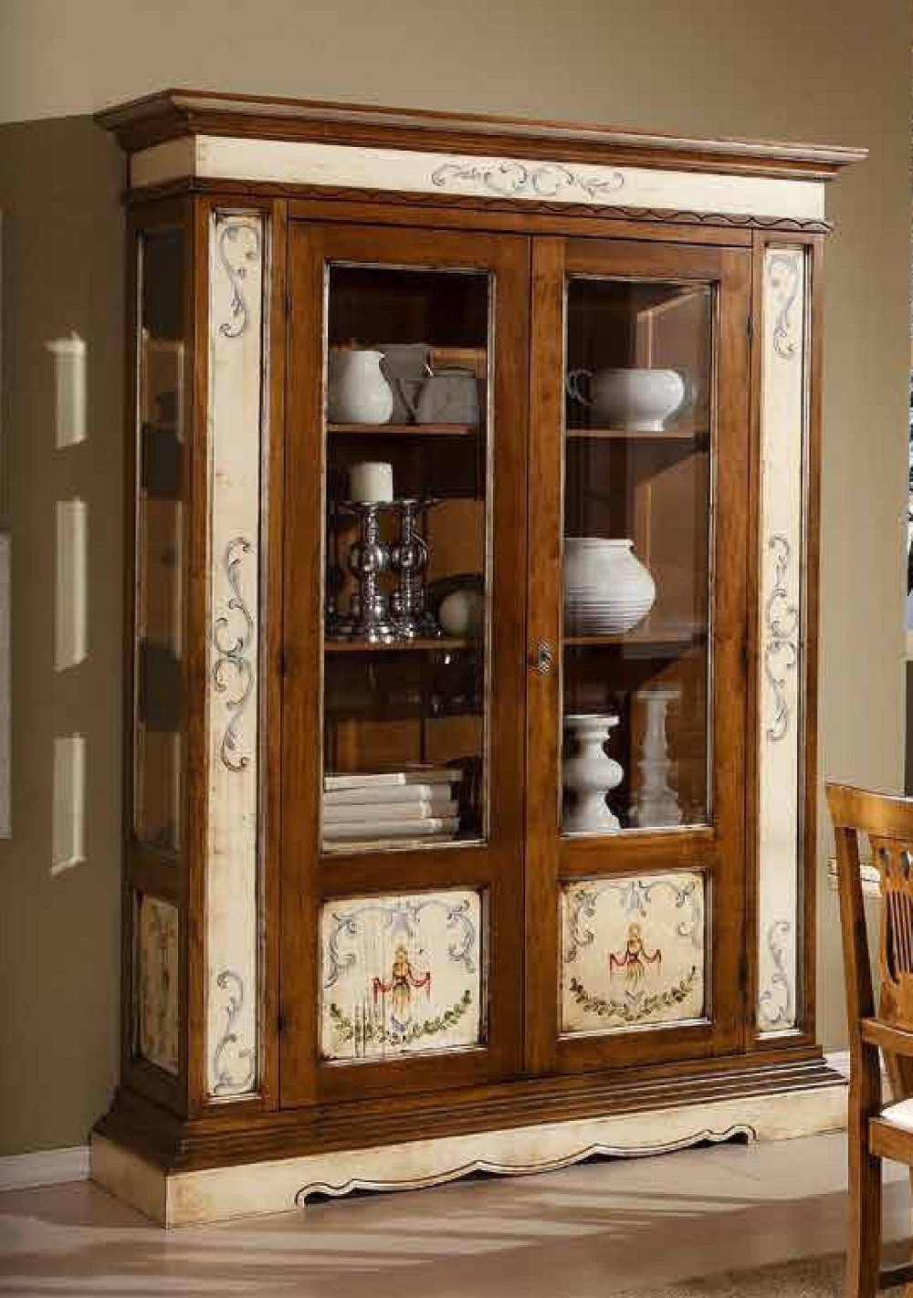 FINITURA : I MOBILI VENGONO LACCATI DI BIANCO PATINATO E TINTA NOCE , TERRE E DECORI DIPINTI A MANO .