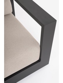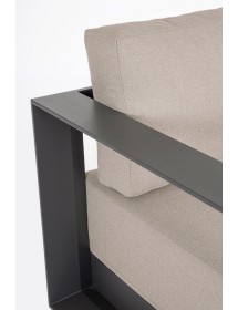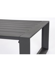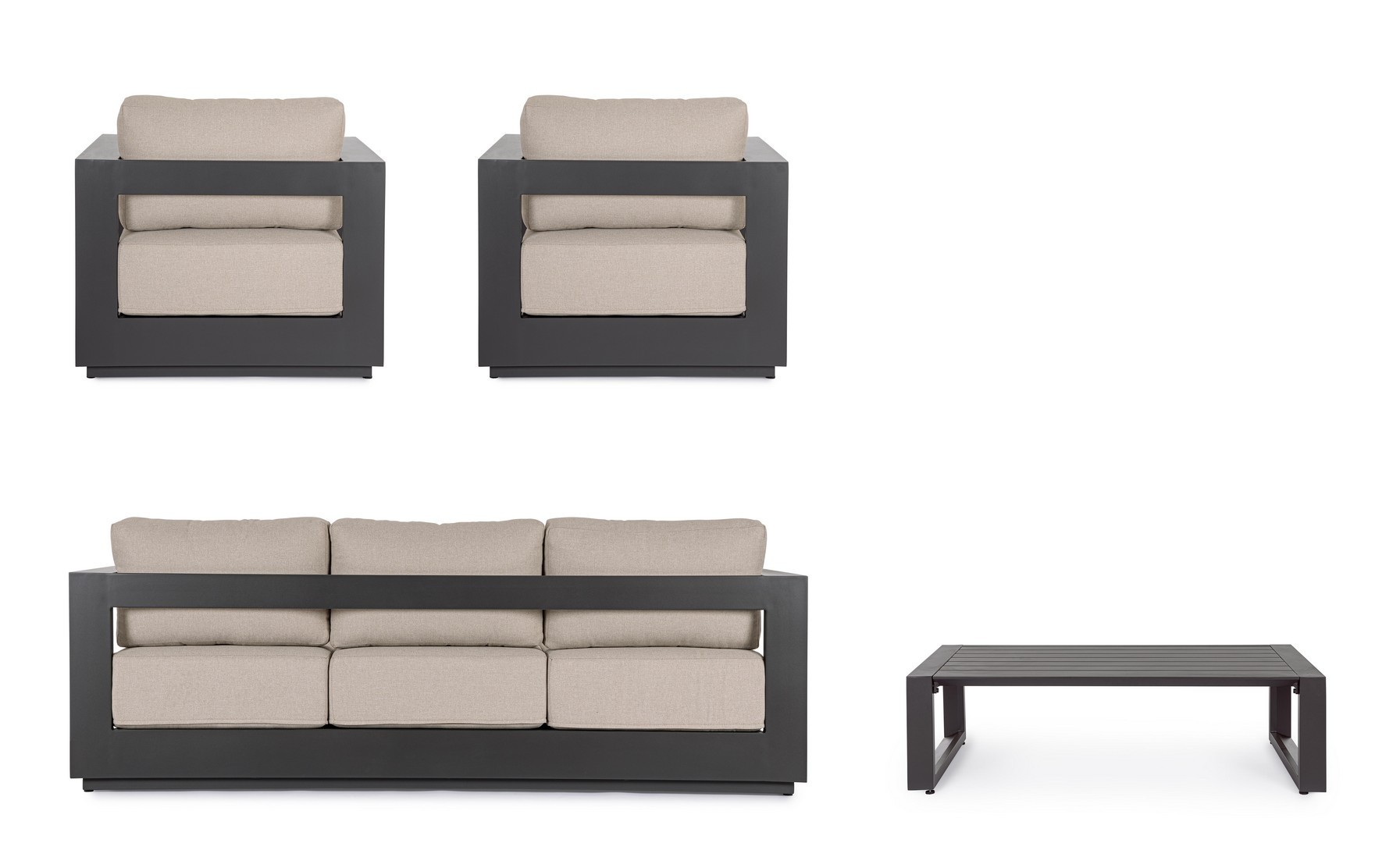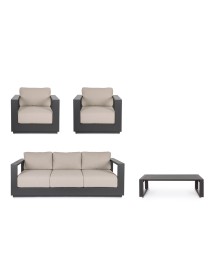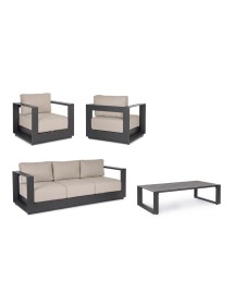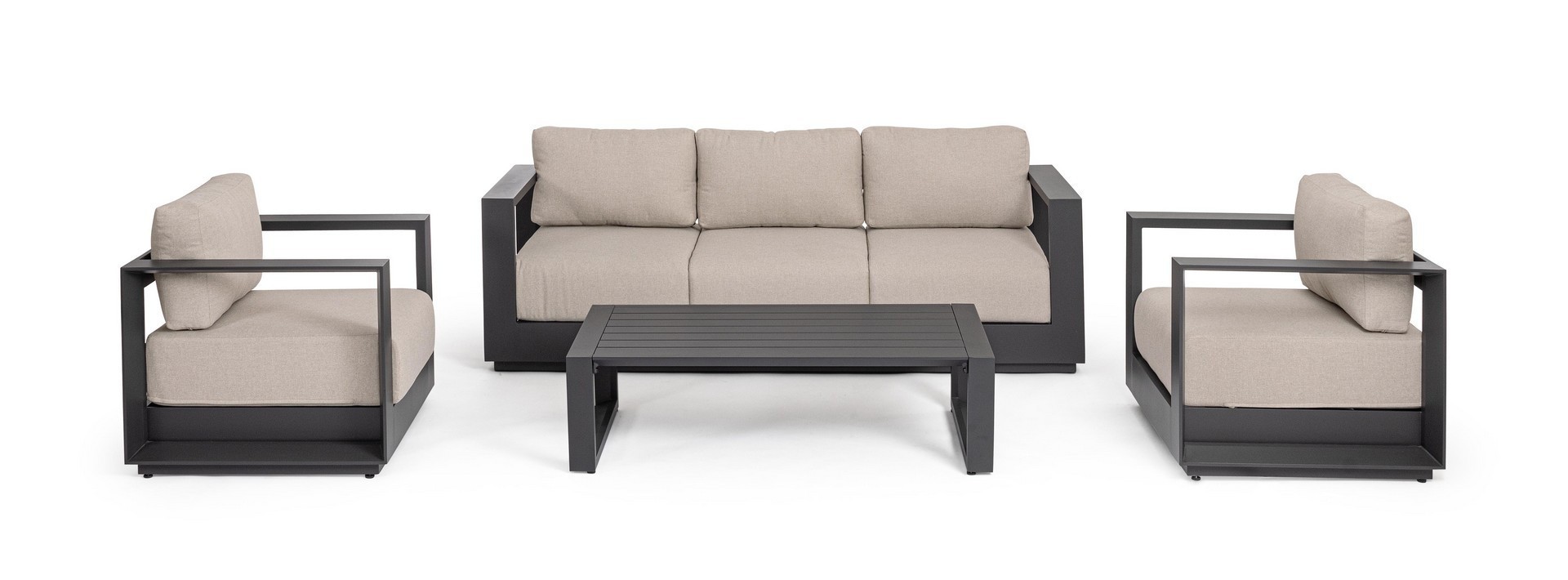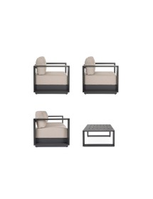 STRUTTURA IN ALLUMINIO VERNICIATO A POLVERE (POLIESTERE). CUSCINI SEDUTA E SCHIENALE SFODERABILI CON TESSUTO IDROREPELLENTE OLEFIN (100% POLIPROPILENE). PIEDINI REGOLABILI. GAMBE TAVOLINO (VITERIA IN ACCIAIO INOSSIDABILE) DA ASSEMBLARE.
