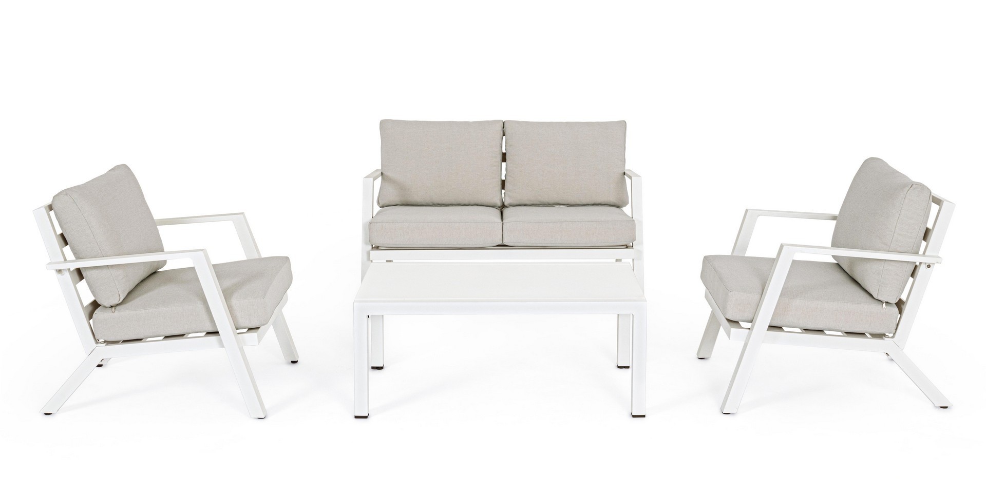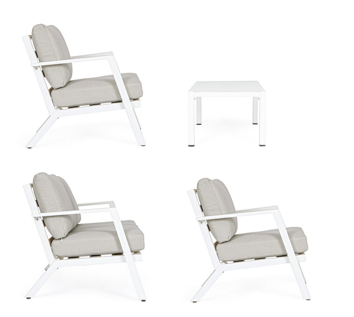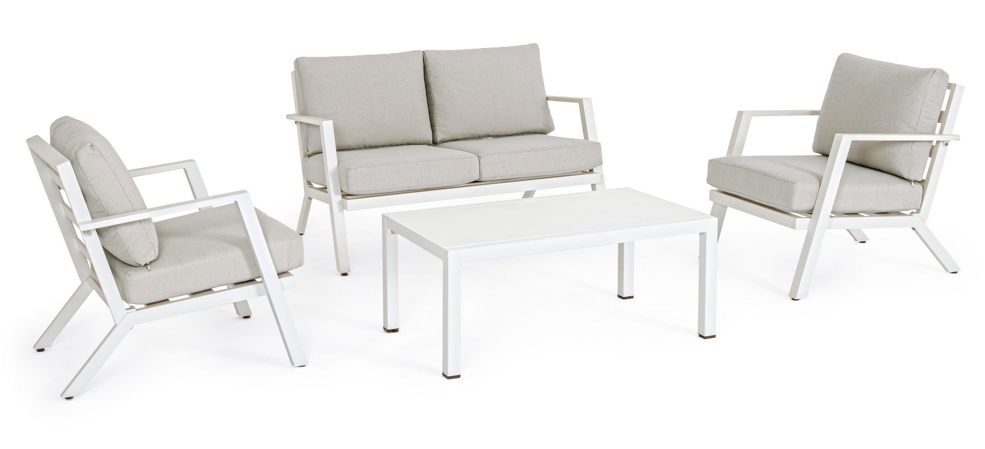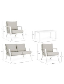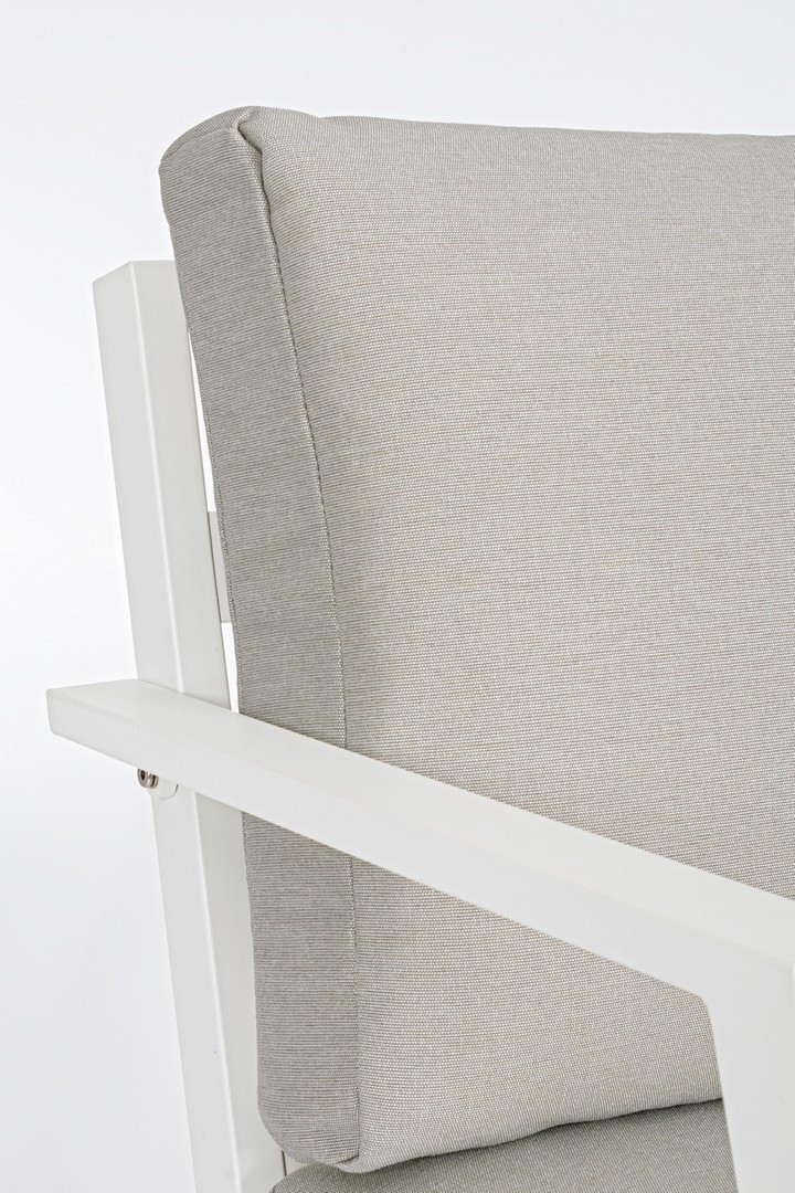 ALLUMINIO VERNICIATO A POLVERE (POLIESTERE). CUSCINI SEDUTA E SCHIENALE SFODERABILI CON TESSUTO IDROREPELLENTE OLEFIN (100% POLIPROPILENE). PIEDINI REGOLABILI. VITERIA IN ACCIAIO INOSSIDABILE. DA ASSEMBLARE.