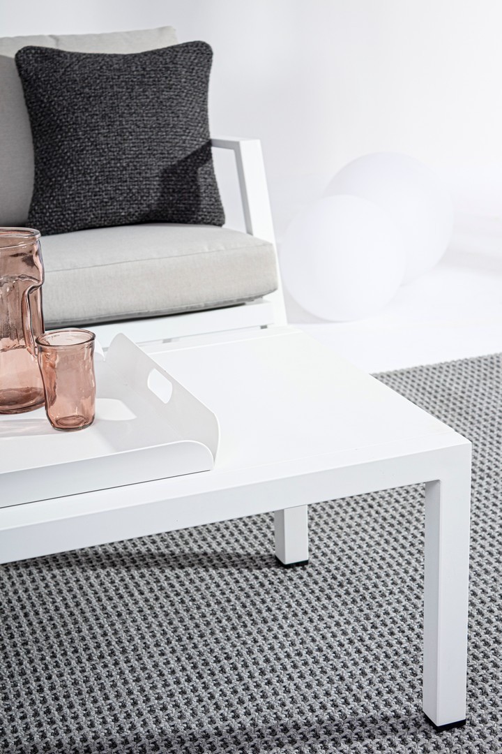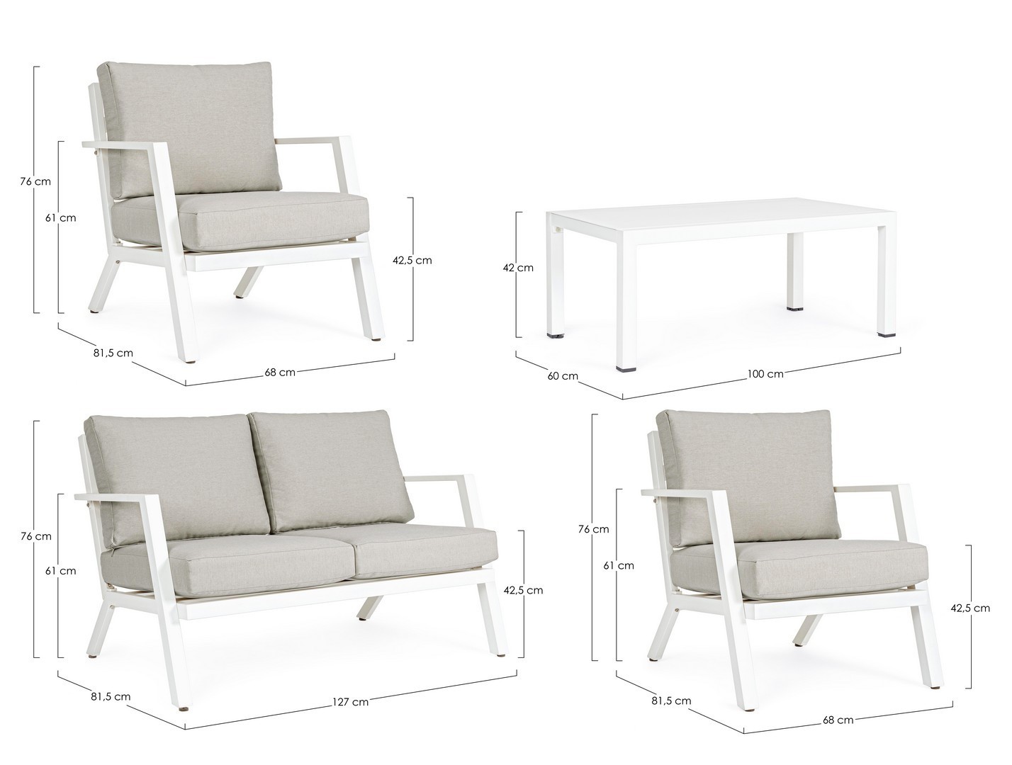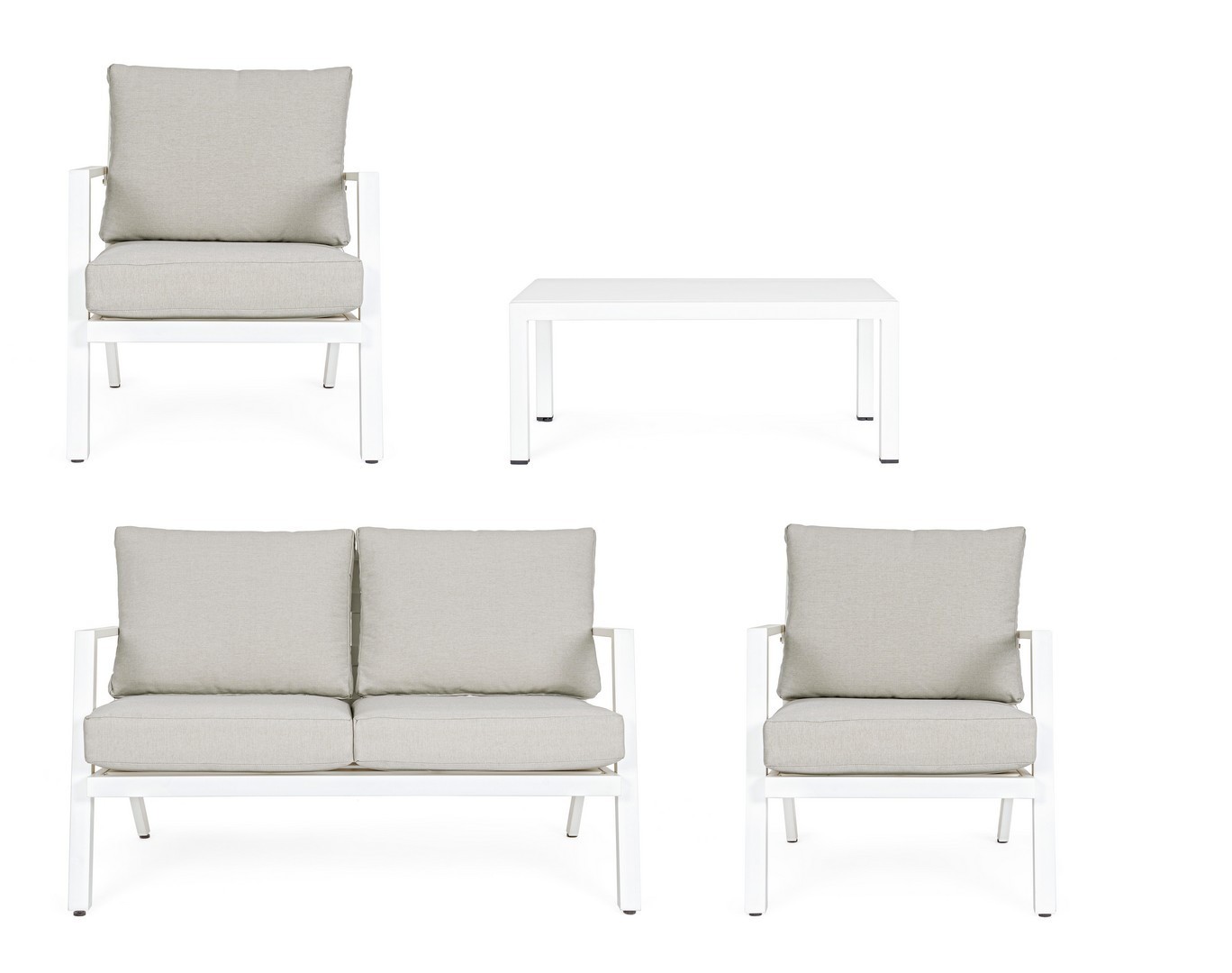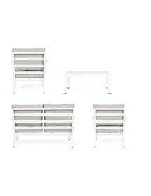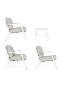 ALLUMINIO VERNICIATO A POLVERE (POLIESTERE). CUSCINI SEDUTA E SCHIENALE SFODERABILI CON TESSUTO IDROREPELLENTE OLEFIN (100% POLIPROPILENE). PIEDINI REGOLABILI. VITERIA IN ACCIAIO INOSSIDABILE. DA ASSEMBLARE.