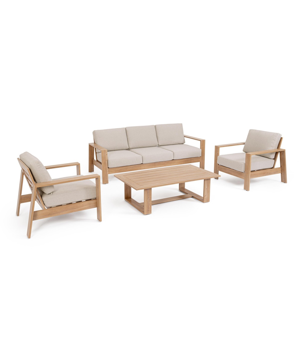 ALLUMINIO VERNICIATO A POLVERE (POLIESTERE) EFFETTO LEGNO. CUSCINI SEDUTA E SCHIENALE SFODERABILI CON TESSUTO IDROREPELLENTE OLEFIN (100% POLIPROPILENE). PIEDINI REGOLABILI. VITERIA IN ACCIAIO INOSSIDABILE. DA ASSEMBLARE.