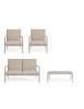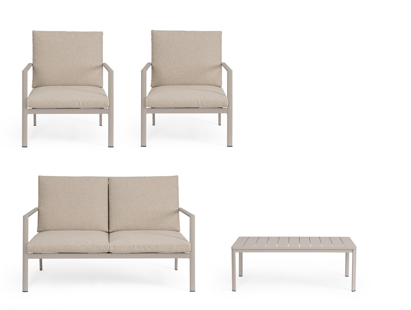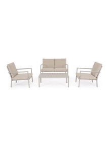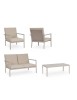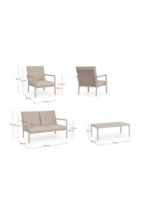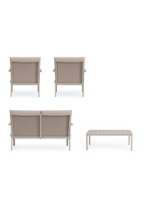 STRUTTURA IN ALLUMINIO, VERNICIATO A POLVERE (POLIESTERE). SEDUTA E SCHIENALE IN TEXTILENE 1X1. CUSCINI SFODERABILI CON TESSUTO IDROREPELLENTE OLEFIN (100% POLIPROPILENE). VITERIA IN ACCIAIO INOSSIDABILE. SCHIENALI E GAMBE TAVOLINO DA ASSEMBLARE.