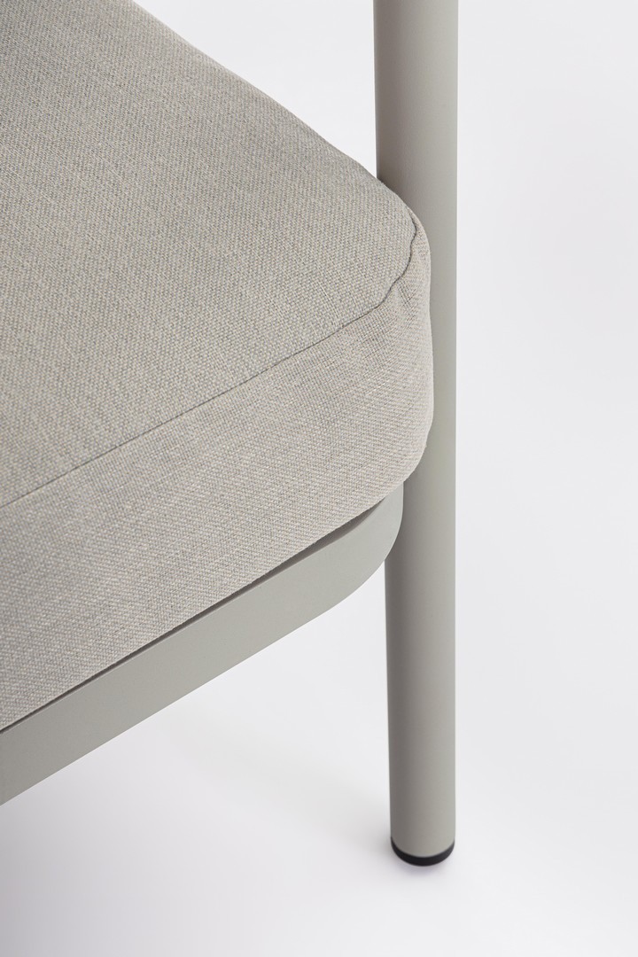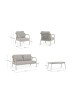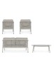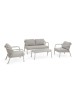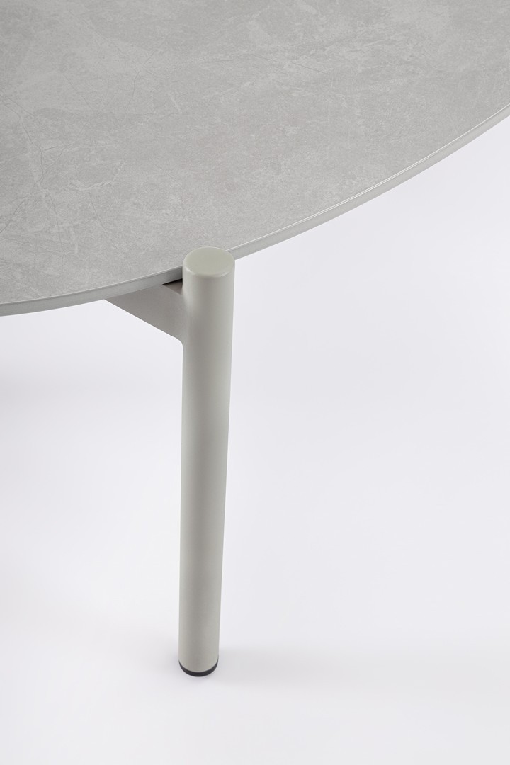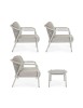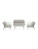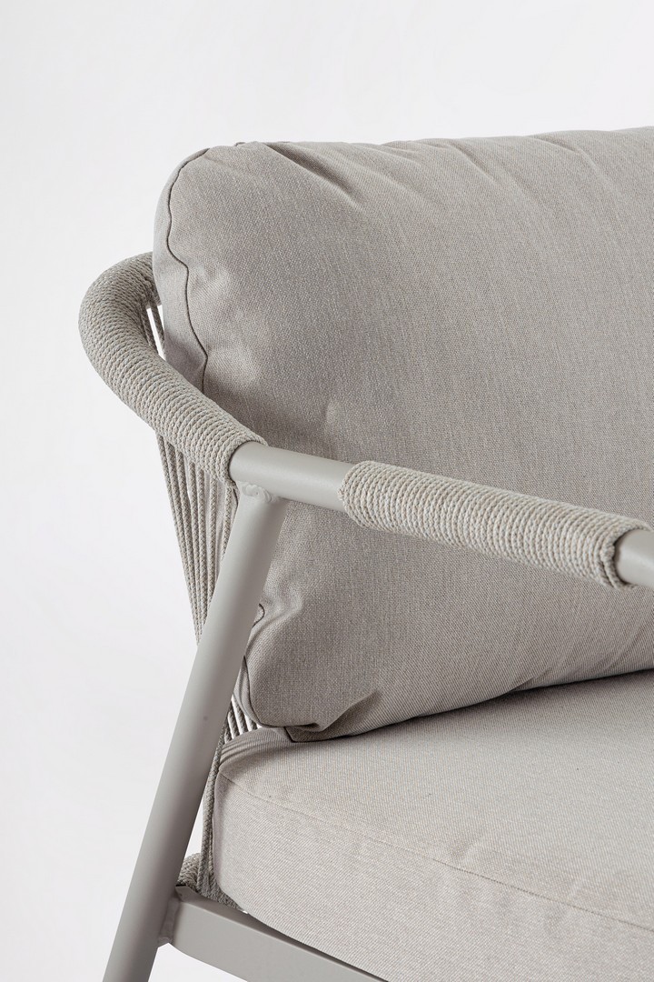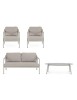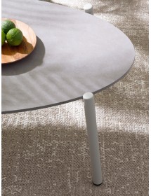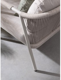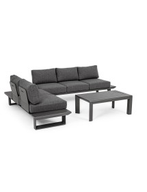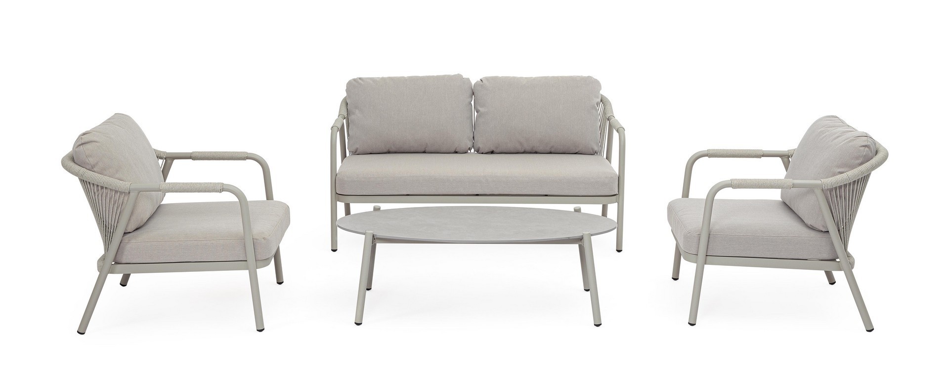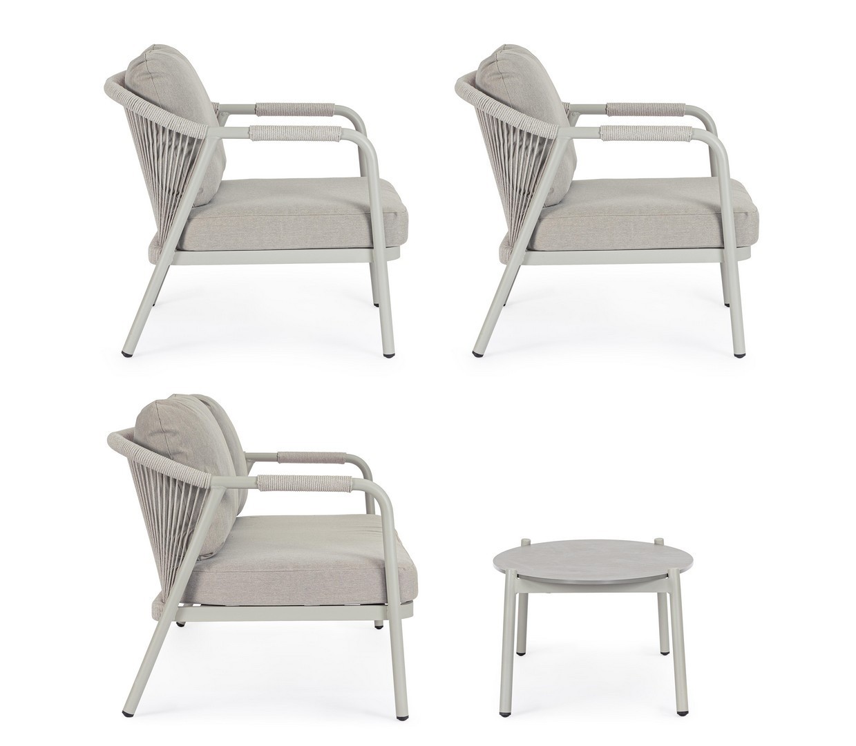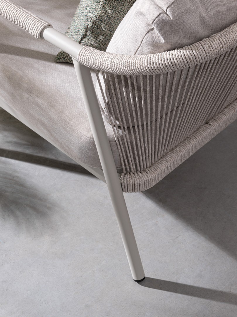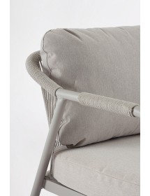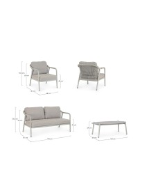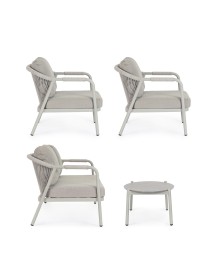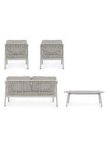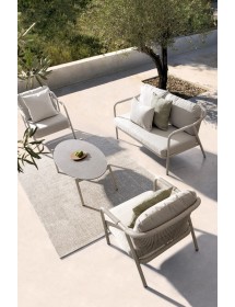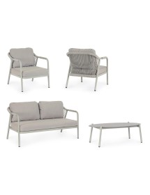 STRUTTURA IN ALLUMINIO VERNICIATA A POLVERE (POLIESTERE). INTRECCIO PER ESTERNO IN CORDA POLIESTERE. PIANO IN PIETRA SINTERIZZATA (PIETRA NATURALE LAVORATA AD ELEVATE TEMPERATURE)(SPESSORE 11MM). CUSCINI SFODERABILI IN TESSUTO IDROREPELLENTE 100% POLIESTERE. VITERIA IN ACCIAIO INOSSIDABILE. TAVOLINO DA ASSEMBLARE.