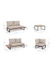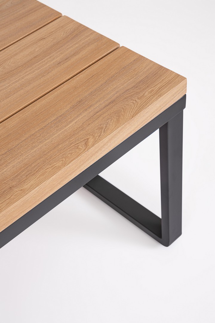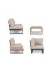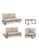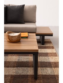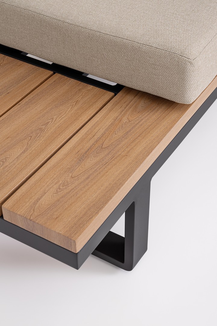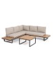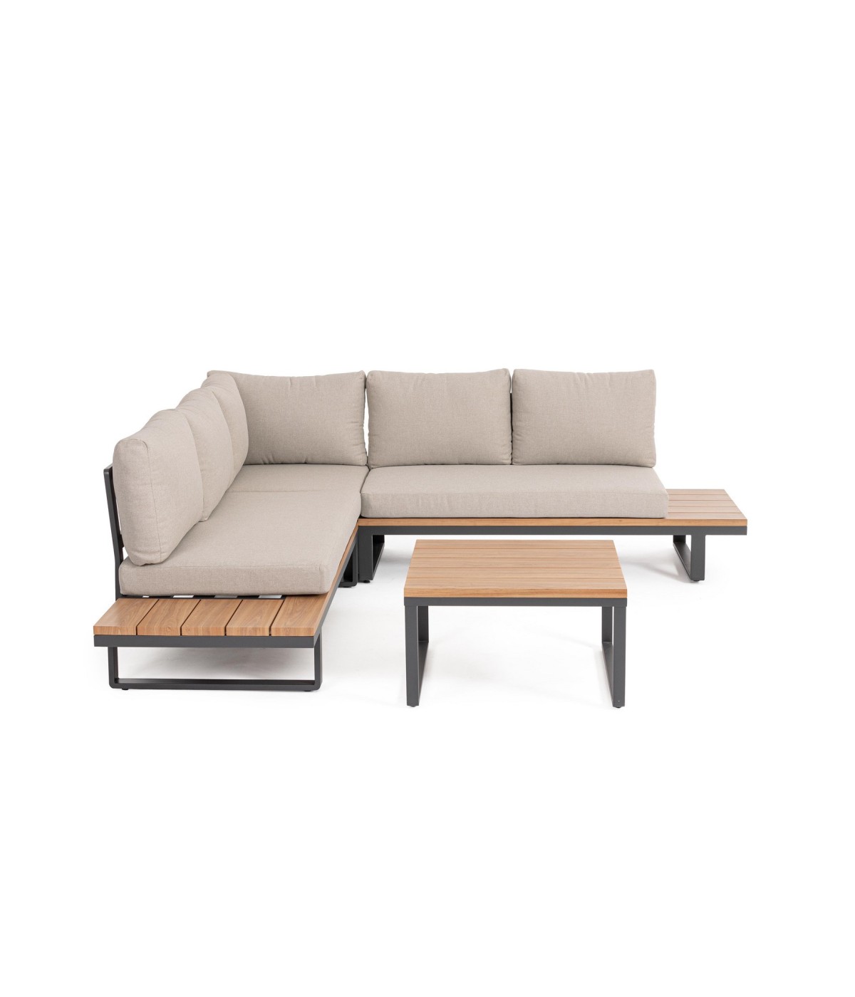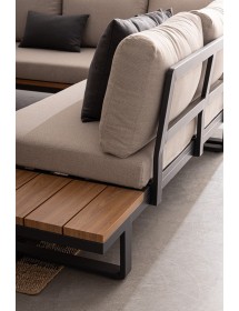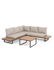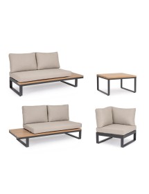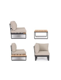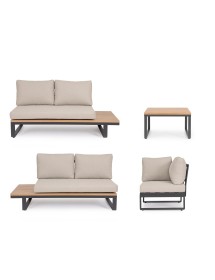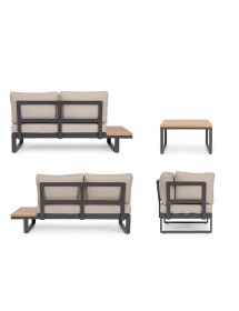 STRUTTURA IN ALLUMINIO VERNICIATO A POLVERE (POLIESTERE). LATERALI DIVANO E PIANO TAVOLINO IN ALLUMINIO CON VERNICIATURA EFFETTO LEGNO. CUSCINI SEDUTA E SCHIENALE SFODERABILI CON TESSUTO IDROREPELLENTE OLEFIN (100% POLIPROPILENE). VITERIA IN ACCIAIO INOSSIDABILE. PIEDINI REGOLABILI. DA ASSEMBLARE.