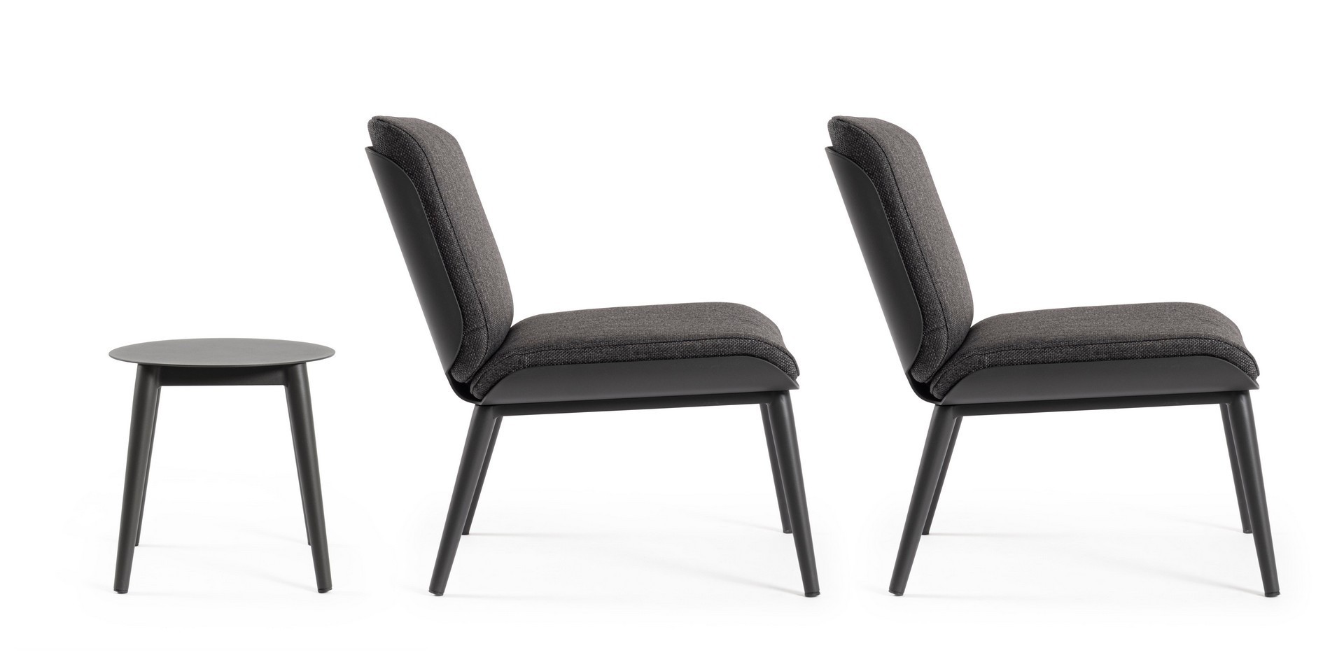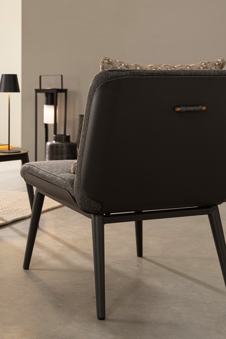 STRUTTURA IN ALLUMINIO VERNICIATO A POLVERE (POLIESTERE). CUSCINI SEDUTA E SCHIENALE SFODERABILI IN TESSUTO OLEFIN (100% POLIPROPILENE). FERMA CUSCINO SCHIENALE CON DETTAGLIO IN TEAK. VITERIA IN ACCIAIO INOSSIDABILE. GAMBE SEDIE DA ASSEMBLARE.