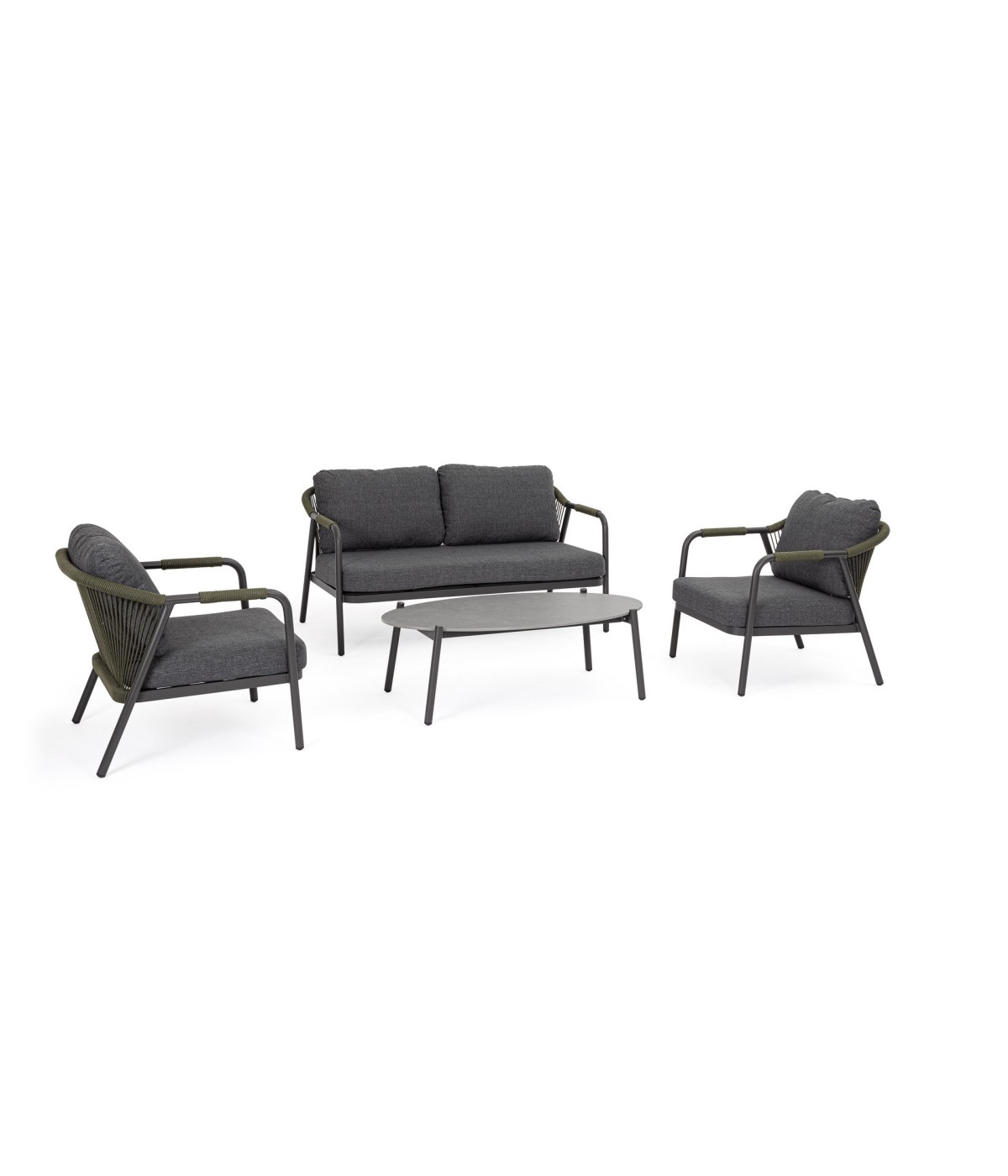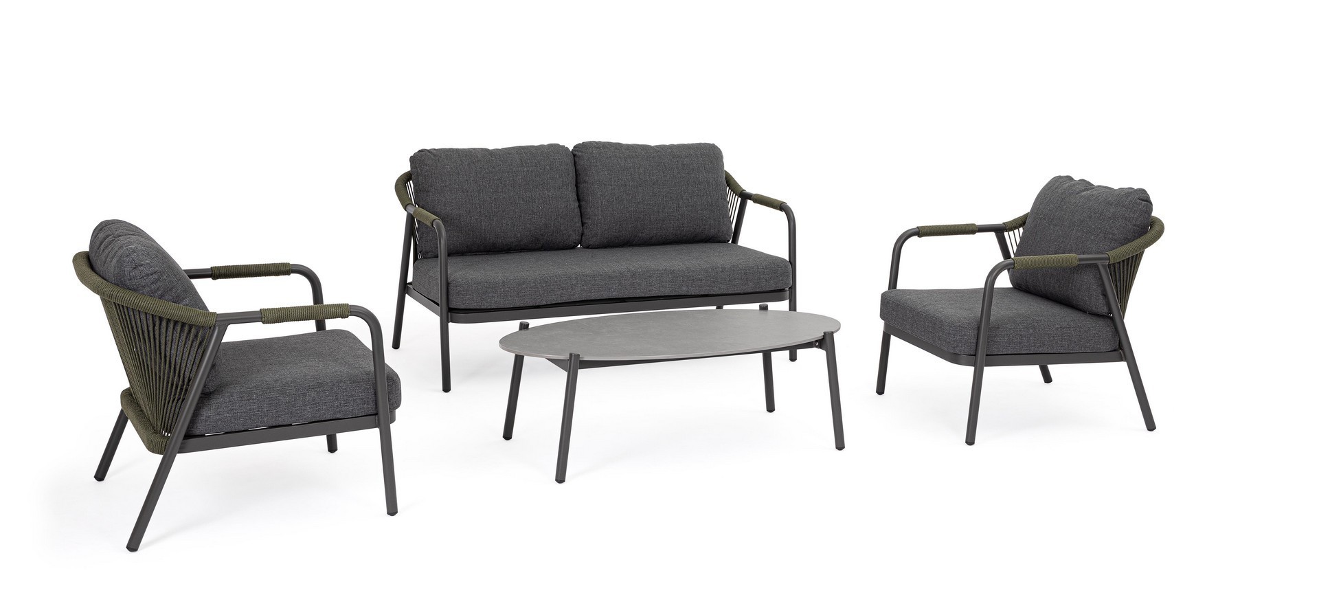 STRUTTURA IN ALLUMINIO VERNICIATA A POLVERE (POLIESTERE). INTRECCIO PER ESTERNO IN CORDA OLEFIN (POLIPROPILENE). PIANO IN PIETRA SINTERIZZATA (PIETRA NATURALE LAVORATA AD ELEVATE TEMPERATURE)(SPESSORE 11MM). CUSCINI SFODERABILI IN TESSUTO IDROREPELLENTE 100% POLIPROPILENE. VITERIA IN ACCIAIO INOSSIDABILE. TAVOLINO DA ASSEMBLARE.