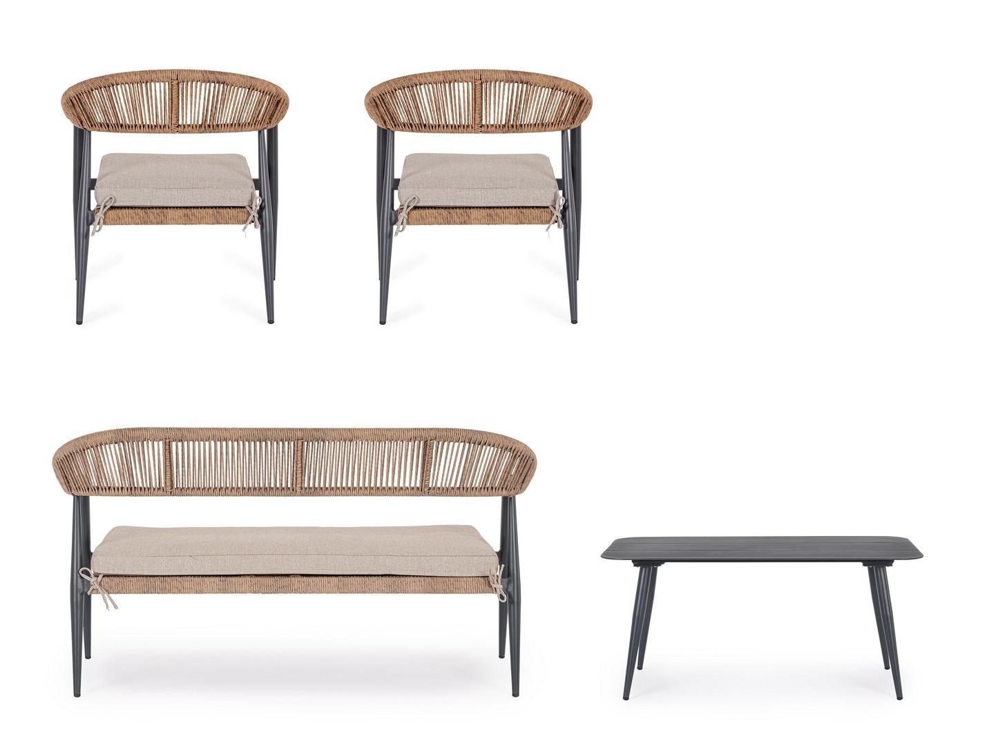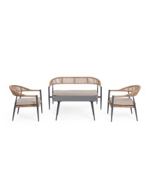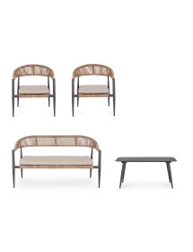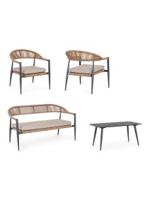 STRUTTURA IN ALLUMINIO, VERNICIATA A POLVERE (POLIESTERE), INTRECCIO IN FIBRA SINTETICA (TWISTED). CUSCINO CON TESSUTO SFODERABILE IDROREPELLENTE IN POLIESTERE. GAMBE TAVOLINO DA ASSEMBLARE.