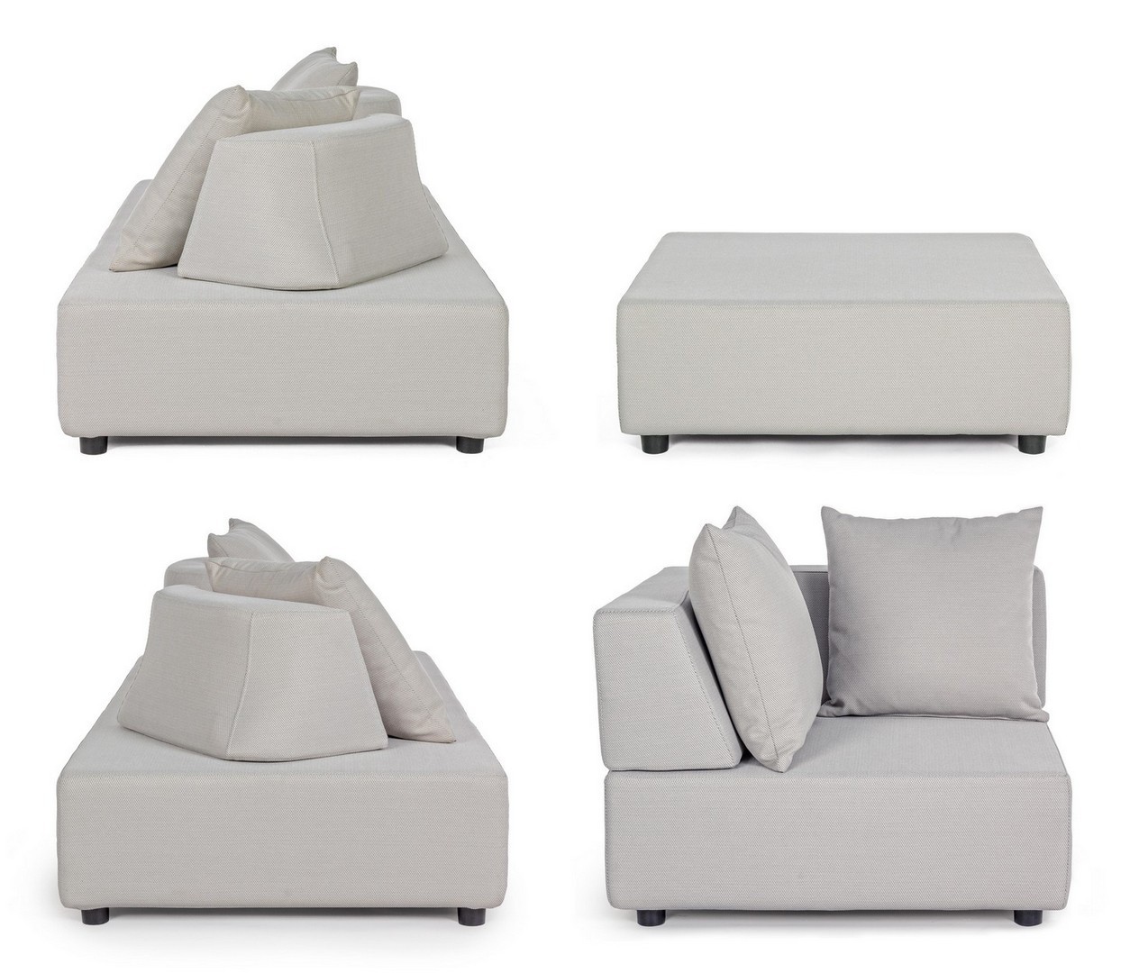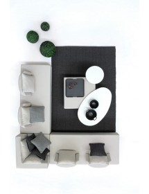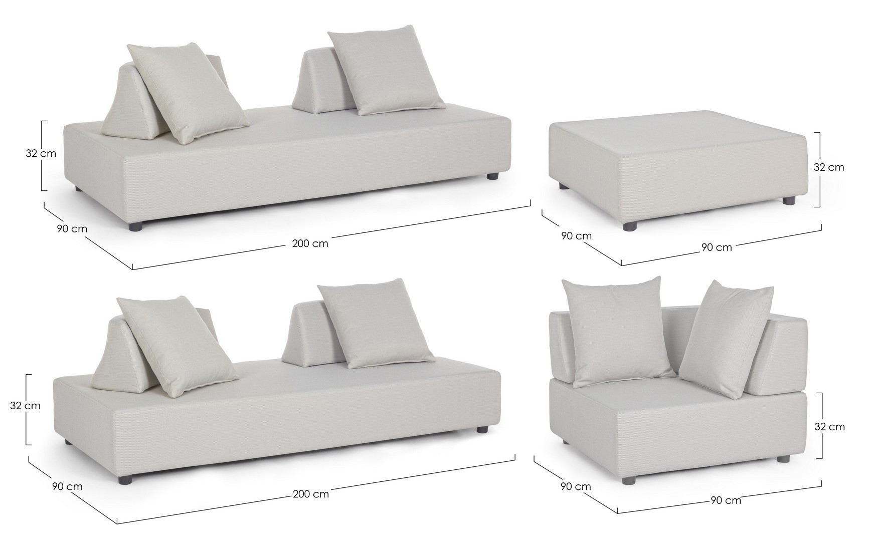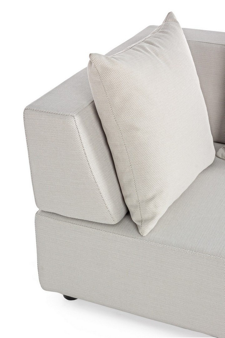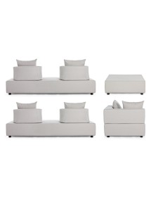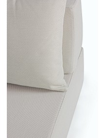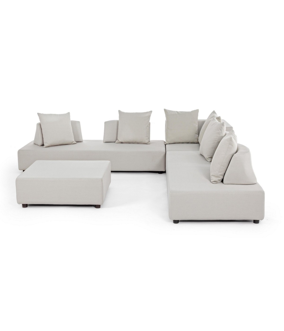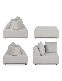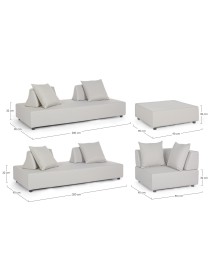 DIVANI E OTTOMAN CON STRUTTURA IN ALLUMINIO. SCHIENALI REMOVIBILI CON STRUTTURA IN ACCIAIO, GALVANIZZATA A CALDO E VERNICIATA A POLVERE (POLIESTERE). SEDUTE, SCHIENALI E CUSCINI SFODERABILI IN TESSUTO PER ESTERNO IN OLEFIN (100% POLIPROPILENE, 285G/M2), IDROREPELLENTE E RESISTENTE AI RAGGI UV (GRADO 7), IMPERMEABILIZZATO INTERNAMENTE CON RIVESTIMENTO IN TESSUTO (POLIURETANO). IMBOTTITURA IN SCHIUMA POLIURETANICA, DENSITA' SEDUTA 38KG/M3, SCHIENALI 20KG/M3. ARTICOLO COMPOSTO DA: N°2 DIVANI, N°1 SEDUTA ANGOLARE, N°1 OTTOMAN,N°4 SCHIENALI MEZZALUNA, N°1 SCHIENALE ANGOLARE, N°6 CUSCINI. DIVANO ANGOLARE: 90a - 90b - 32h DIVANO: 200a - 90b - 32h OTTOMAN: 90a - 90b - 32h SCHIENALE MEZZALUNA: 69a - 36b - 32h SCHIENALE ANGOLARE: 90a - 90b - 32h