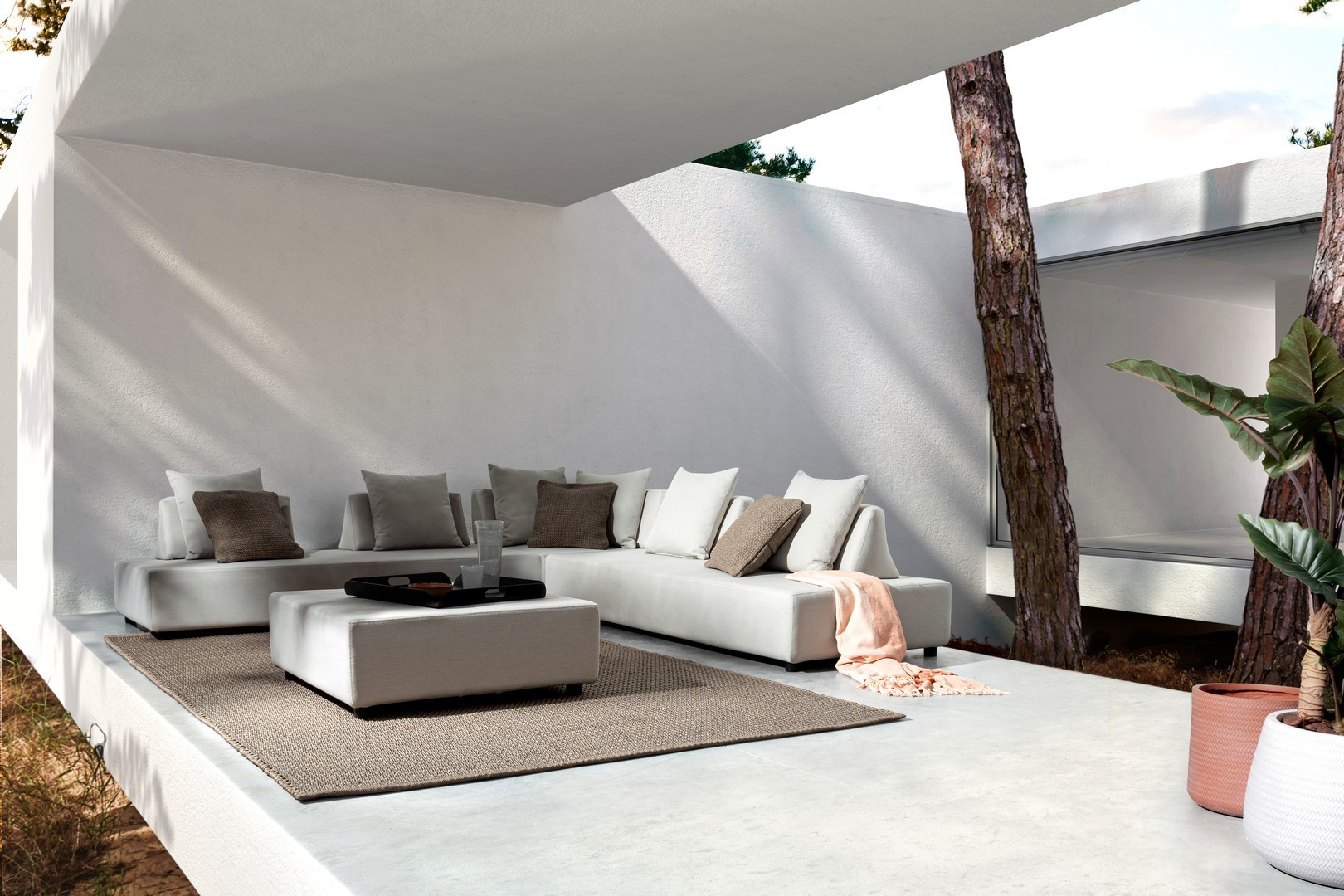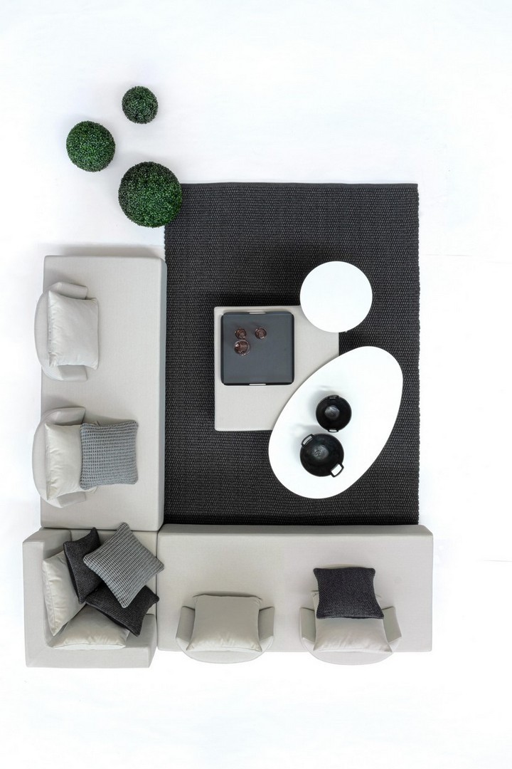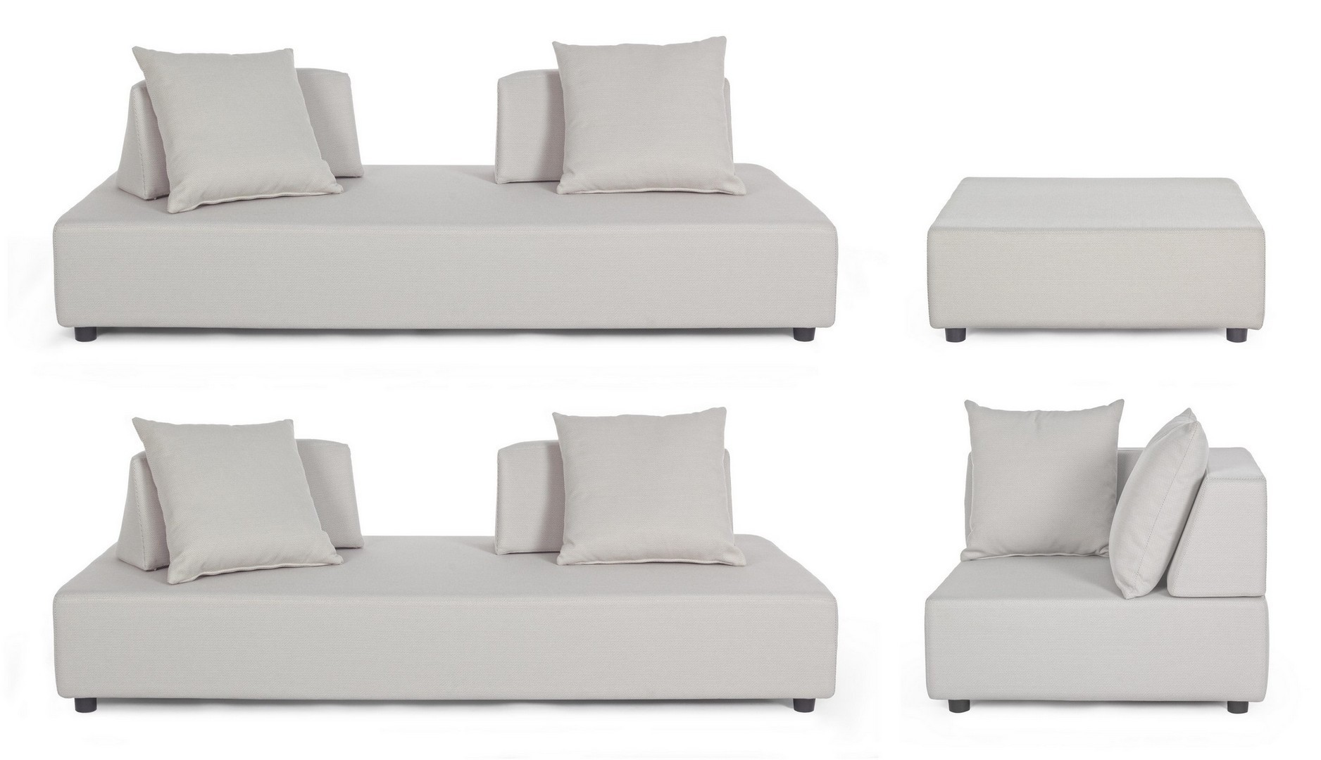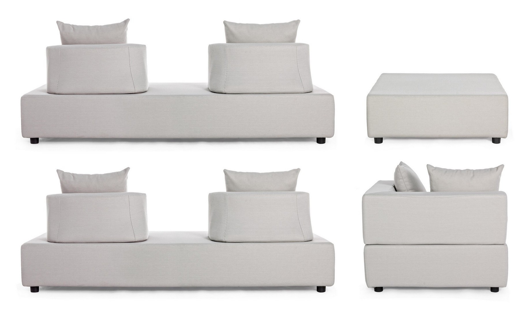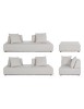 DIVANI E OTTOMAN CON STRUTTURA IN ALLUMINIO. SCHIENALI REMOVIBILI CON STRUTTURA IN ACCIAIO, GALVANIZZATA A CALDO E VERNICIATA A POLVERE (POLIESTERE). SEDUTE, SCHIENALI E CUSCINI SFODERABILI IN TESSUTO PER ESTERNO IN OLEFIN (100% POLIPROPILENE, 285G/M2), IDROREPELLENTE E RESISTENTE AI RAGGI UV (GRADO 7), IMPERMEABILIZZATO INTERNAMENTE CON RIVESTIMENTO IN TESSUTO (POLIURETANO). IMBOTTITURA IN SCHIUMA POLIURETANICA, DENSITA' SEDUTA 38KG/M3, SCHIENALI 20KG/M3. ARTICOLO COMPOSTO DA: N°2 DIVANI, N°1 SEDUTA ANGOLARE, N°1 OTTOMAN,N°4 SCHIENALI MEZZALUNA, N°1 SCHIENALE ANGOLARE, N°6 CUSCINI. DIVANO ANGOLARE: 90a - 90b - 32h DIVANO: 200a - 90b - 32h OTTOMAN: 90a - 90b - 32h SCHIENALE MEZZALUNA: 69a - 36b - 32h SCHIENALE ANGOLARE: 90a - 90b - 32h