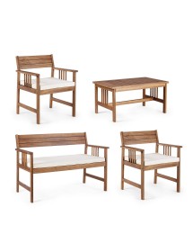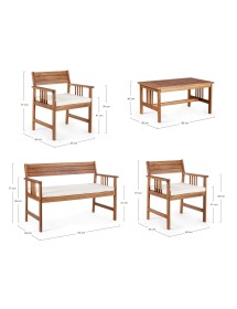 LEGNO DI ACACIA, FINITURA AD OLIO. VITERIA IN ACCIAIO GALVANIZZATO. RIVESTIMENTO CUSCINI IN POLIESTERE 230GR IDROREPELLENTE. SFODERABILI. SPESSORE CUSCINI: 4,5CM. DA ASSEMBLARE