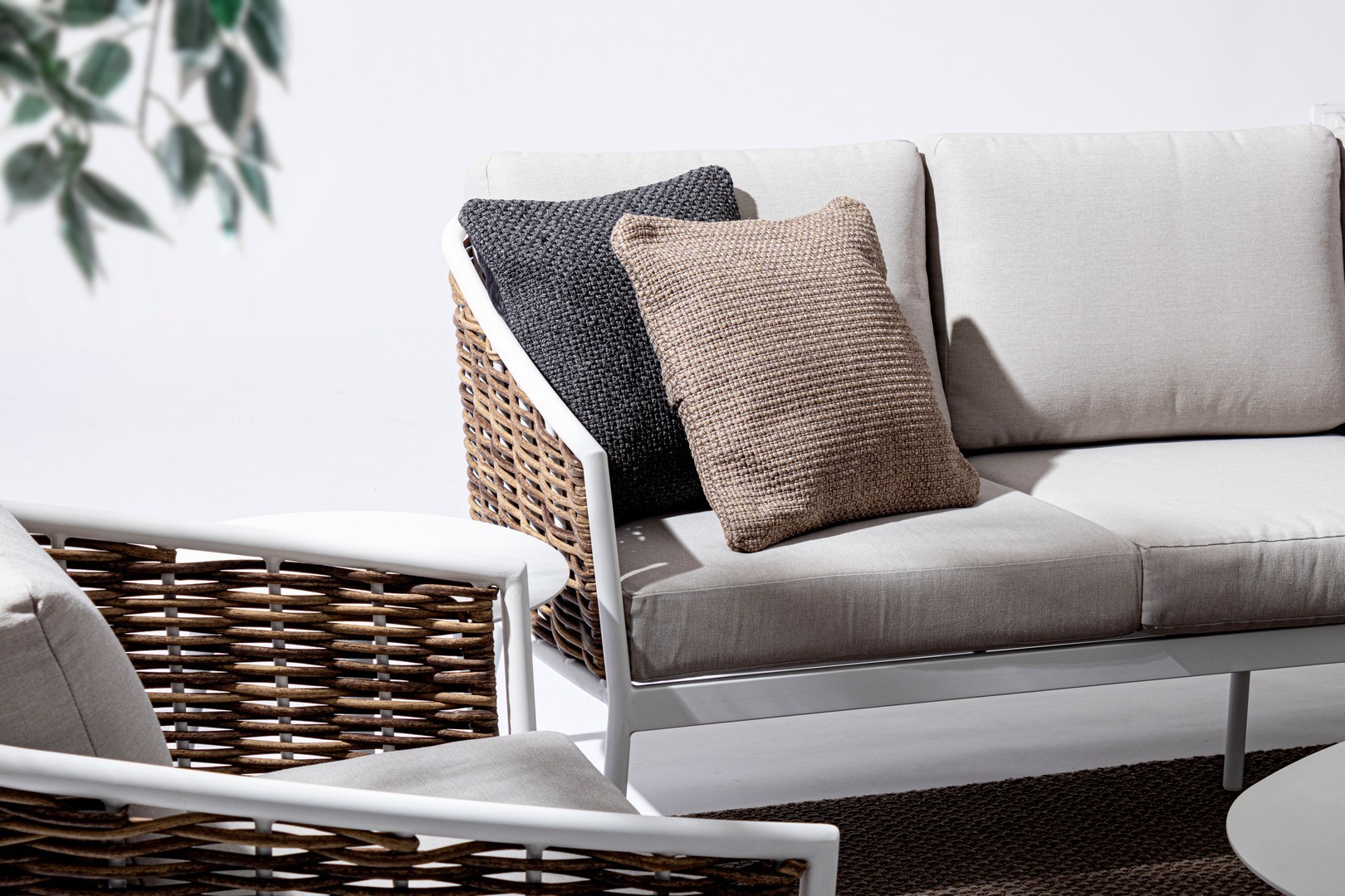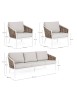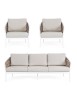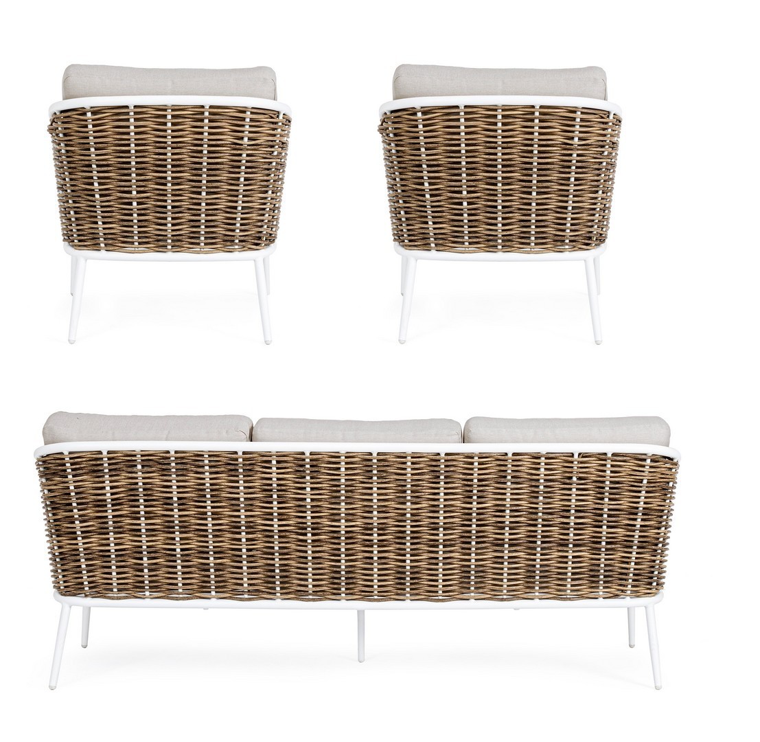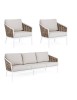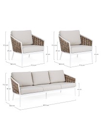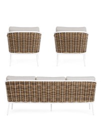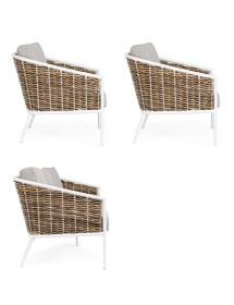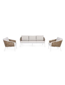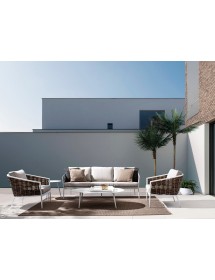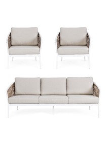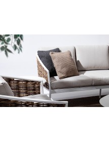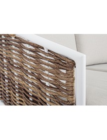 STRUTTURA IN ALLUMINIO VERNICIATA A POLVERE (POLIESTERE). INTRECCIO IN FIBRA SINTETICA (TONDA 9MM). CUSCINI SEDUTA E SCHIENALE SFODERABILI CON TESSUTO IDROREPELLENTE OLEFIN (100% POLIPROPILENE).