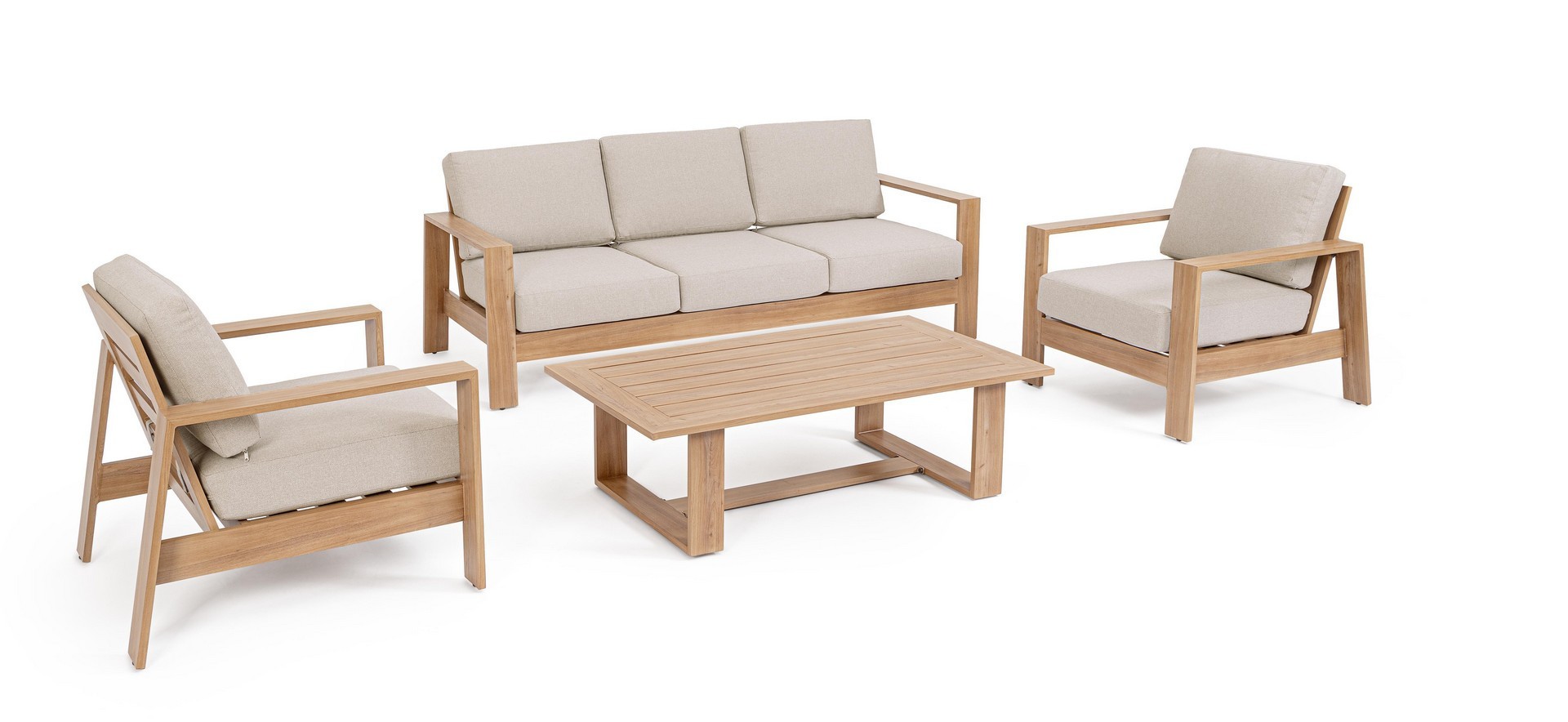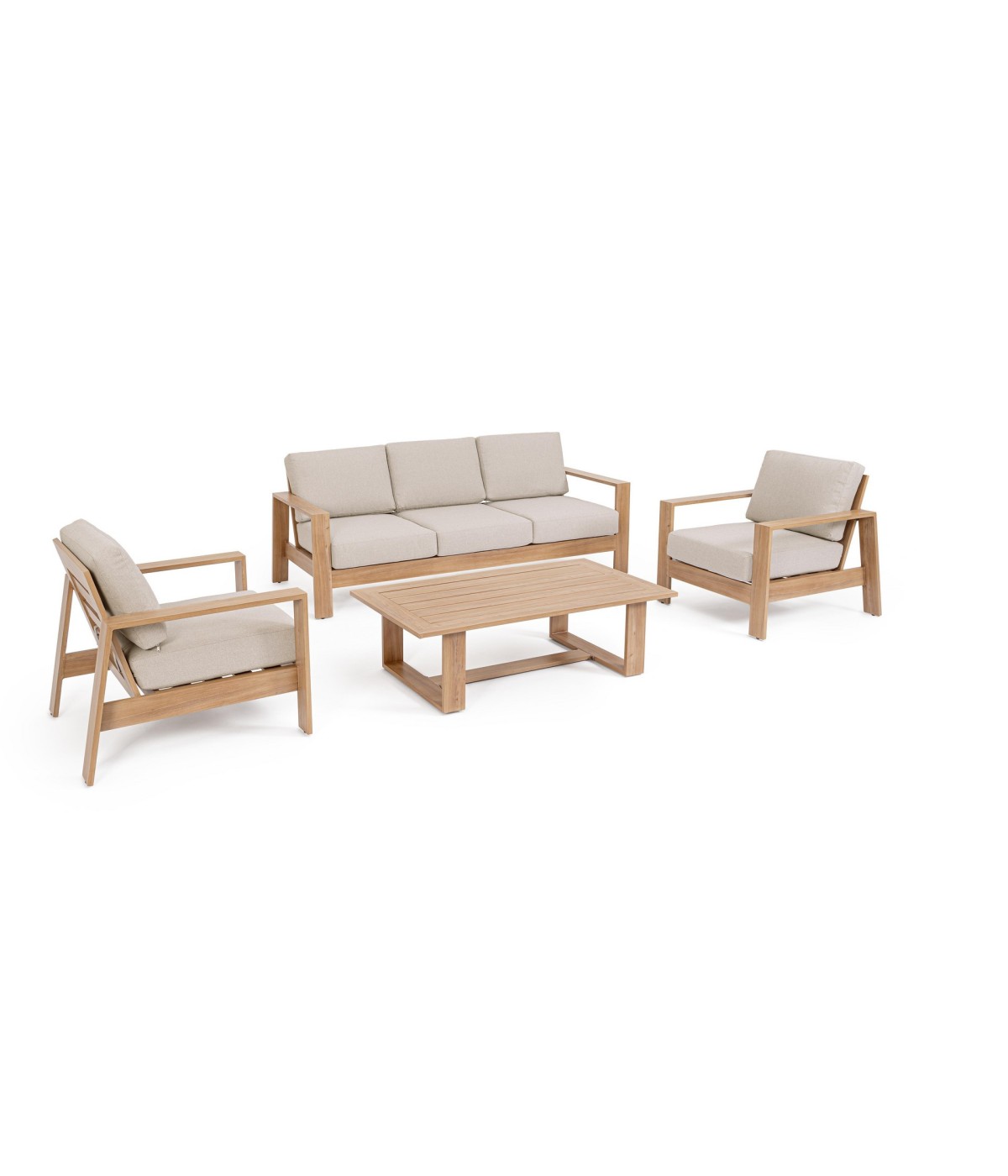 ALLUMINIO VERNICIATO A POLVERE (POLIESTERE) EFFETTO LEGNO. CUSCINI SEDUTA E SCHIENALE SFODERABILI CON TESSUTO IDROREPELLENTE OLEFIN (100% POLIPROPILENE). PIEDINI REGOLABILI. VITERIA IN ACCIAIO INOSSIDABILE. DA ASSEMBLARE.