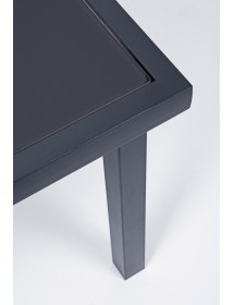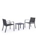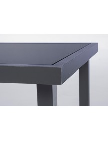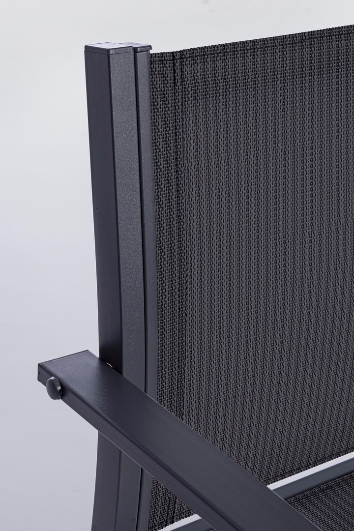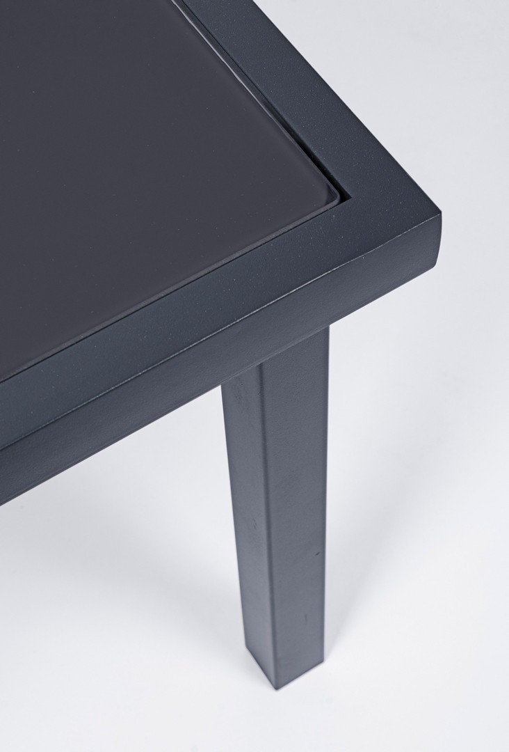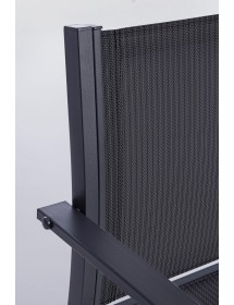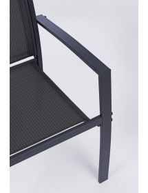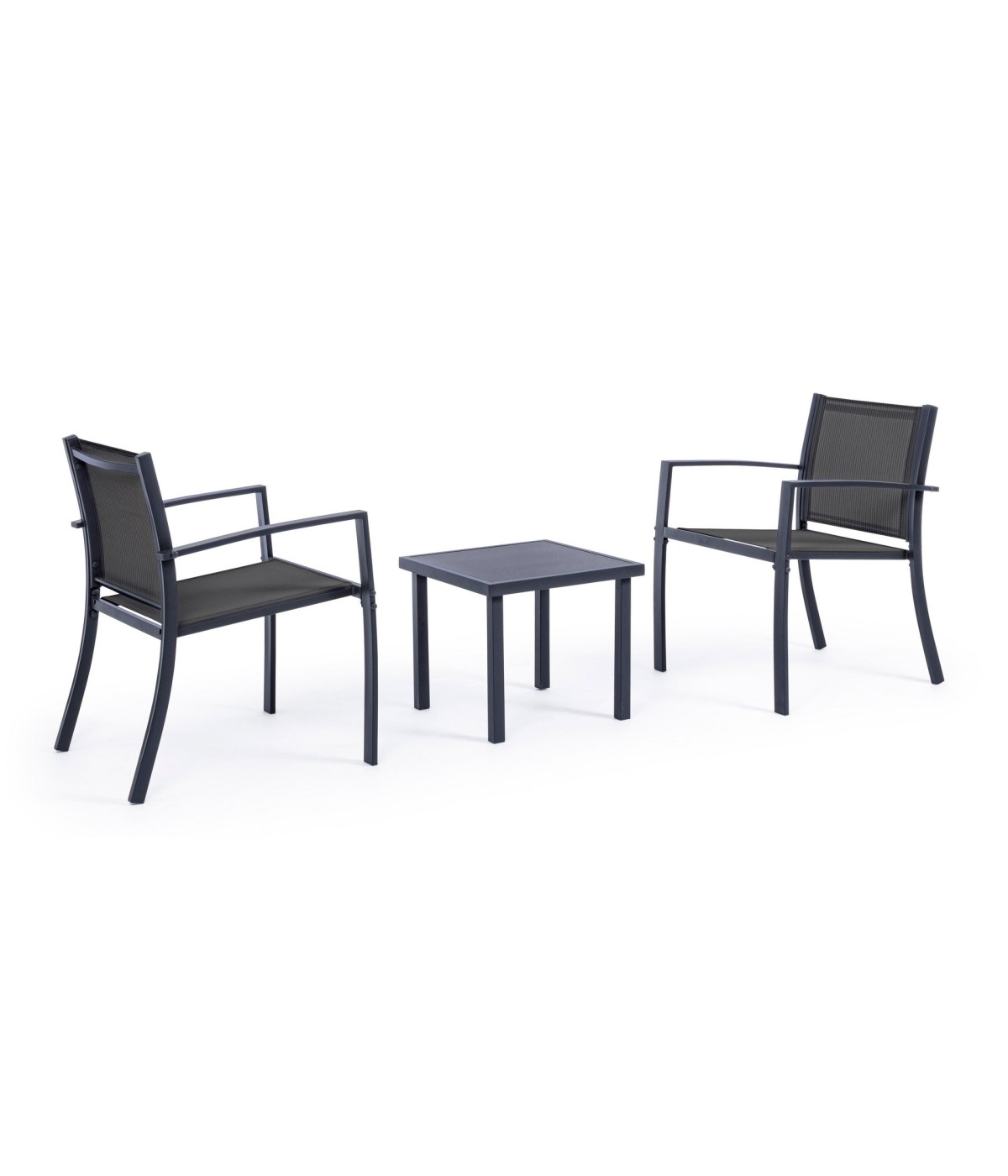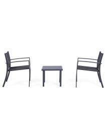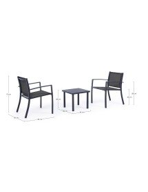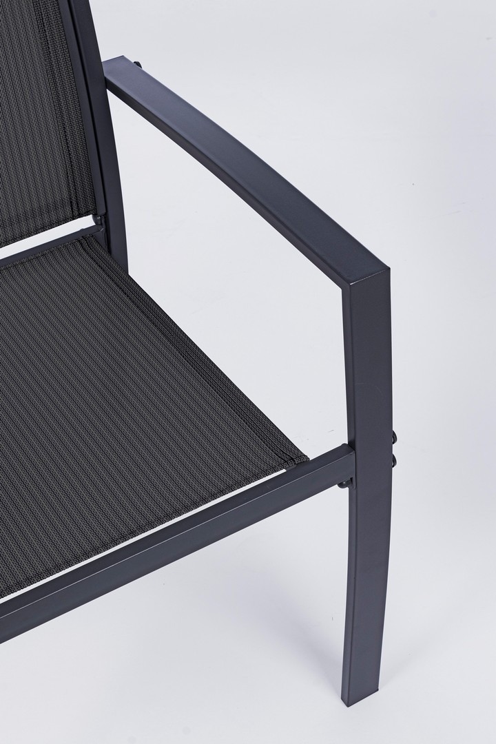 STRUTTURA IN ACCIAIO (TRATTATO PER ESTERNO TRAMITE FOSFATAZIONE) VERNICIATO A POLVERE (POLIESTERE), SEDUTA E SCHIENALE IN TEXTILENE 2X1. TAVOLINO CON VETRO TEMPERATO E STAMPATO. VITERIA IN ACCIAIO GALVANIZZATO. DA ASSEMBLARE.