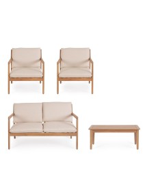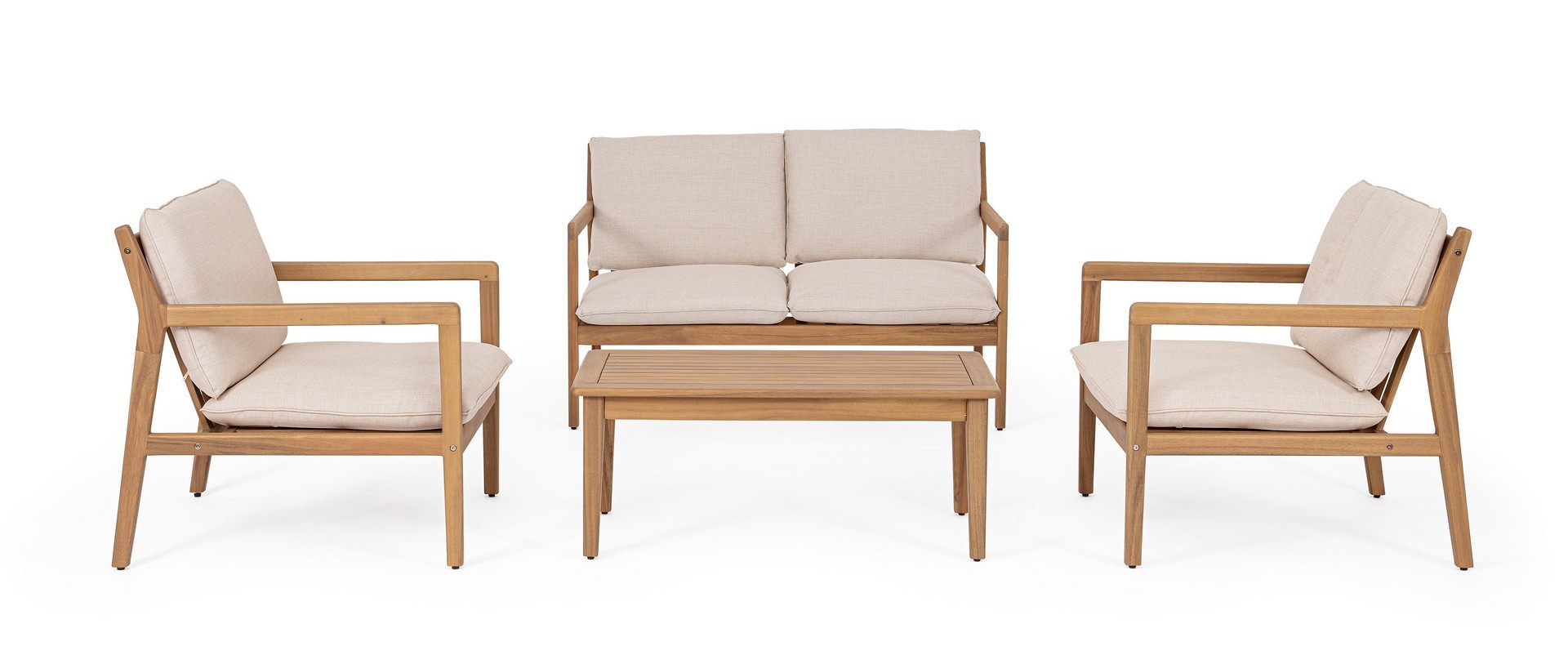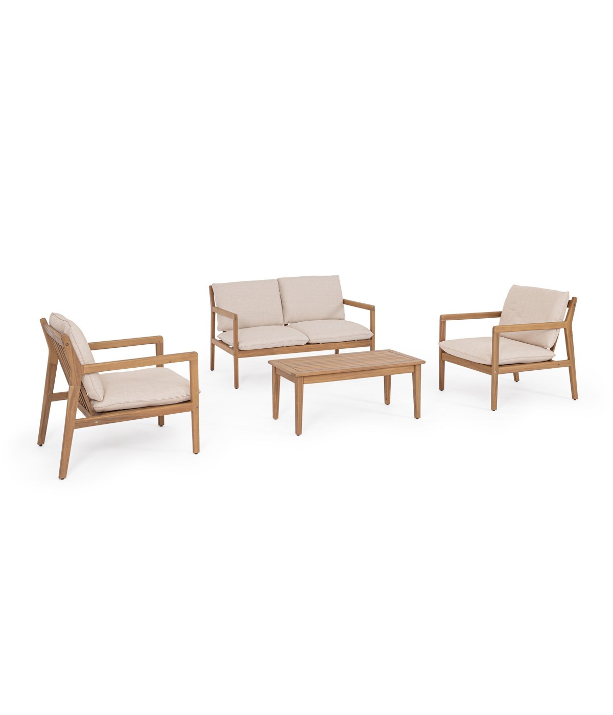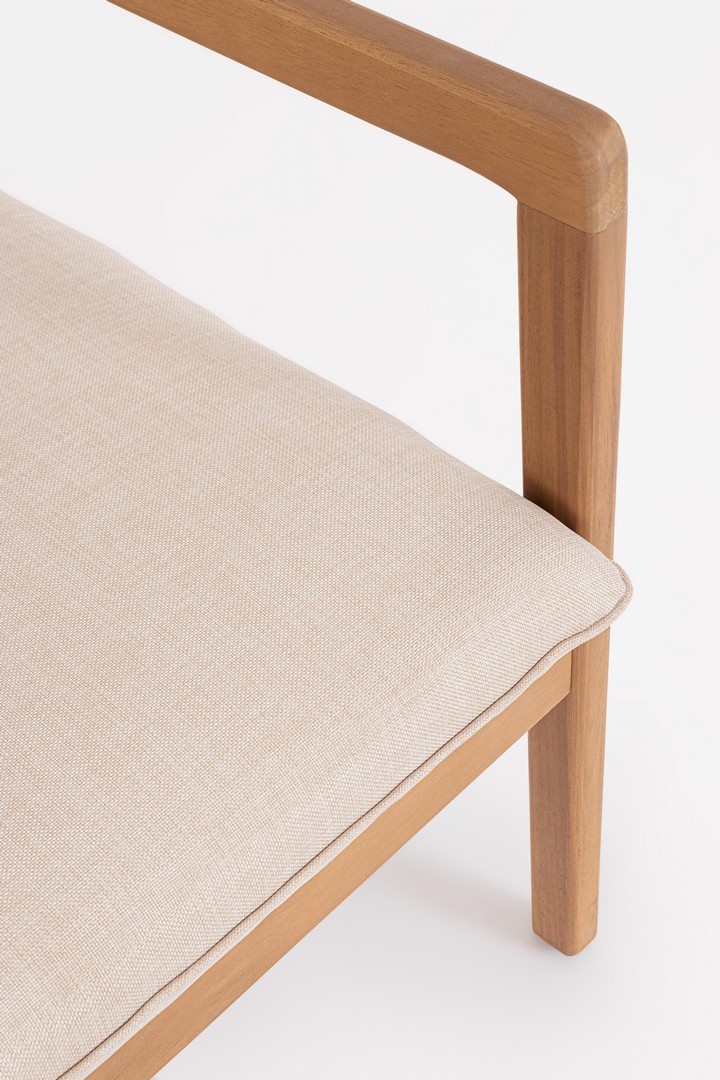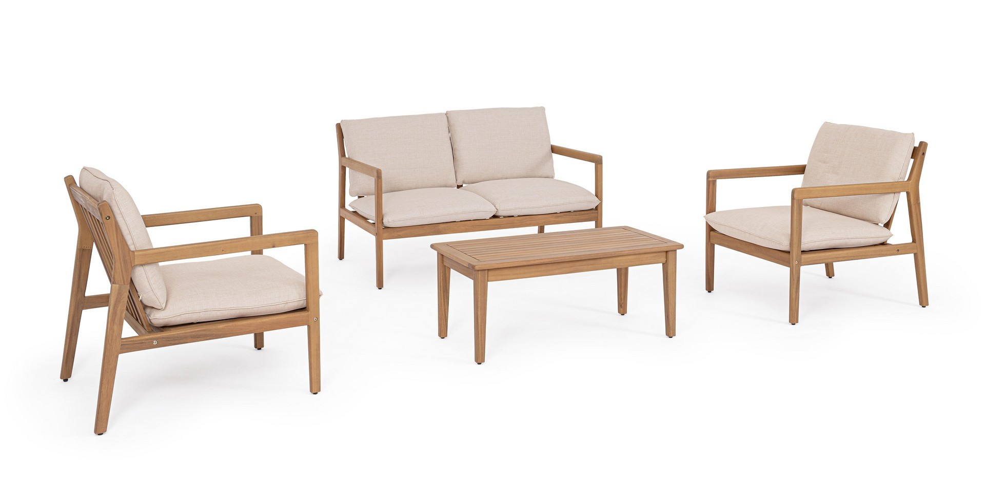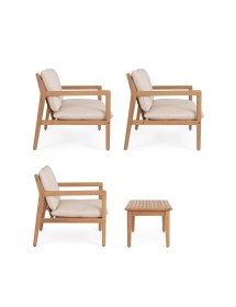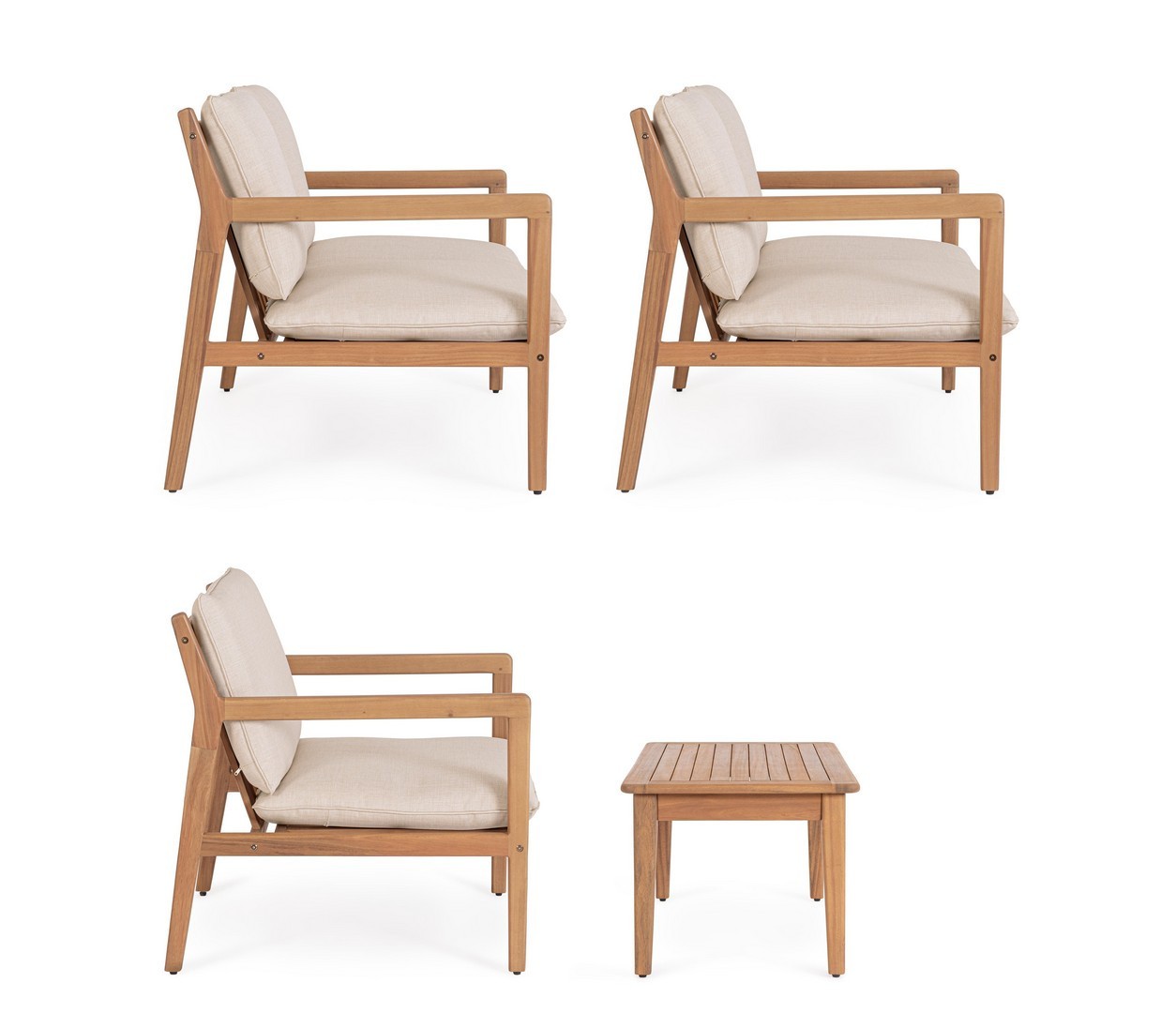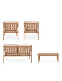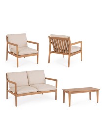 LEGNO DI ACACIA FSC 100%, FINITURA A OLIO (EFFETTO TEAK). CUSCINI SFODERABILI CON TESSUTO IDROREPELLENTE IN POLIESTERE 230GR/M2. VITERIA IN ACCIAIO GALVANIZZATO. DA ASSEMBLARE.