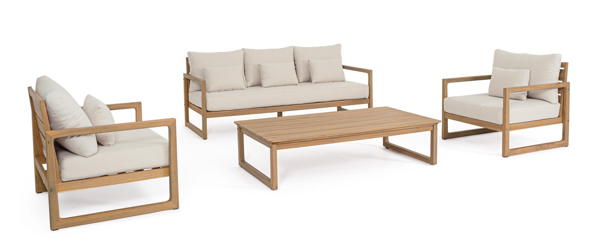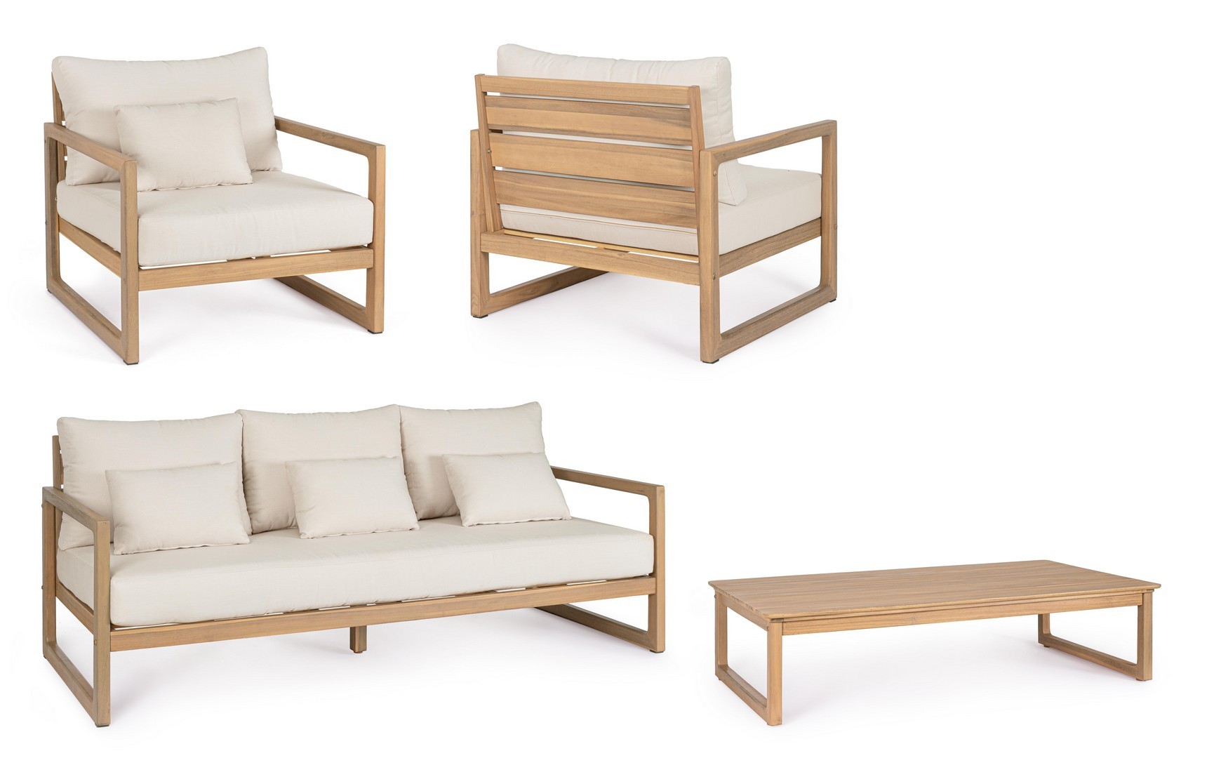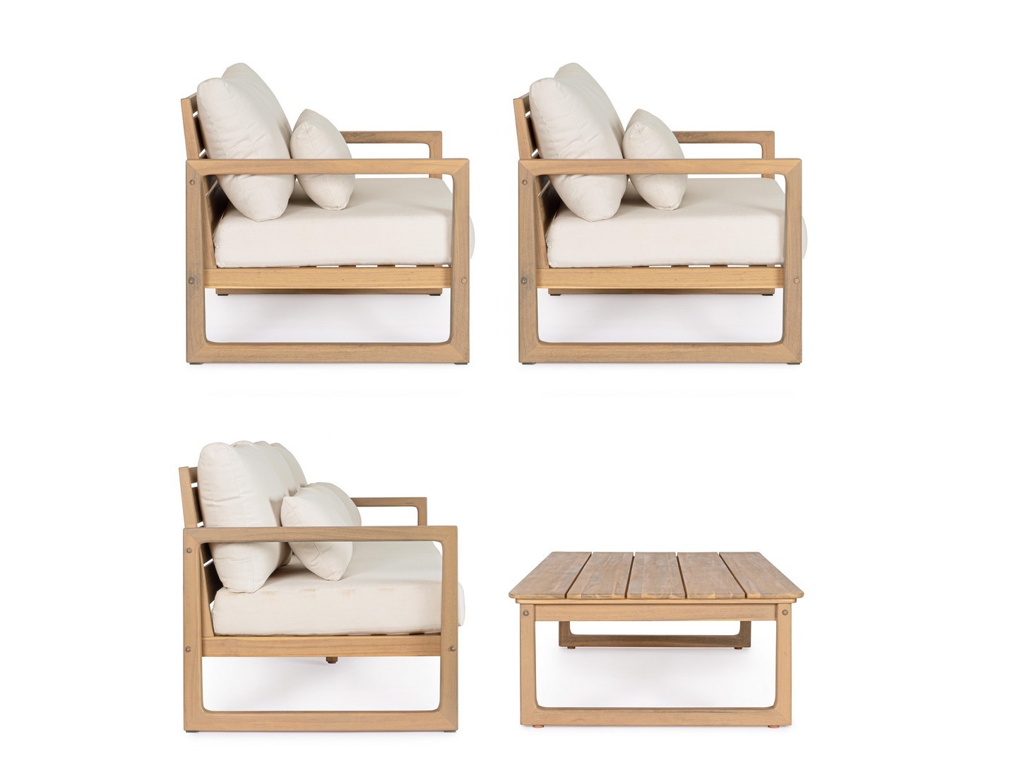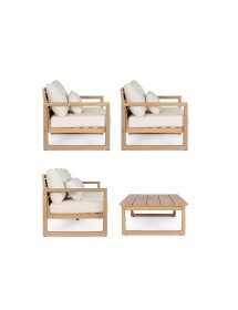 LEGNO DI ACACIA FSC 100%, FINITURA A OLIO (EFFETTO TEAK). CUSCINI SFODERABILI IN TESSUTO IDROREPELLENTE SPUNPOLY 230GR/M2. TAVOLINO PROVVISTO DI PIEDINI REGOLABILI. VITERIA IN ACCIAIO INOSSIDABILE. DA ASSEMBLARE.