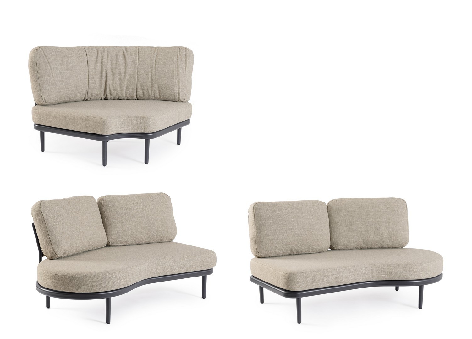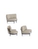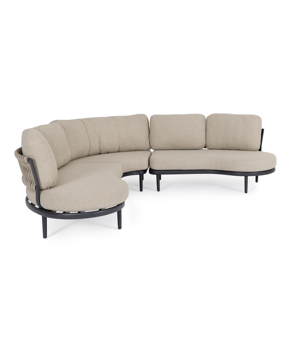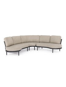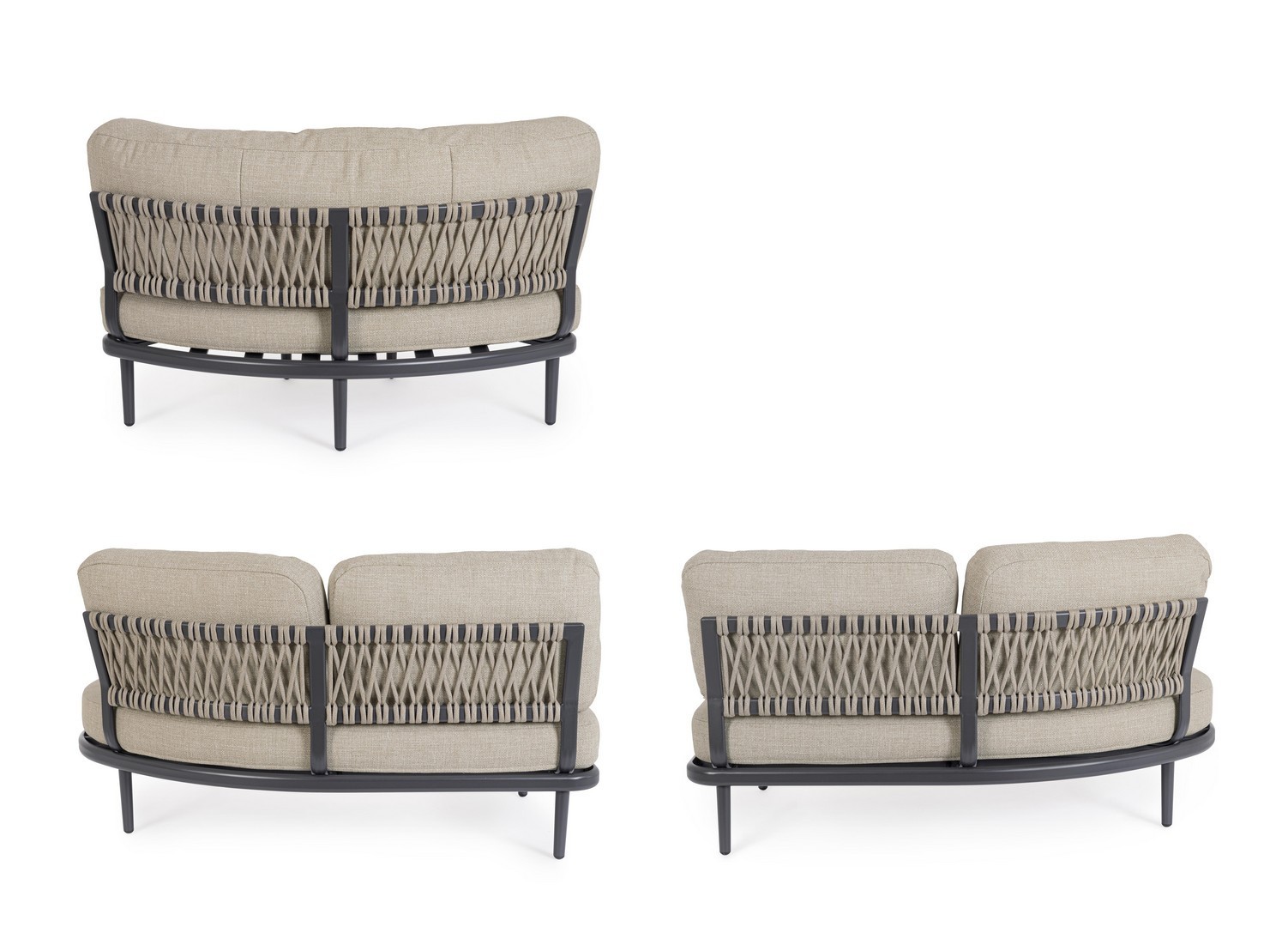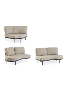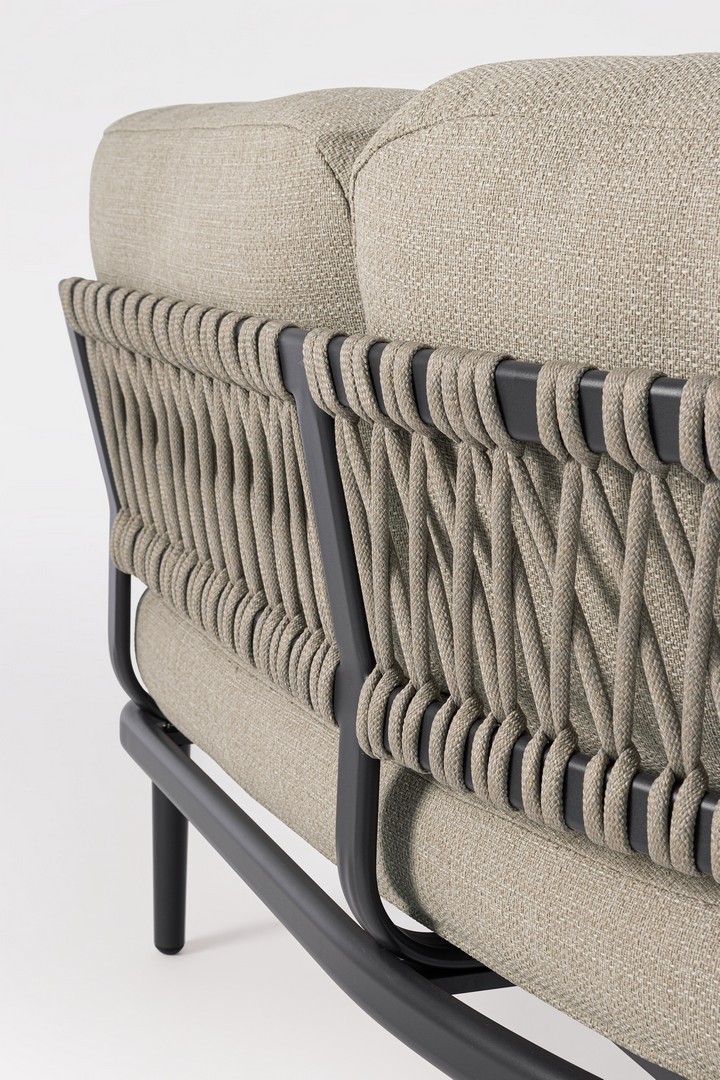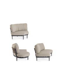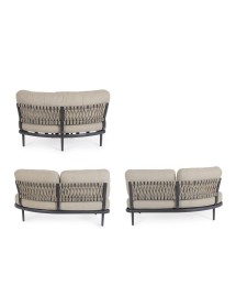 STRUTTURA IN ALLUMINIO VERNICIATA A POLVERE (POLIESTERE). SCHIENALI CON INTRECCIO IN CORDA OLEFIN. CUSCINI SFODERABILI CON TESSUTO IDROREPELLENTE OLEFIN (100% POLIPROPILENE). VITERIA IN ACCIAIO INOSSIDABILE. GAMBE DA ASSEMBLARE.