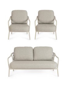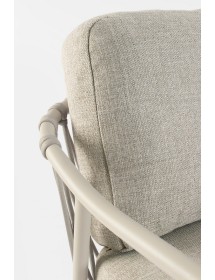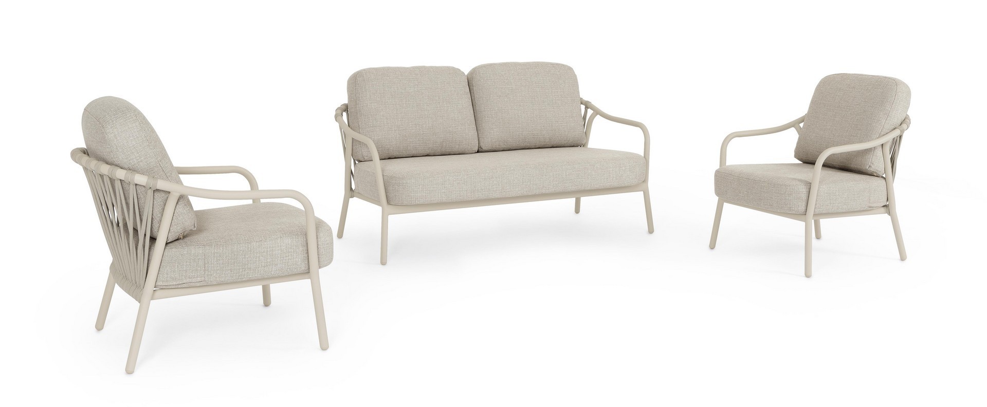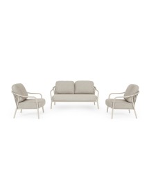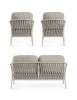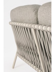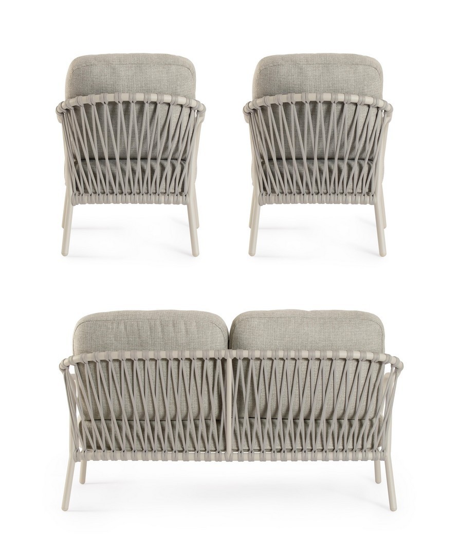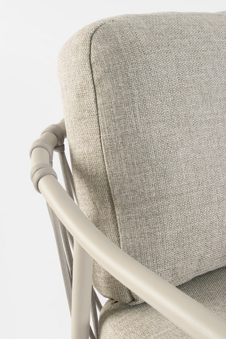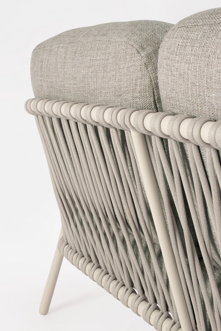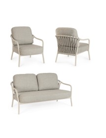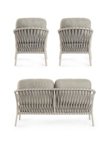 STRUTTURA IN ALLUMINIO VERNICIATA A POLVERE (POLIESTERE). SCHIENALI CON INTRECCIO IN CORDA OLEFIN. CUSCINI SFODERABILI CON TESSUTO IDROREPELLENTE OLEFIN (100% POLIPROPILENE).