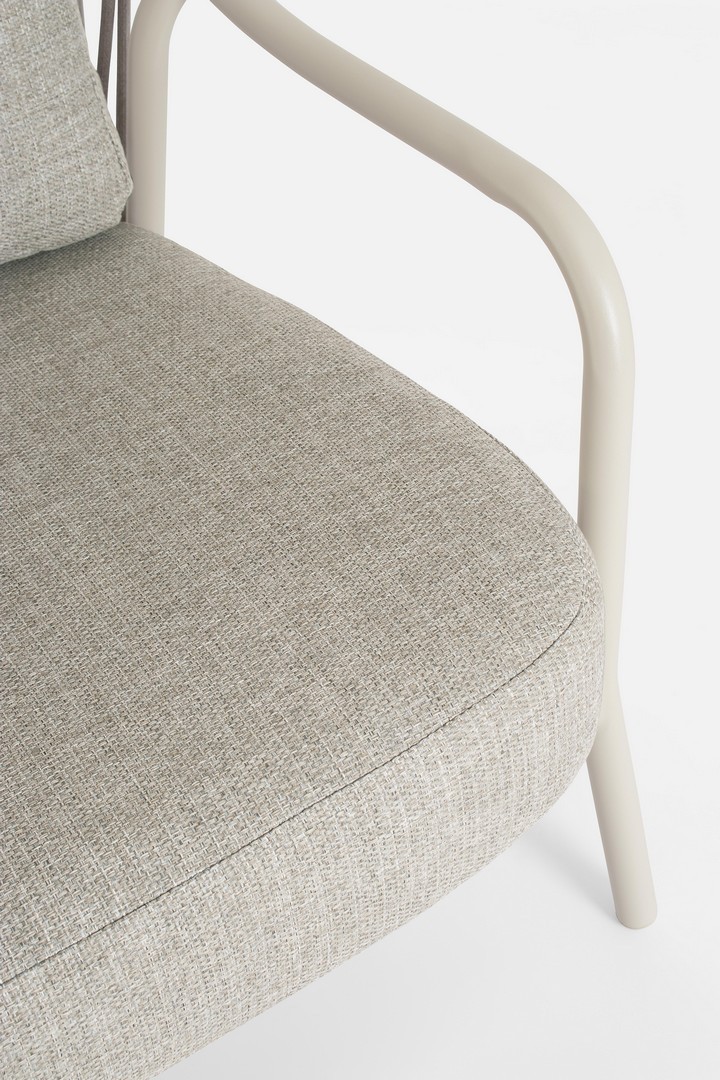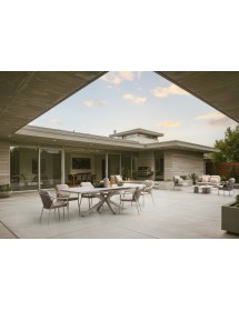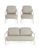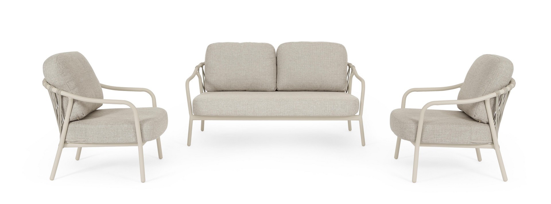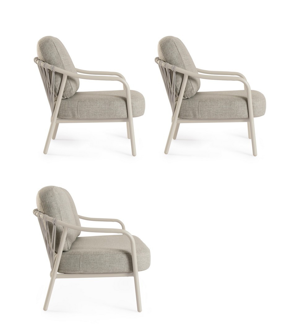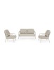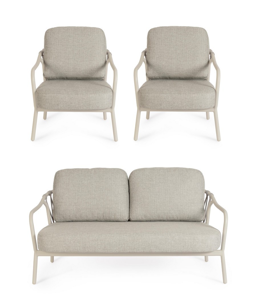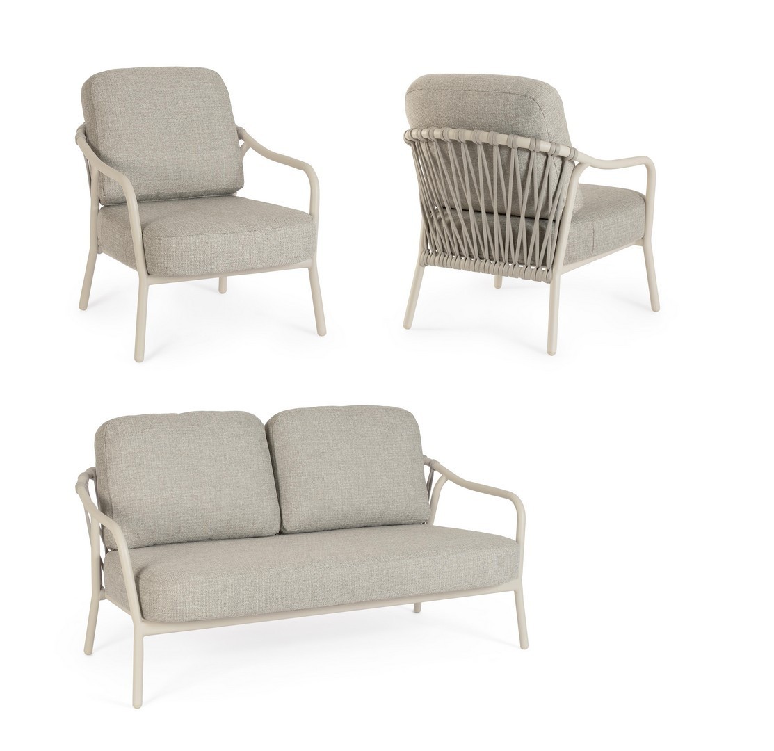 STRUTTURA IN ALLUMINIO VERNICIATA A POLVERE (POLIESTERE). SCHIENALI CON INTRECCIO IN CORDA OLEFIN. CUSCINI SFODERABILI CON TESSUTO IDROREPELLENTE OLEFIN (100% POLIPROPILENE).