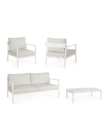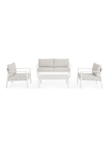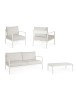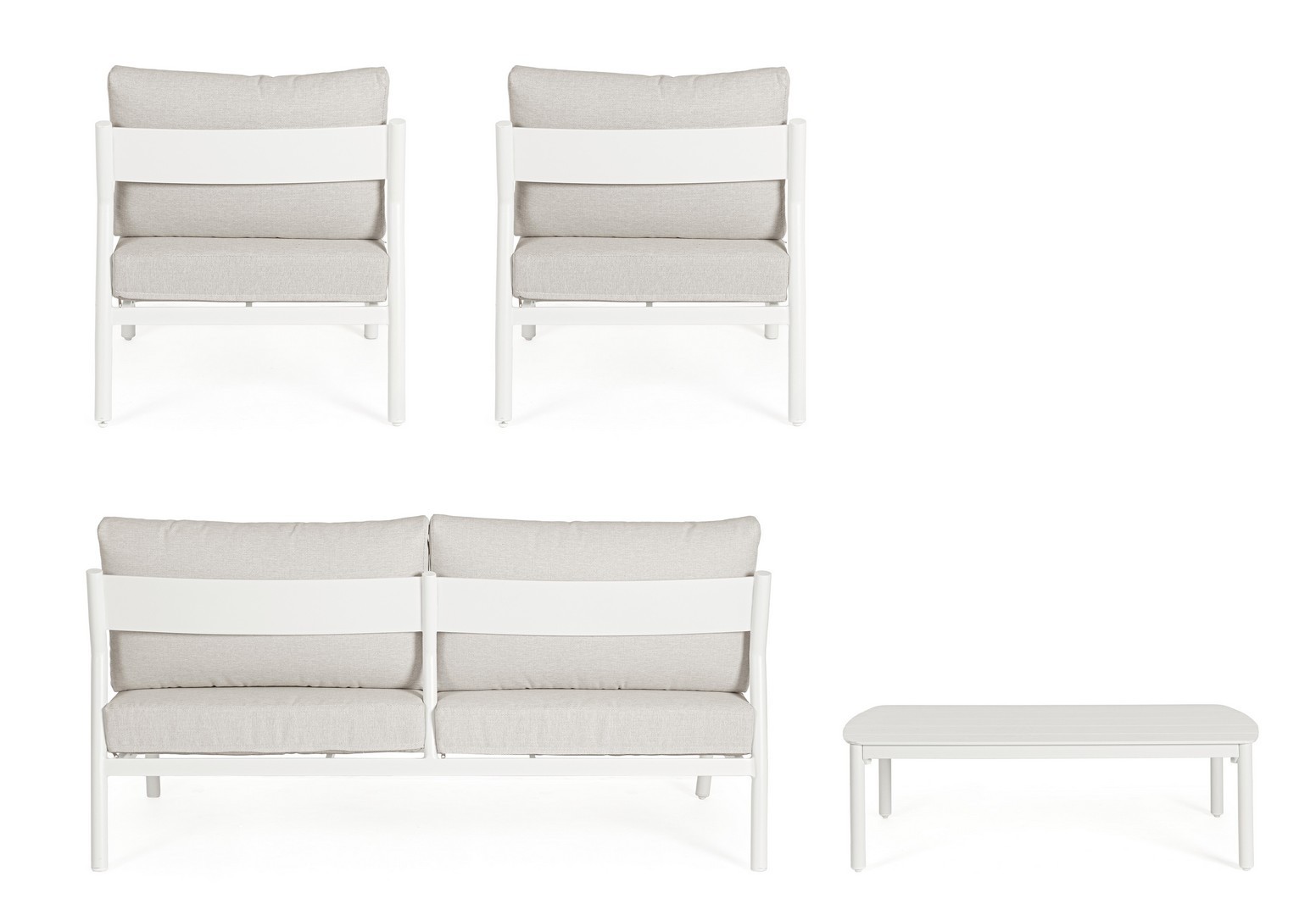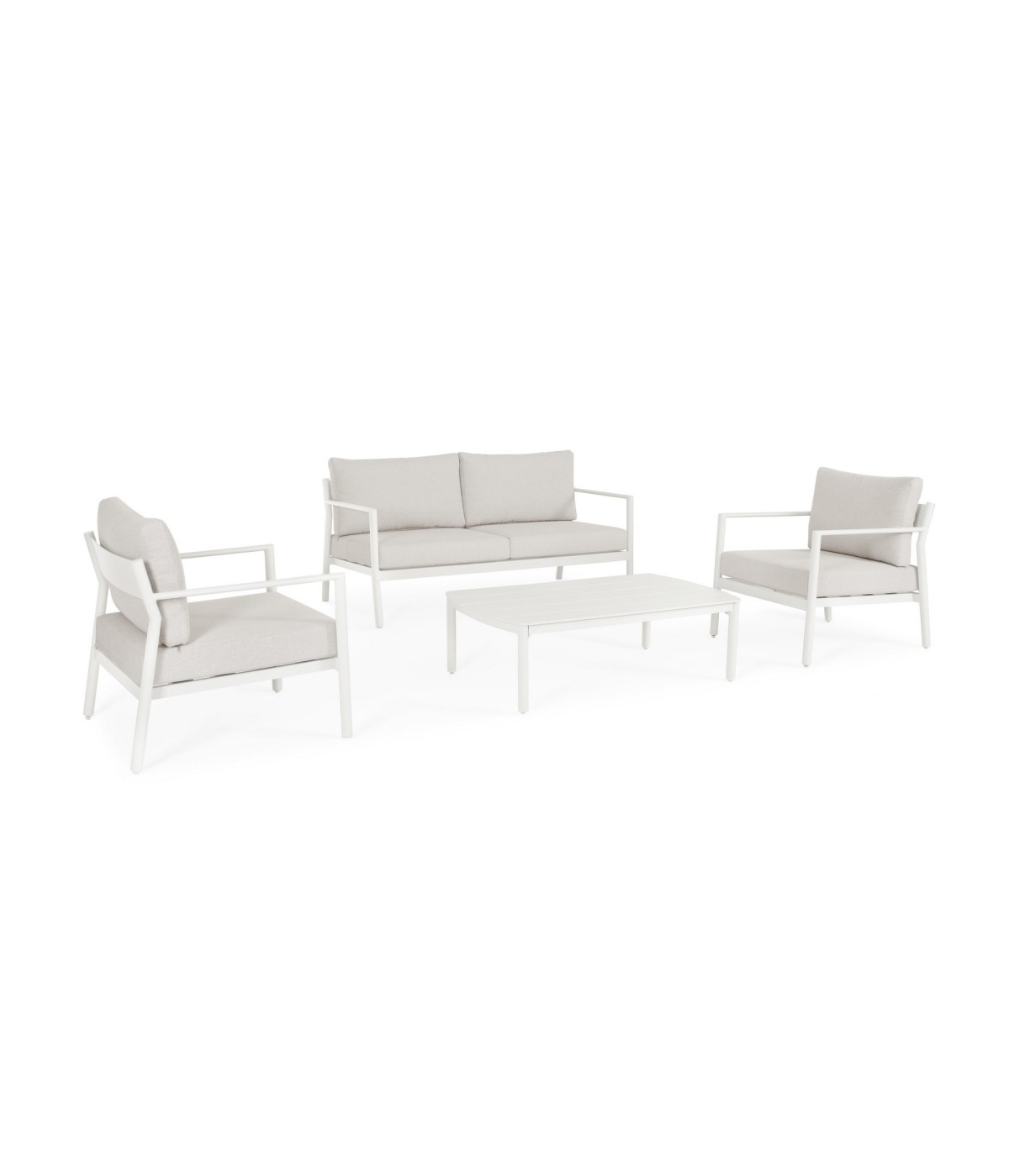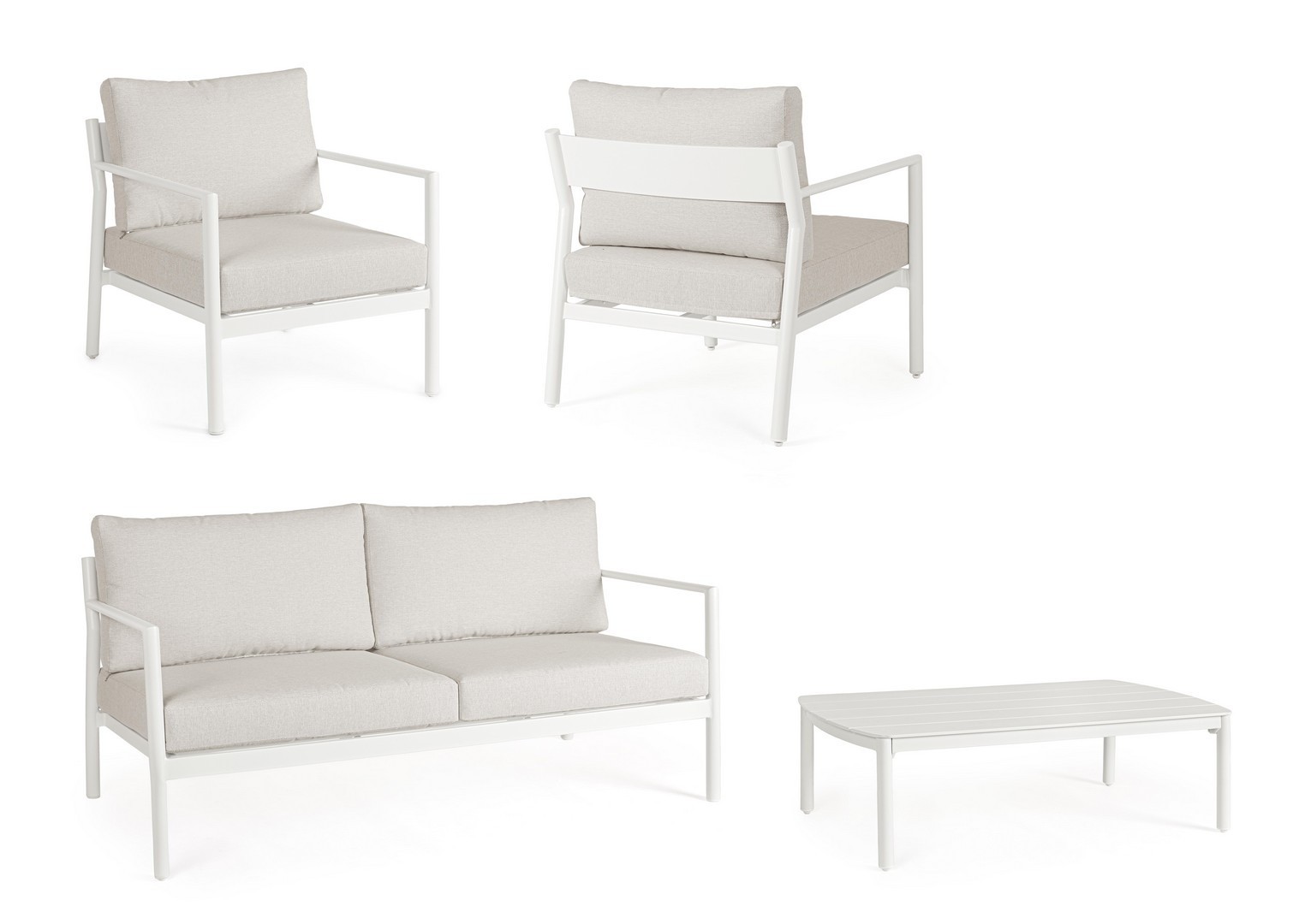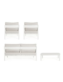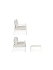 STRUTTURA IN ALLUMINIO VERNICIATO A POLVERE (POLIESTERE). CUSCINI SEDUTA E SCHIENALE SFODERABILI CON TESSUTO IDROREPELLENTE SPUNPOLY (100% POLIESTERE). PIEDINI REGOLABILI. GAMBE TAVOLINO (VITERIA IN ACCIAIO INOSSIDABILE) DA ASSEMBLARE.
