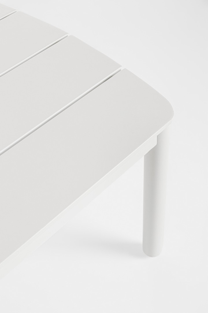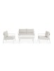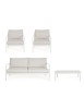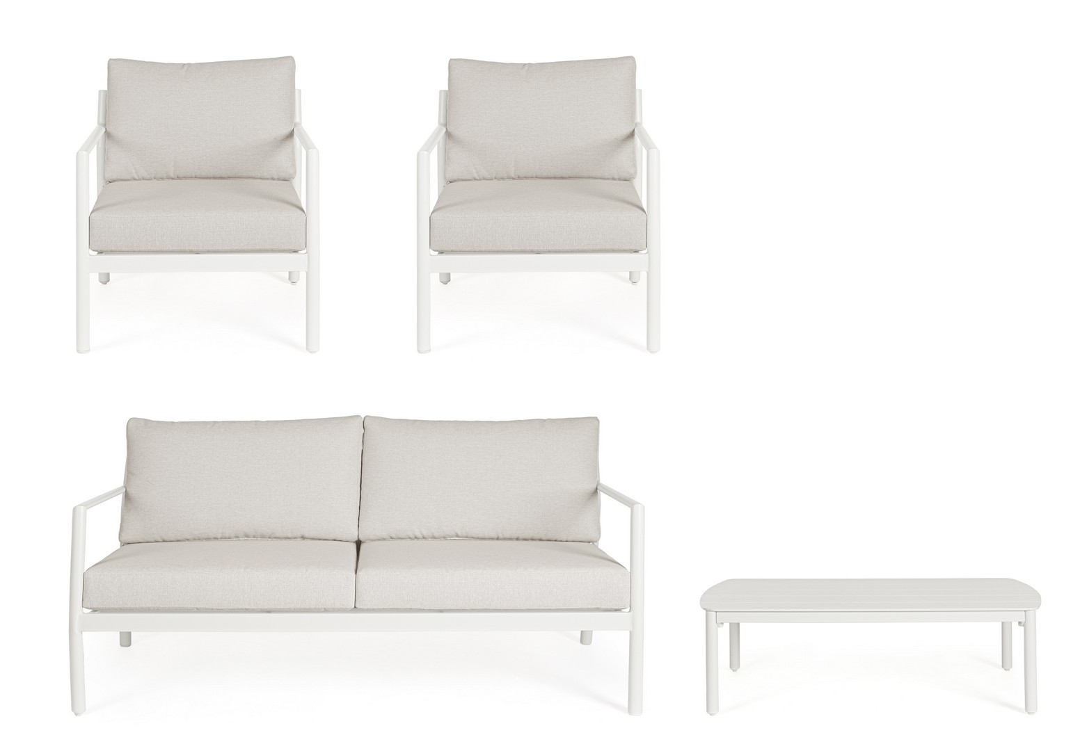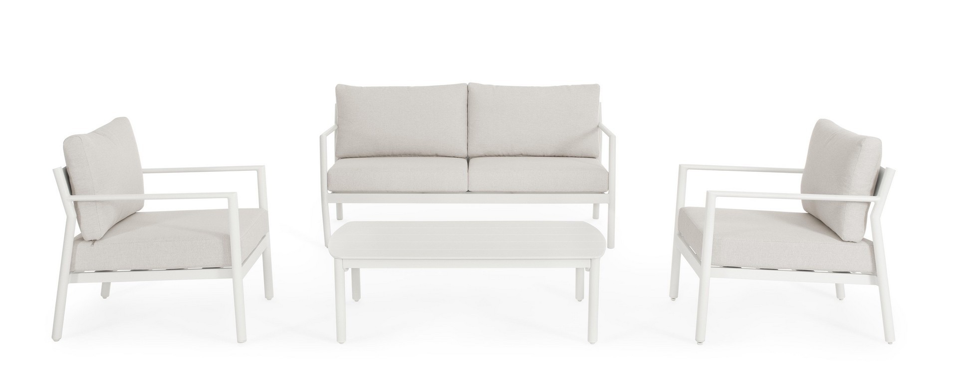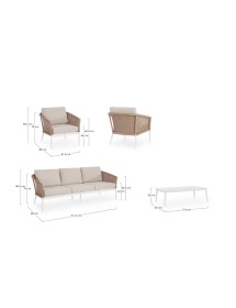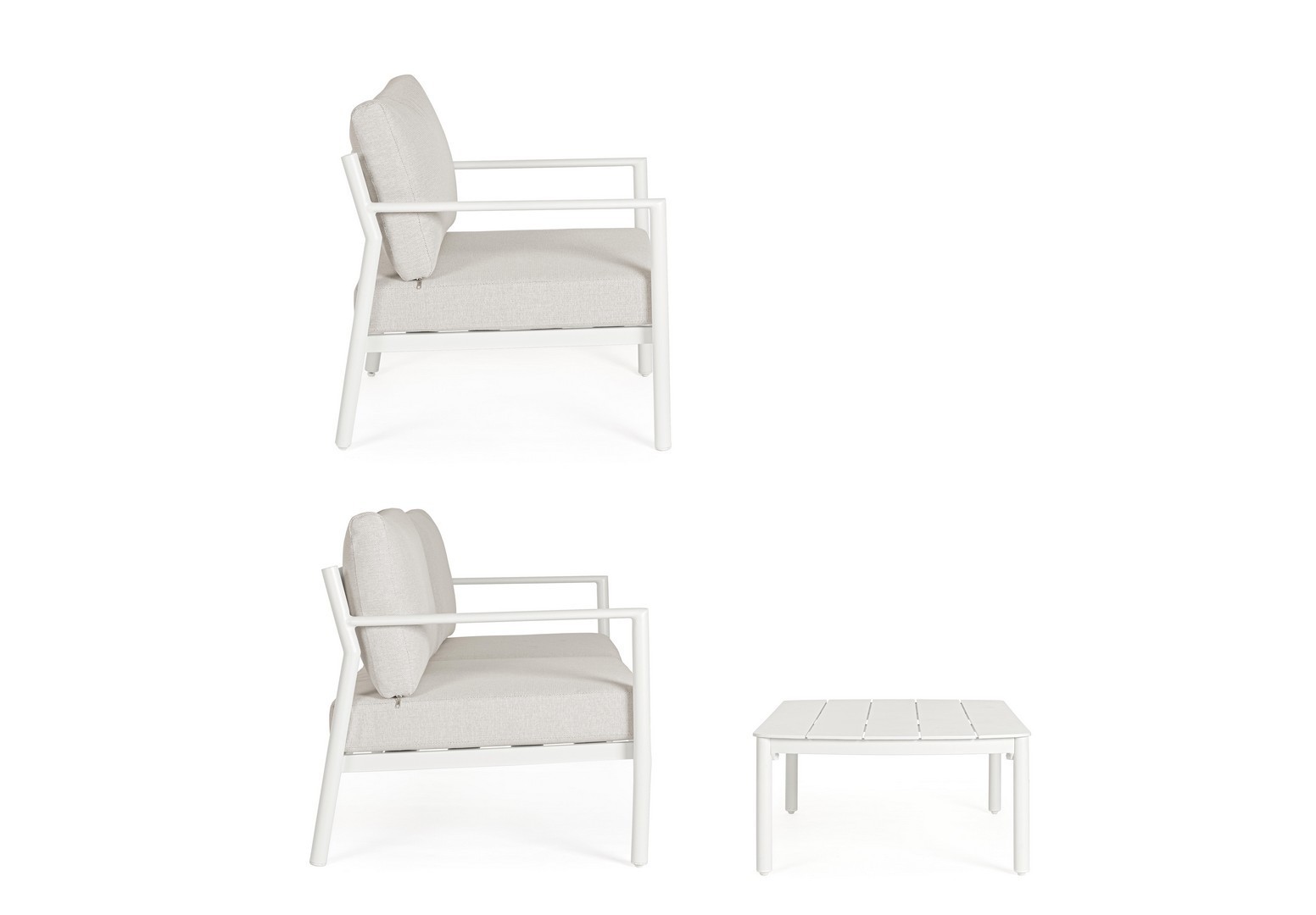 STRUTTURA IN ALLUMINIO VERNICIATO A POLVERE (POLIESTERE). CUSCINI SEDUTA E SCHIENALE SFODERABILI CON TESSUTO IDROREPELLENTE SPUNPOLY (100% POLIESTERE). PIEDINI REGOLABILI. GAMBE TAVOLINO (VITERIA IN ACCIAIO INOSSIDABILE) DA ASSEMBLARE.