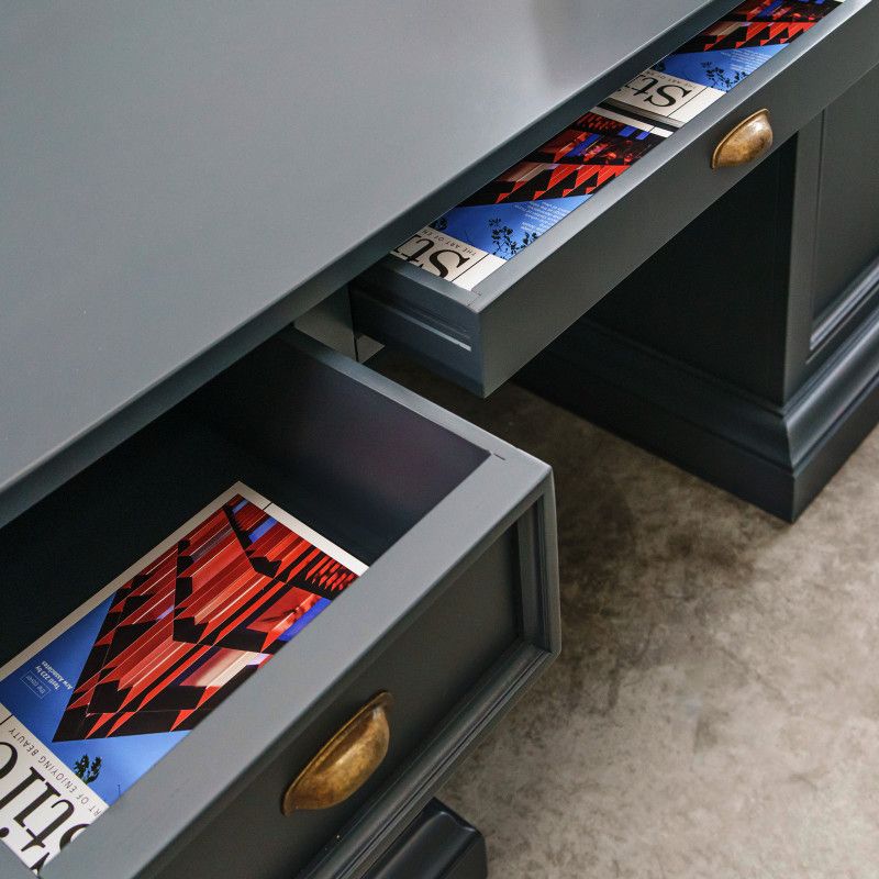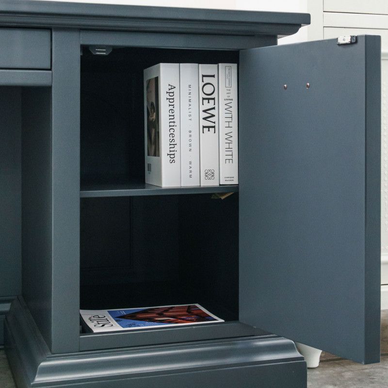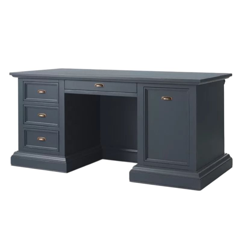 Scrivania costruita in legno con zoccolo a terra dotata di 4 cassetti e 1 porta che ti permetteranno di custodire oggetti in maniera sicura, piano della scrivania che offre lo spazio necessario per tenere in ordine i documenti e la cancelleria. Unica nel suo genere per la sua verniciatura in contrasto con gli intagli che non passeranno inosservate da amici o parenti. Ideale per il tuo luogo lavoro o di studio dove trascorrere il tempo per impegni lavorativi o di studio..