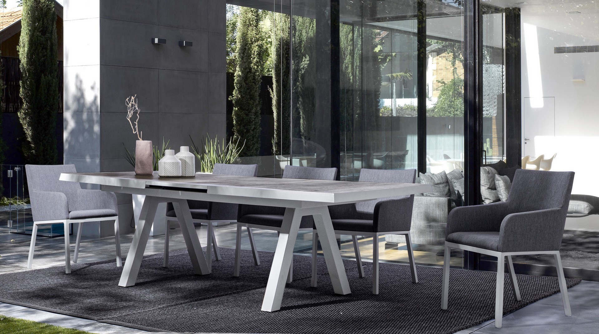 STRUTTURA IN ALLUMINIO VERNICIATA A POLVERE (POLIESTERE). RIVESTIMENTO CON TESSUTO MISTO (70% TEXTILENE E 30% OLEFIN). IMBOTTITURA PER ESTERNO FAST DRY FOAM. GAMBE DA ASSEMBLARE.