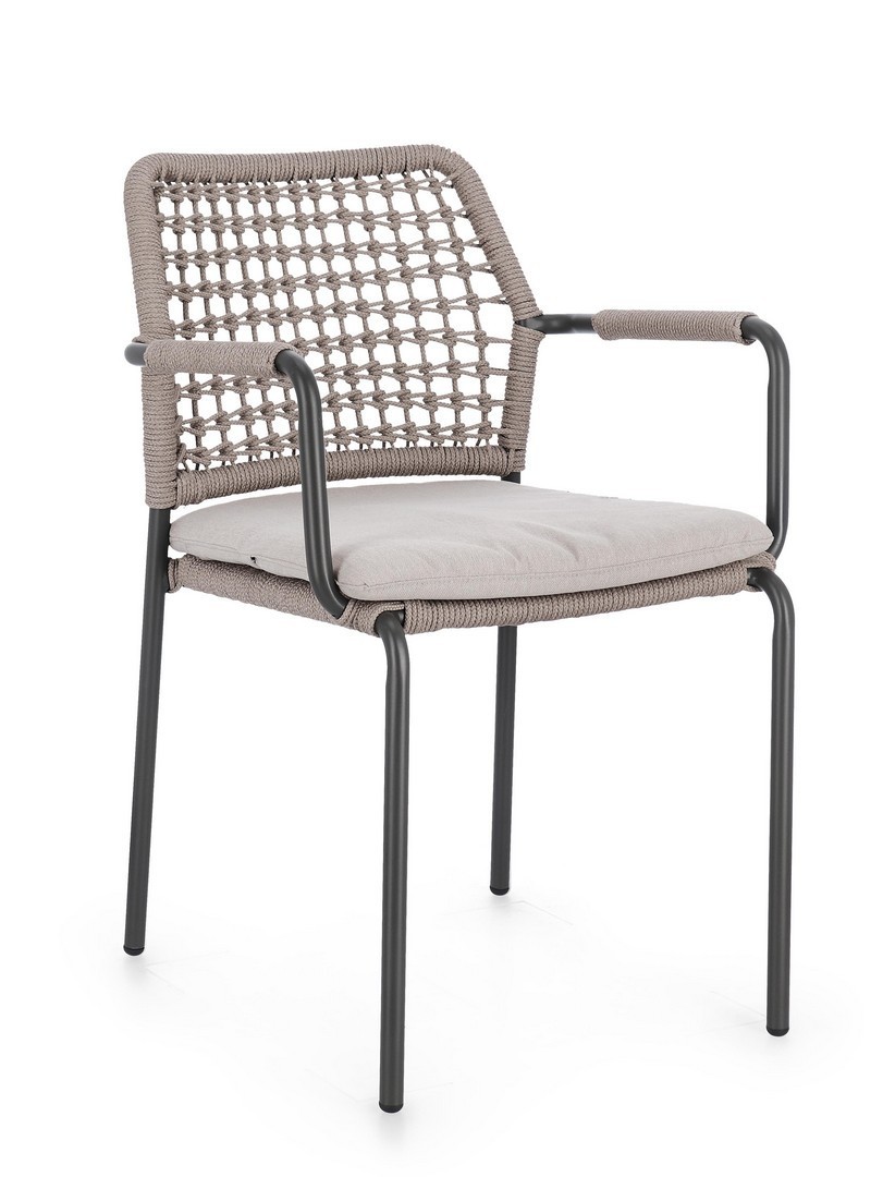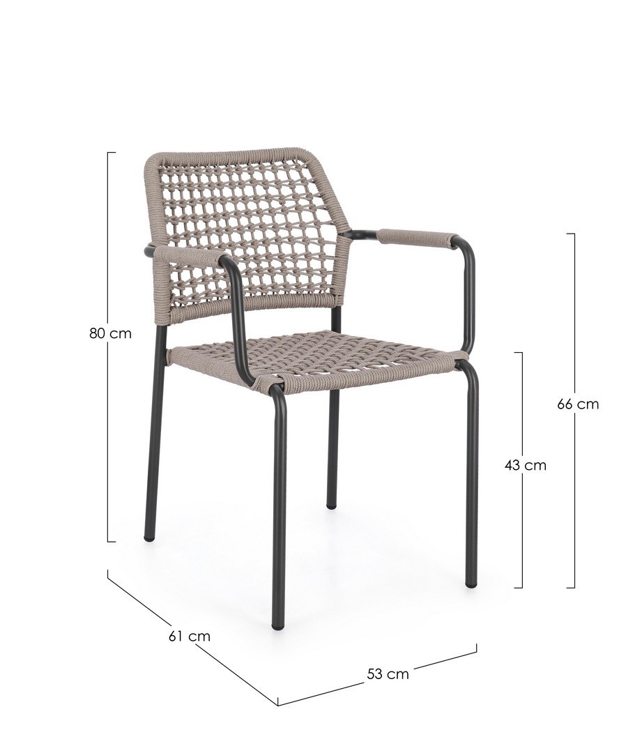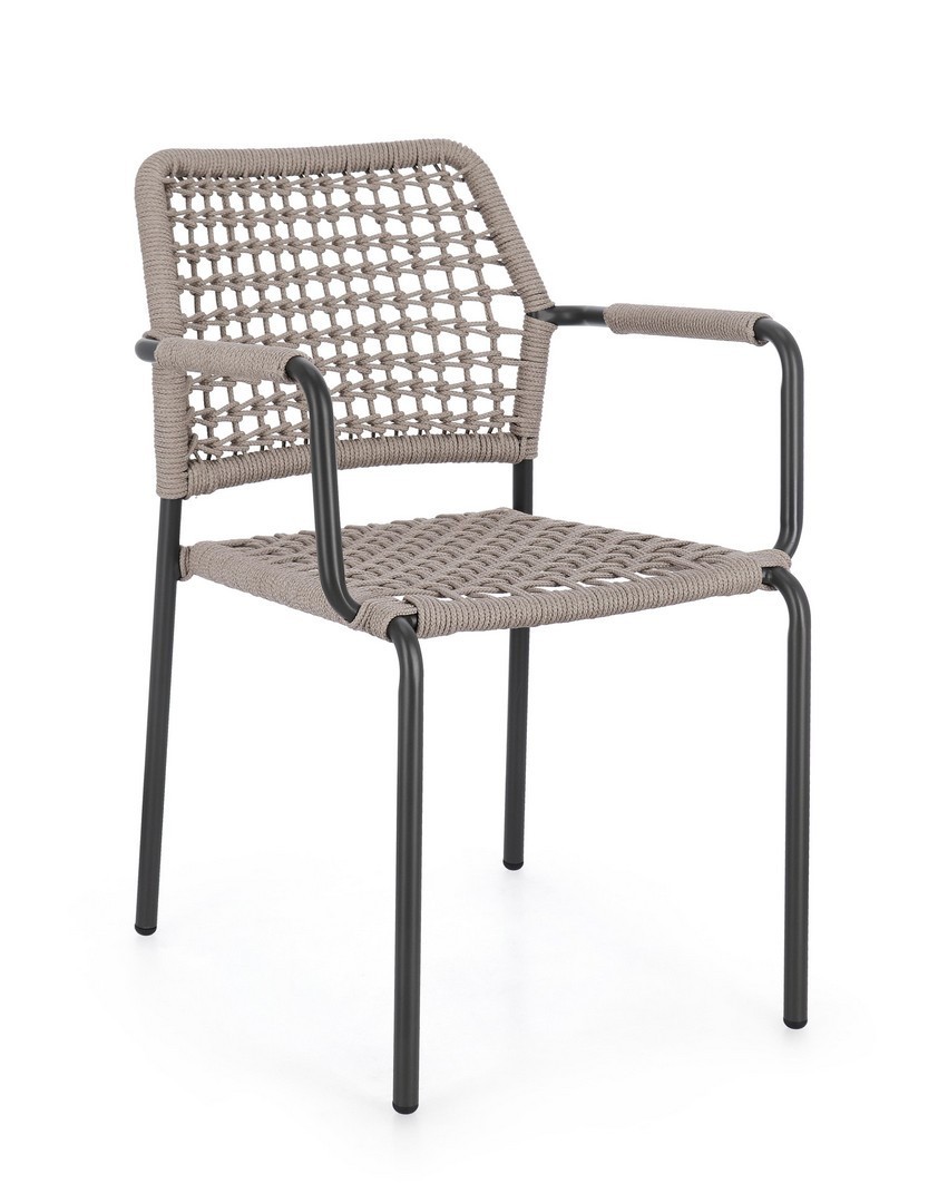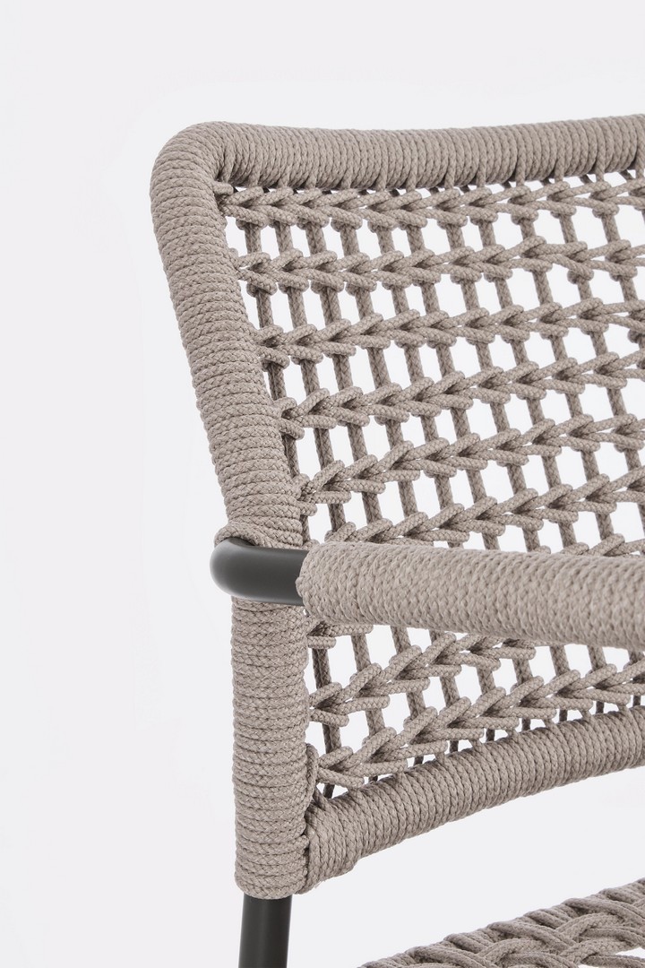 STRUTTURA IN ALLUMINIO VERNICIATA A POLVERE (POLIESTERE). INTRECCIO PER ESTERNO IN CORDA POLIESTERE. IMPILABILE. IMBALLO SENZA CARTONE.