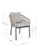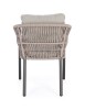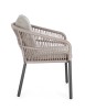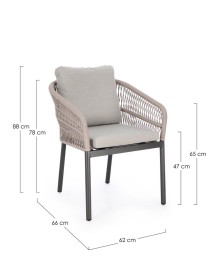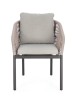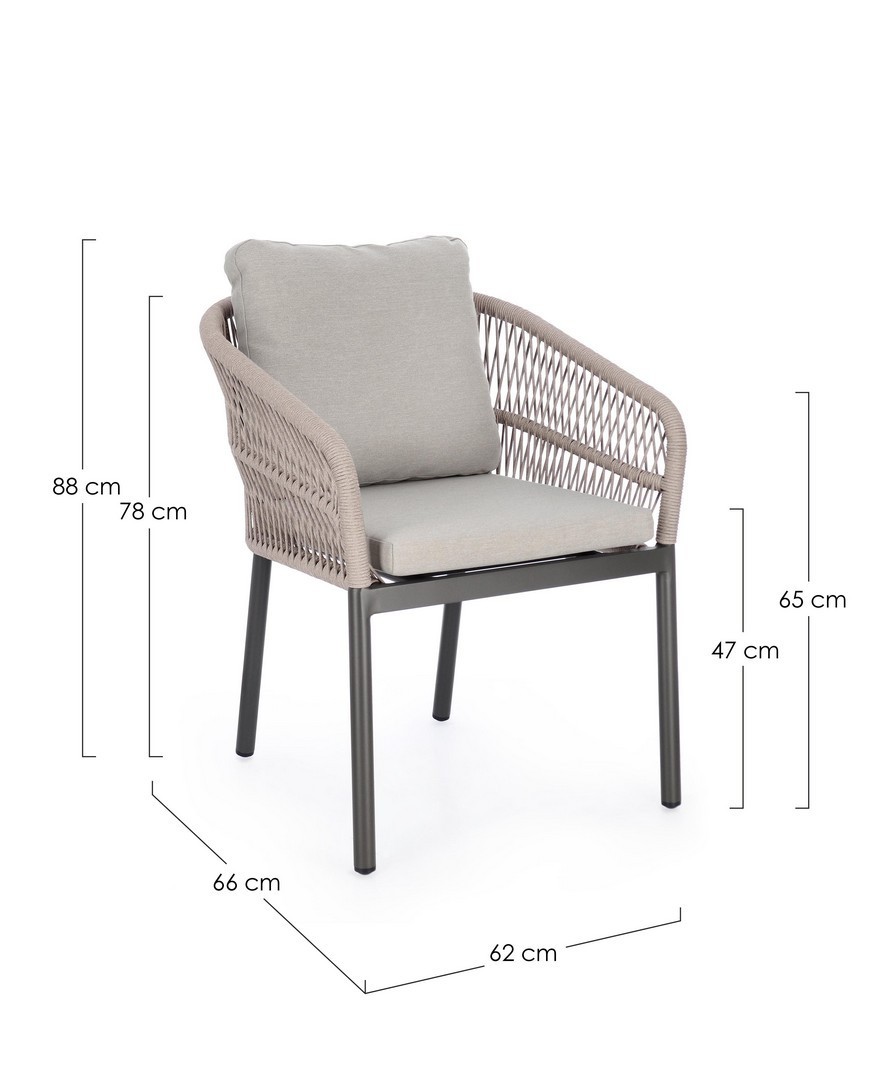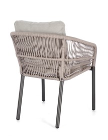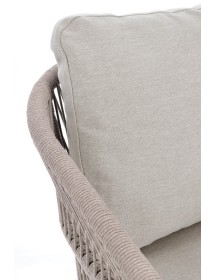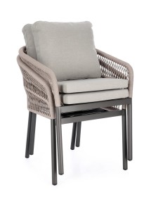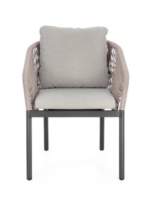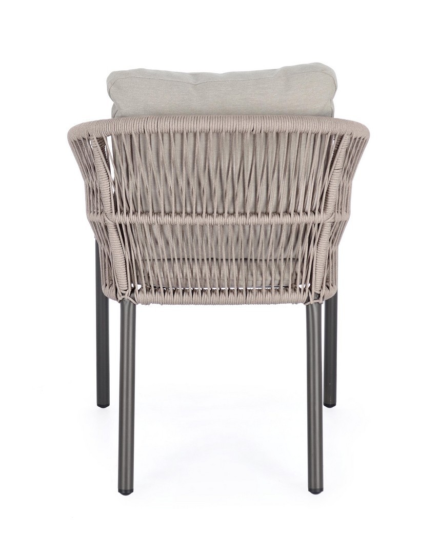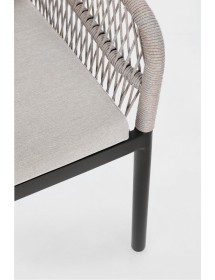 STRUTTURA IN ALLUMINIO VERNICIATA A POLVERE (POLIESTERE). INTRECCIO PER ESTERNO IN CORDA POLIESTERE. CUSCINI SFODERABILI IN TESSUTO IDROREPELLENTE 100% POLIESTERE. IMPILABILE.