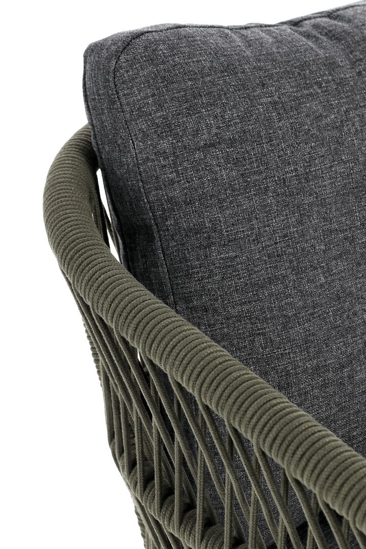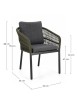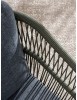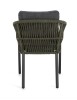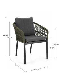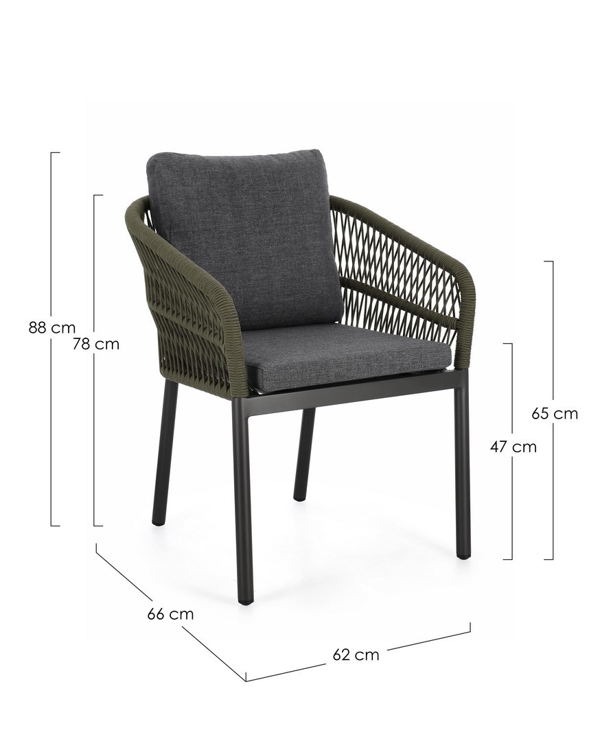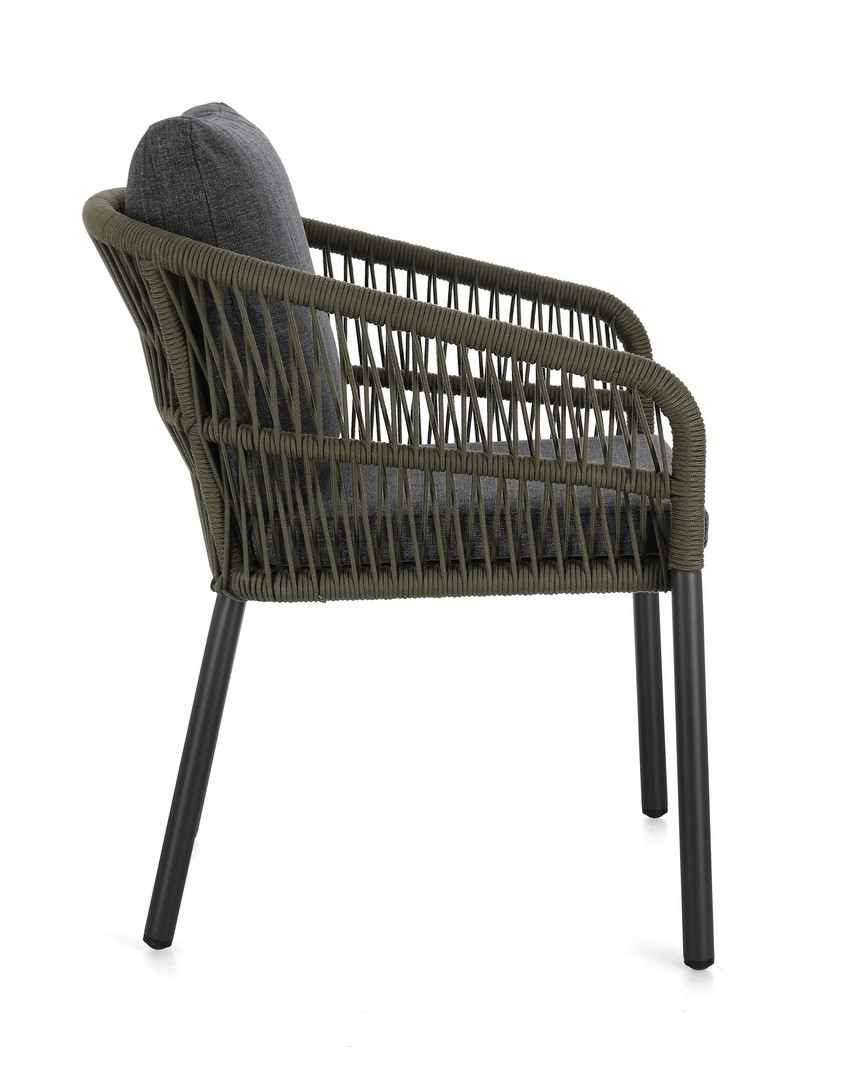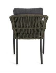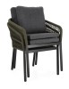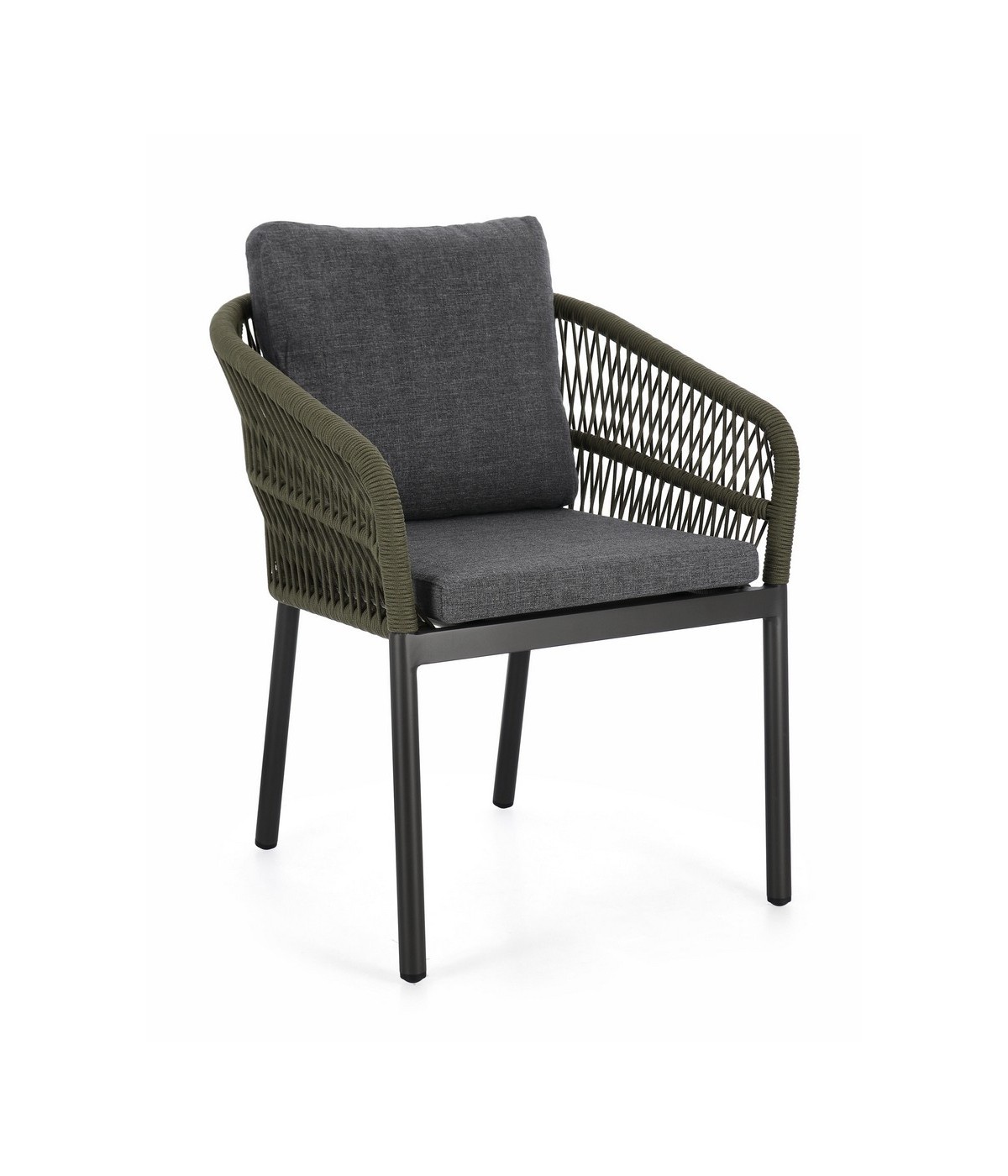 STRUTTURA IN ALLUMINIO VERNICIATA A POLVERE (POLIESTERE). INTRECCIO PER ESTERNO IN CORDA OLEFIN (POLIPROPILENE). CUSCINI SFODERABILI IN TESSUTO IDROREPELLENTE 100% POLIPROPILENE. IMPILABILE. IMBALLO SENZA CARTONE.