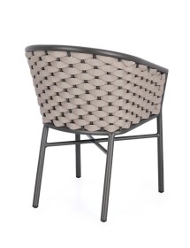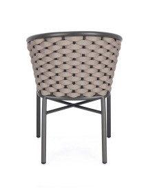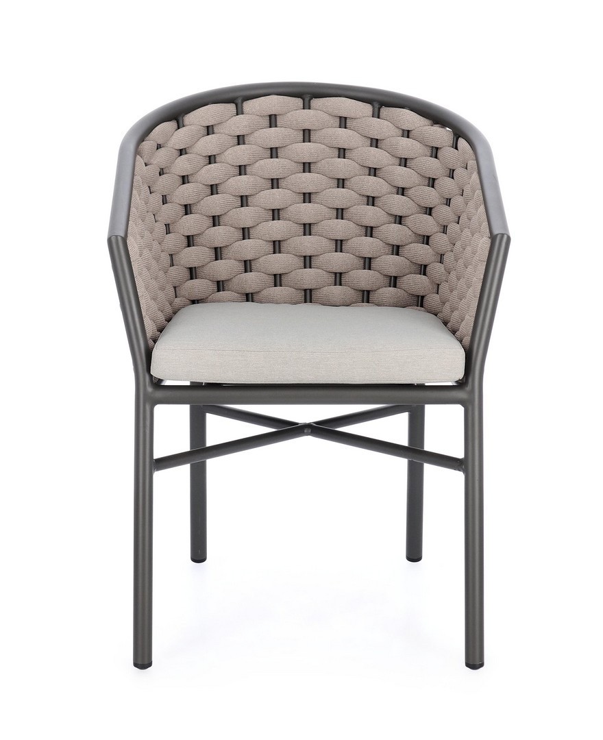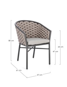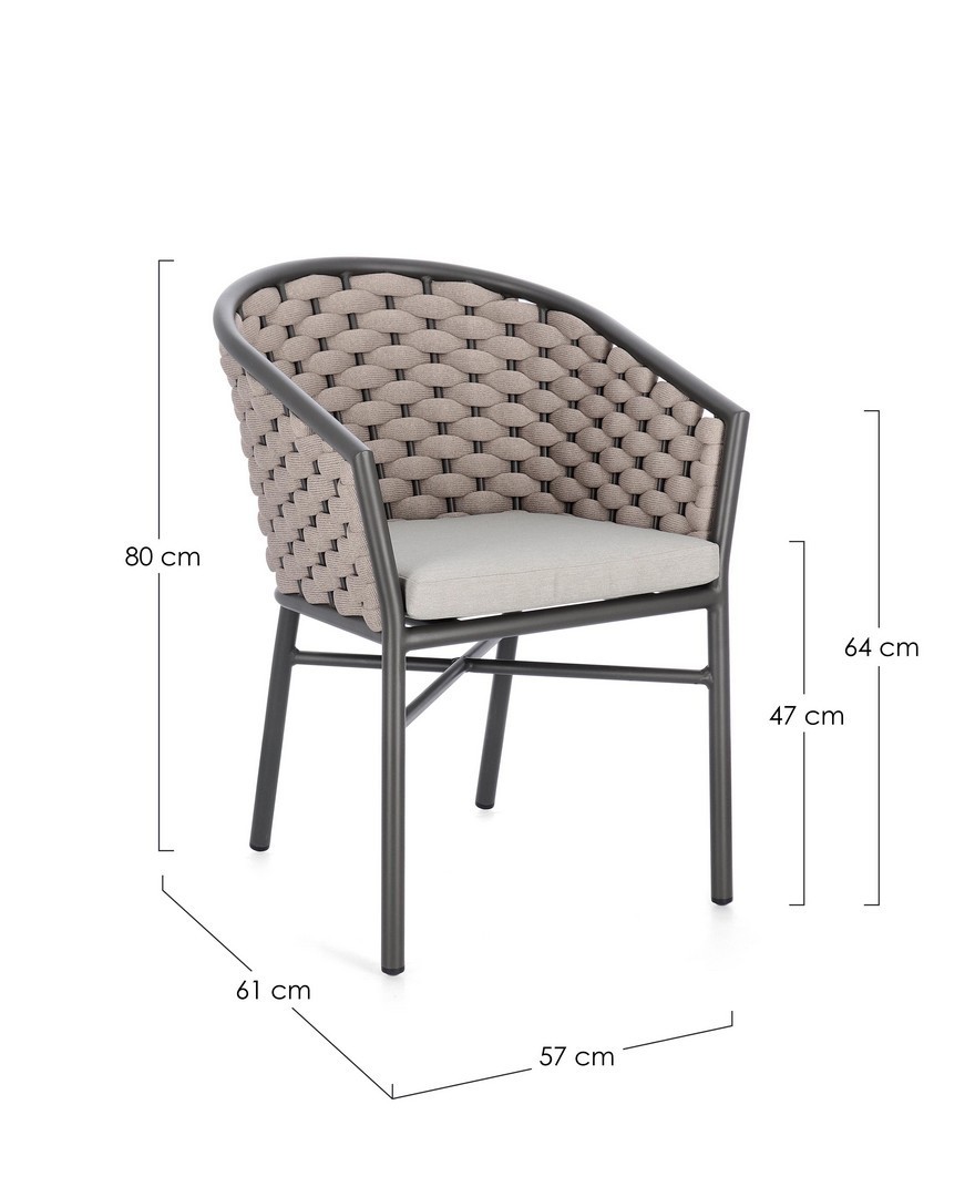 STRUTTURA IN ALLUMINIO VERNICIATA A POLVERE (POLIESTERE). INTRECCIO PER ESTERNO IN CORDA POLIESTERE IMBOTTITA IN GOMMA (POLIETILENE). CUSCINI SFODERABILI IN TESSUTO IDROREPELLENTE 100% POLIESTERE. IMPILABILE. IMBALLO SENZA CARTONE.