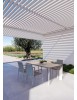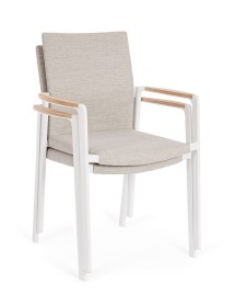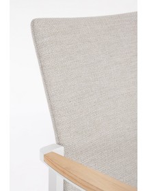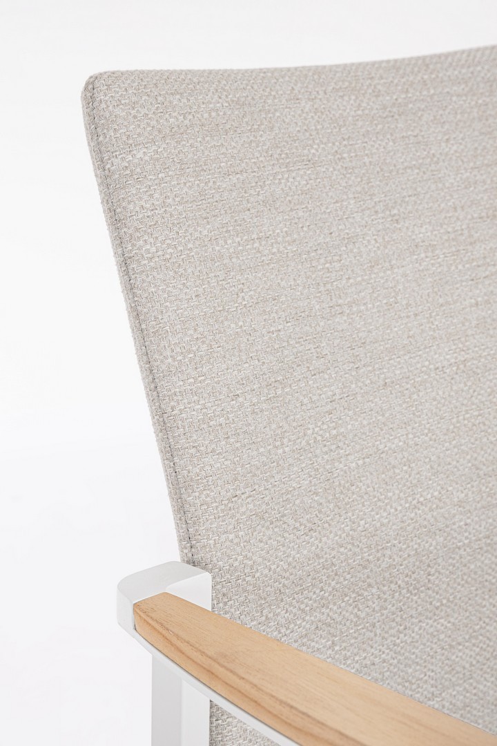 STRUTTURA IN ALLUMINIO VERNICIATO A POLVERE (POLIESTERE). BRACCIOLI CON INSERTI IN TEAK. RIVESTIMENTO SEDUTA E SCHIENALE CON TESSUTO IDROREPELLENTE OLEFIN (100% POLIPROPILENE). IMBOTTITURA FAST DRY FOAM. IMPILABILE.