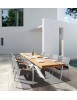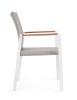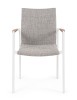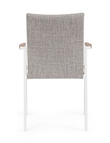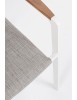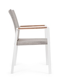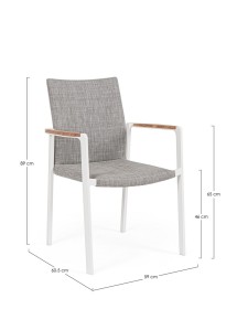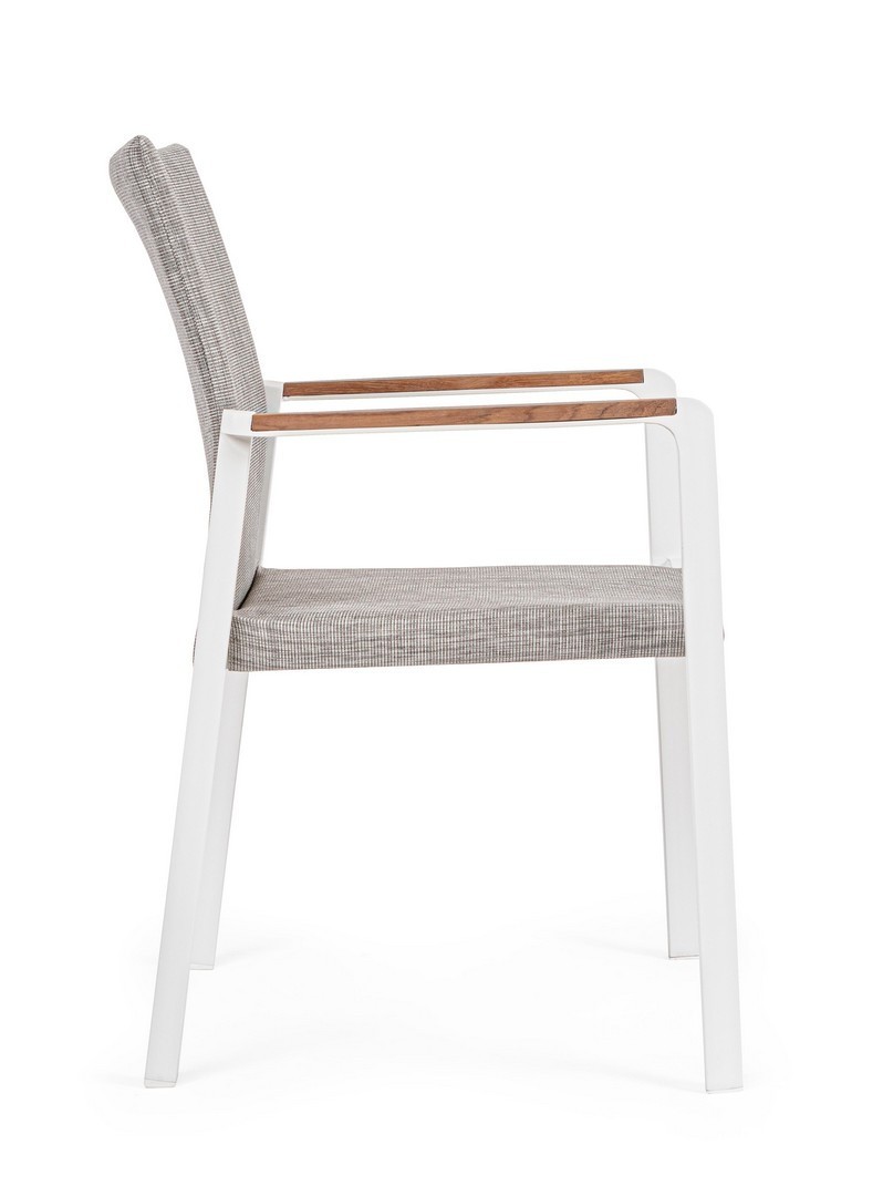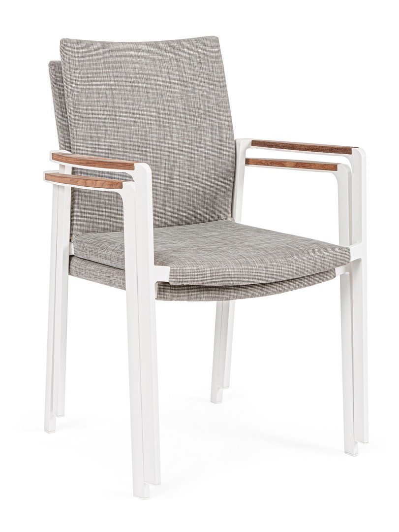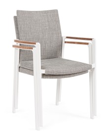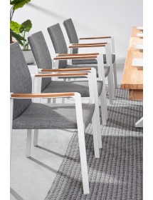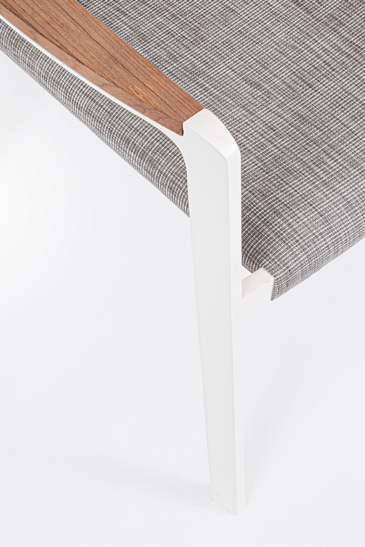 ALLUMINIO VERNICIATO A POLVERE (POLIESTERE). BRACCIOLI CON INSERTI IN TEAK. RIVESTIMENTO SEDUTA E SCHIENALE IN TESSUTO PER ESTERNO (70% TEXTILENE 30% OLEFIN), IMBOTTITURA "FAST DRY FOAM". IMPILABILE.