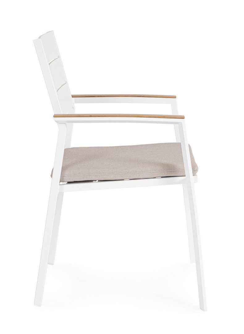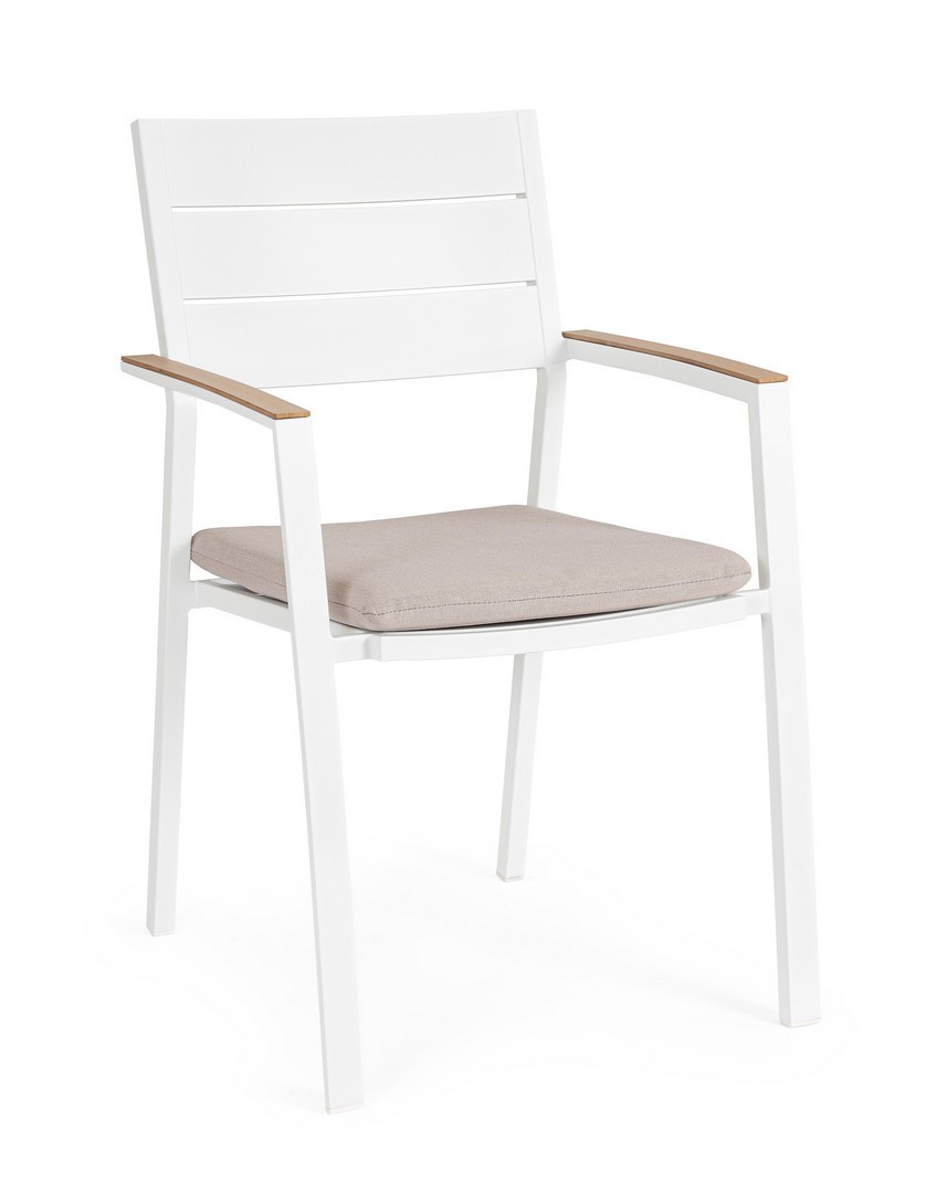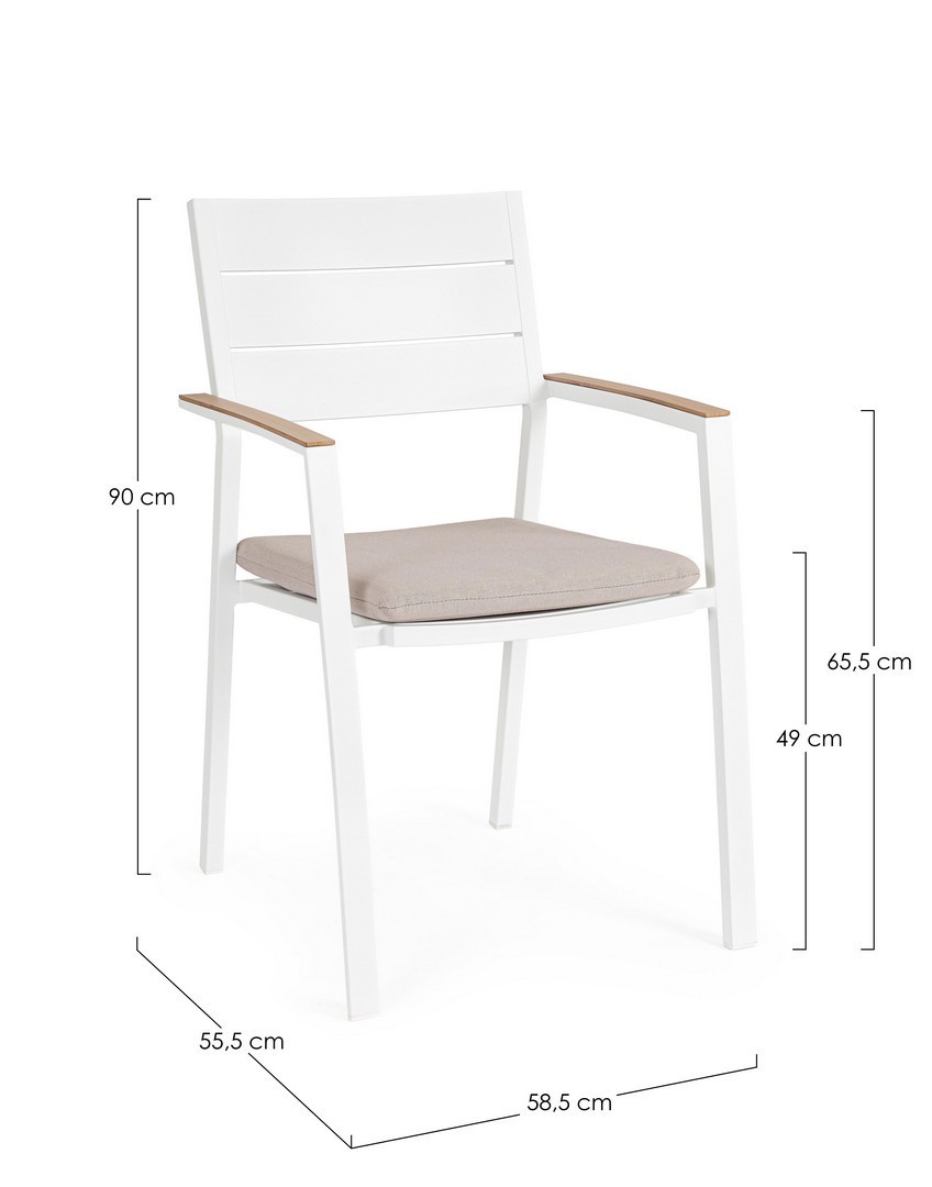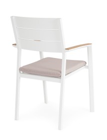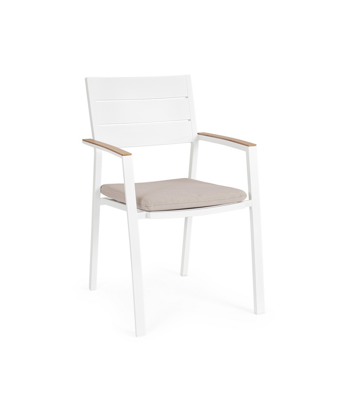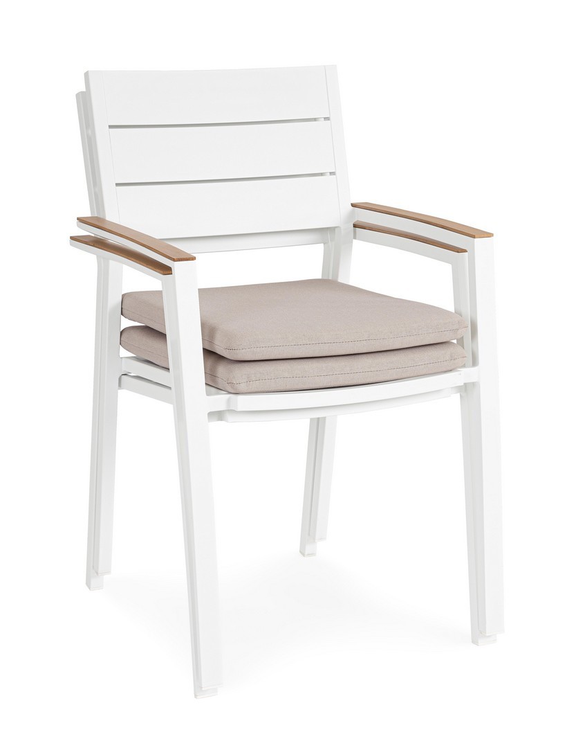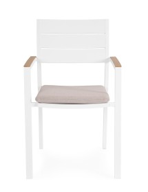 STRUTTURA IN ALLUMINIO VERNICIATO A POLVERE (POLIESTERE). BRACCIOLI IN ALLUMINIO CON VERNICIATURA EFFETTO LEGNO. CUSCINO SEDUTA SFODERABILE CON TESSUTO IDROREPELLENTE OLEFIN (100% POLIPROPILENE). IMPILABILE. IMBALLO SENZA CARTONE.
