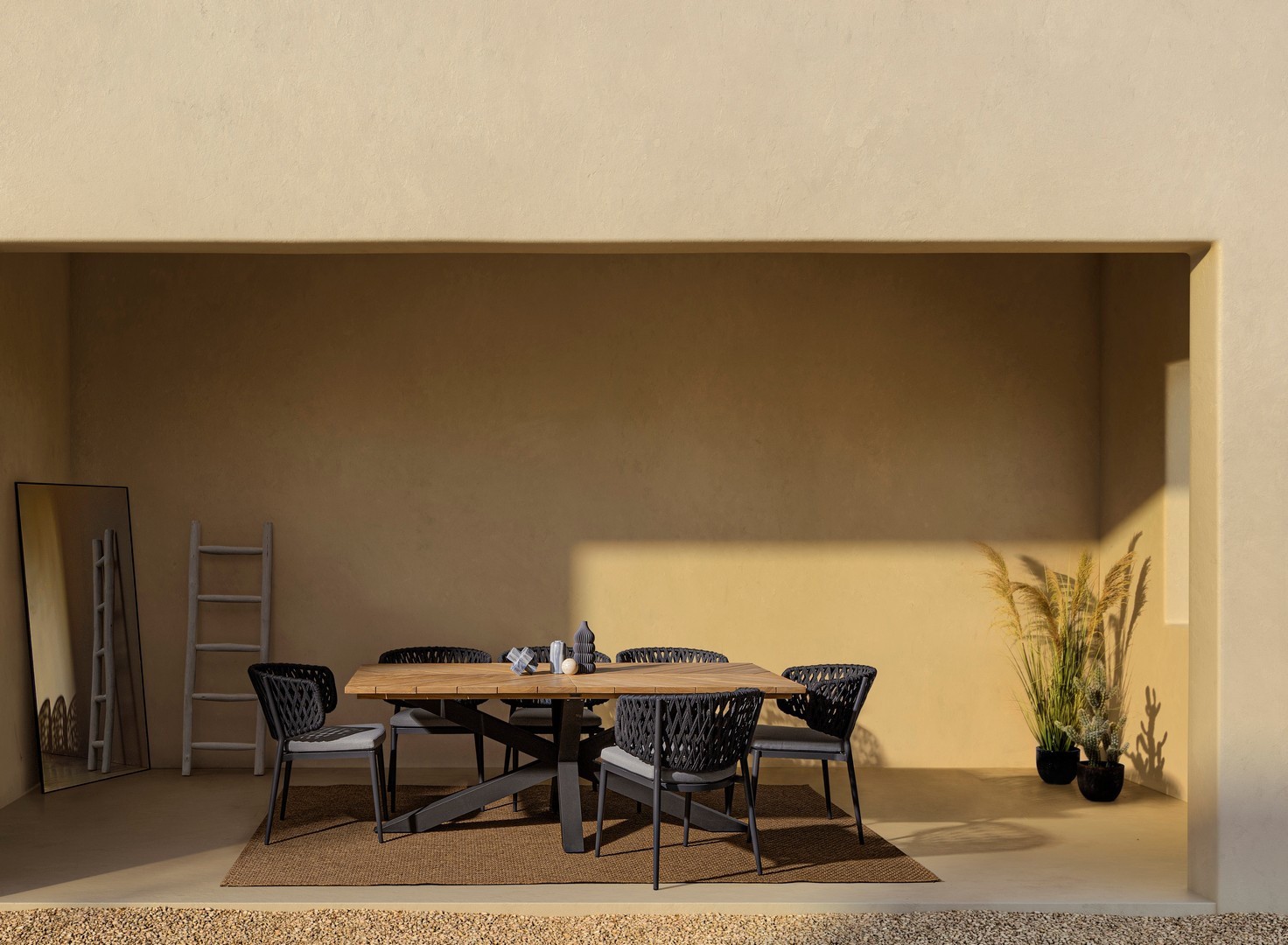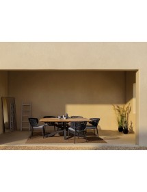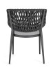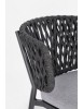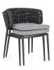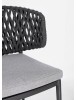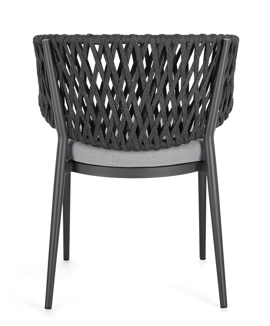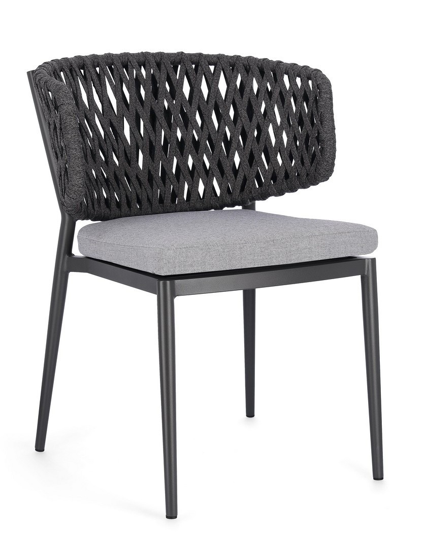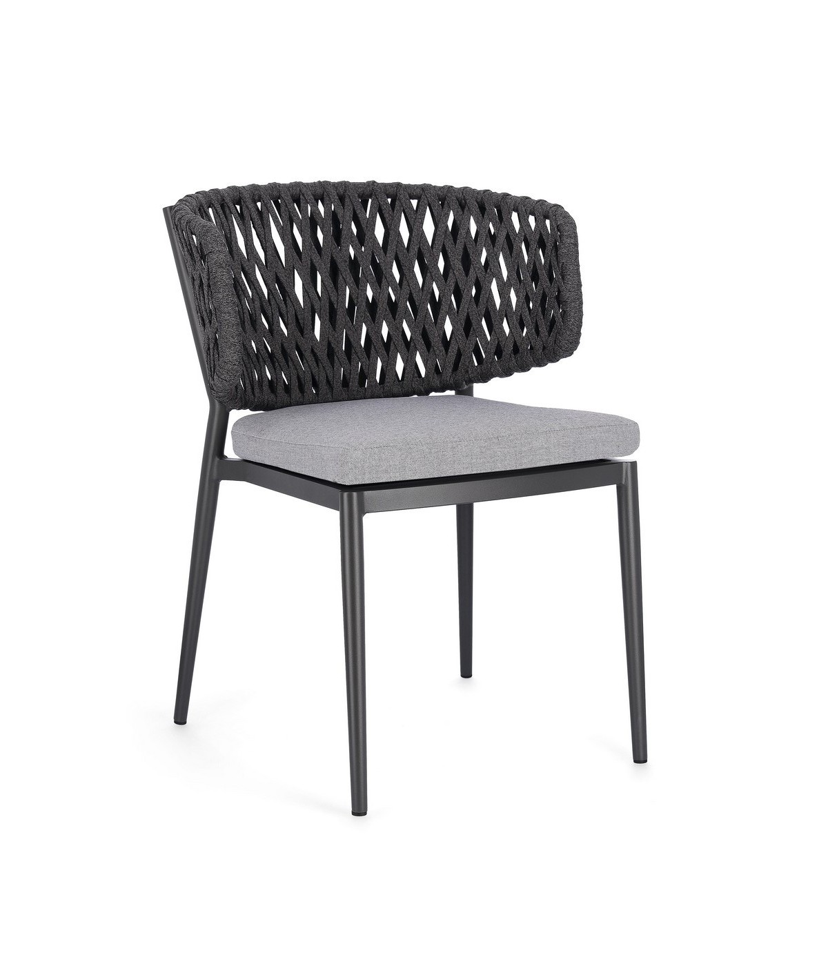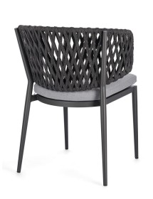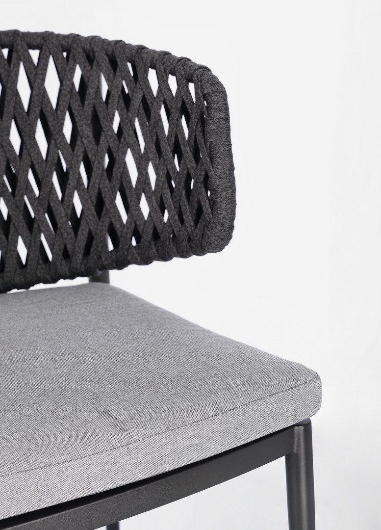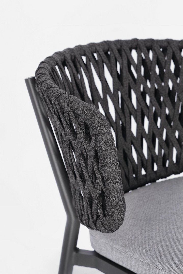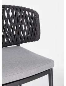 STRUTTURA IN ALLUMINIO VERNICIATO A POLVERE (POLIESTERE). INTRECCIO CON CORDE IN TETORON (100% POLIESTERE). CUSCINO SEDUTA SFODERABILE IN TESSUTO IDROREPELLENTE ACRILICO. IMPILABILE.