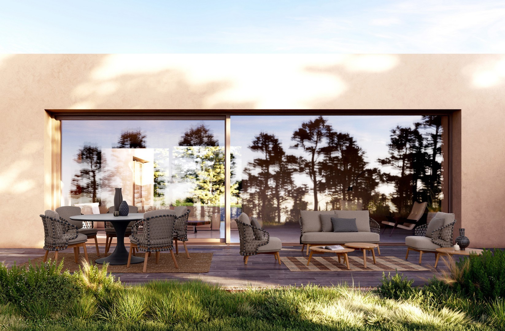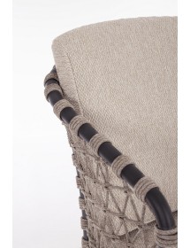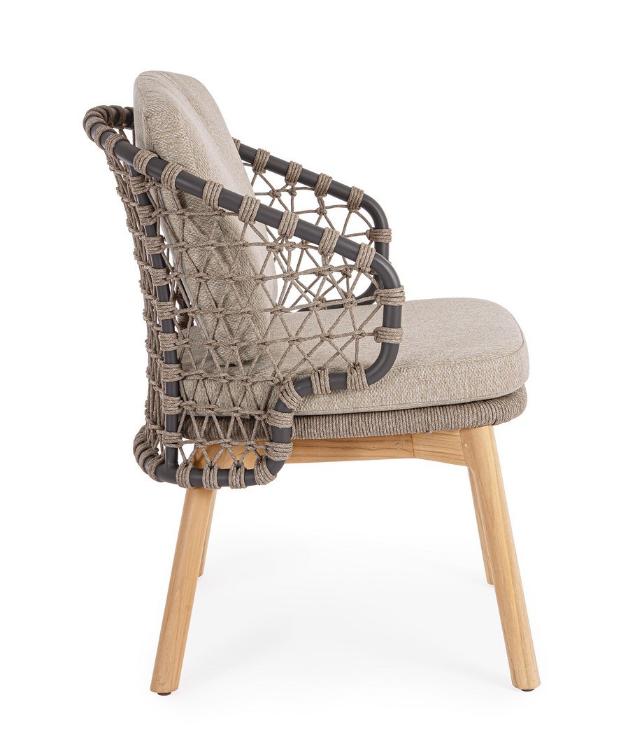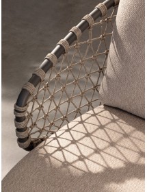 STRUTTURA IN ALLUMINIO VERNICIATA A POLVERE (POLIESTERE). GAMBE IN TEAK - SVLK (LEGNO CERTIFICATO PROVENIENTE DA FORESTE SOSTENIBILI). INTRECCIO PER ESTERNO IN CORDA (POLIPROPILENE). CUSCINI SFODERABILI IN TESSUTO IDROREPELLENTE SUNPROOF OLEFIN (100%POLIPROPILENE). VITERIA IN ACCIAIO INOSSIDABILE. GAMBE DA ASSEMBLARE.