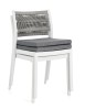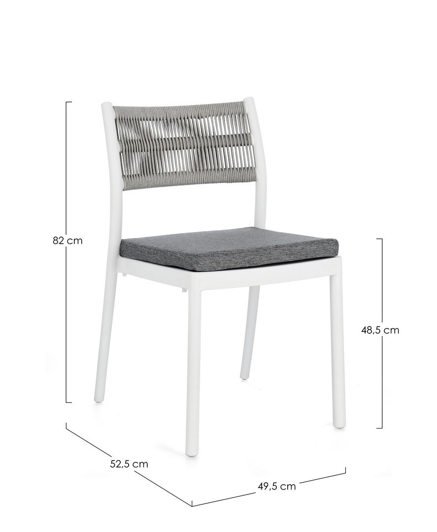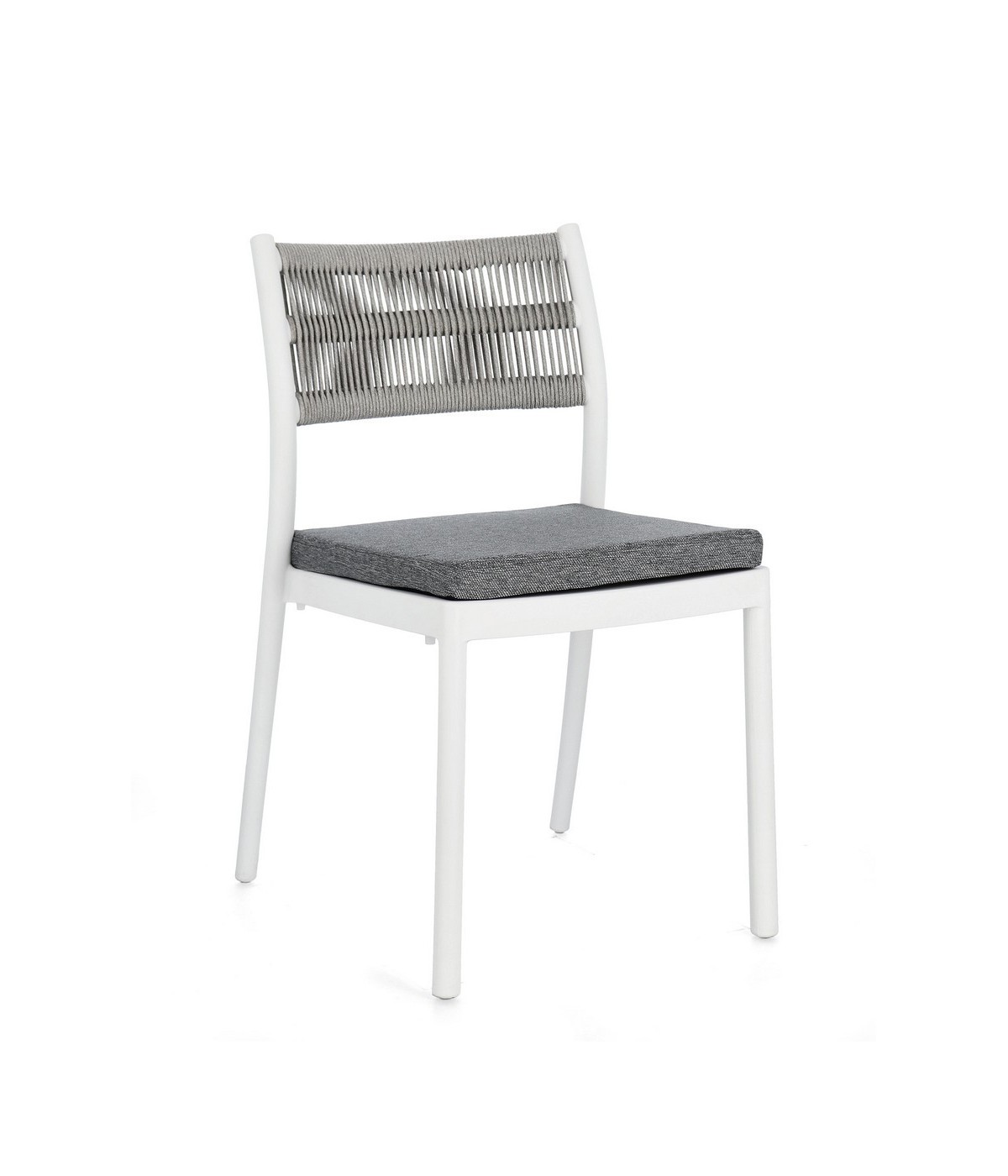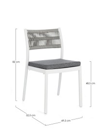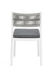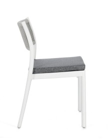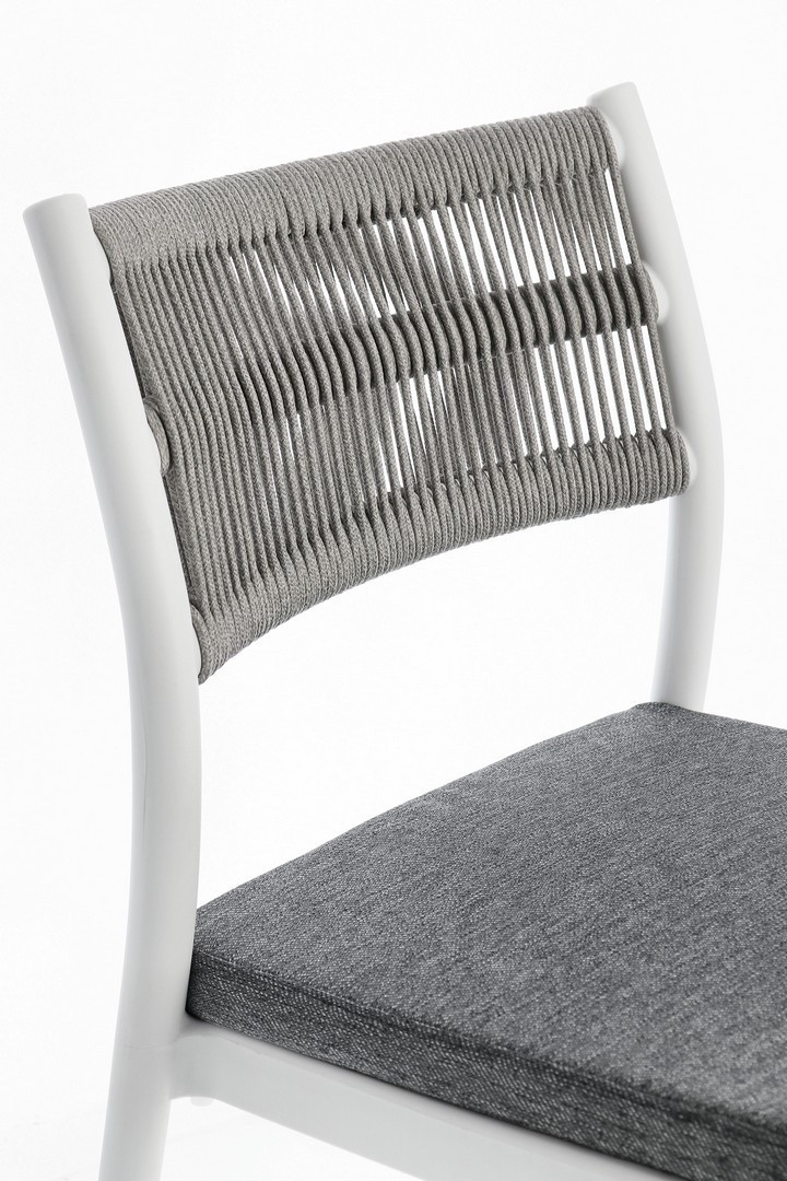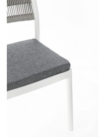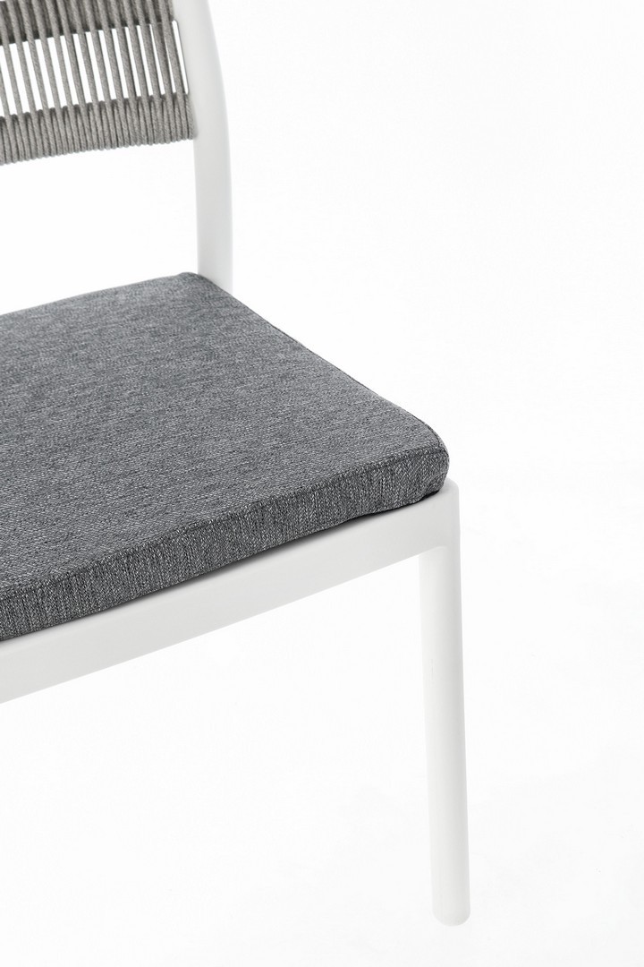 POLIPROPILENE (PP), RESISTENTE AI RAGGI UV. SCHIENALE CON INTRECCIO IN CORDA DI POLIESTERE. CUSCINO SEDUTA SFODERABILE CON TESSUTO IDROREPELLENTE POLIESTERE. IMPILABILE.