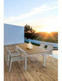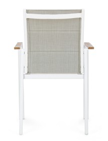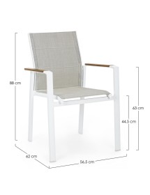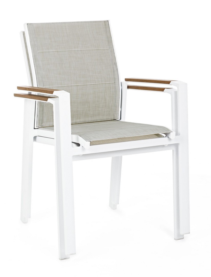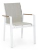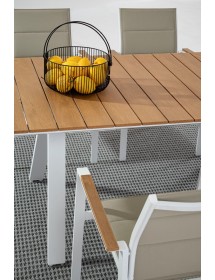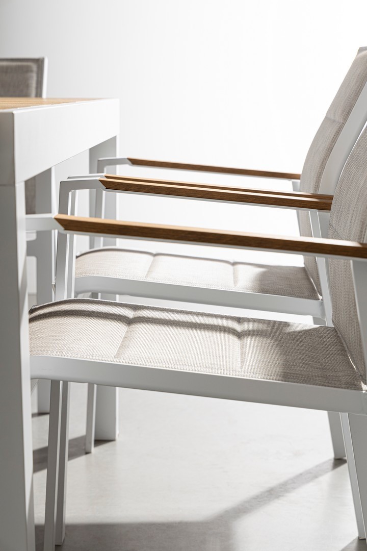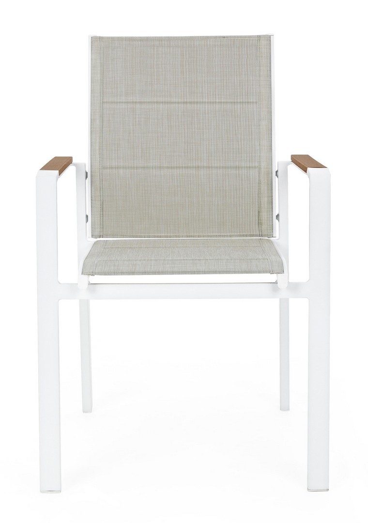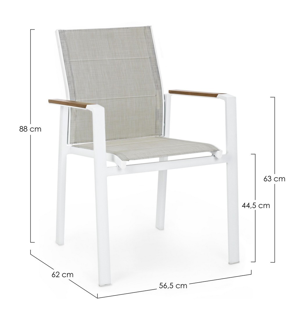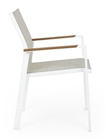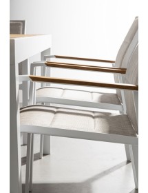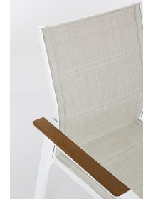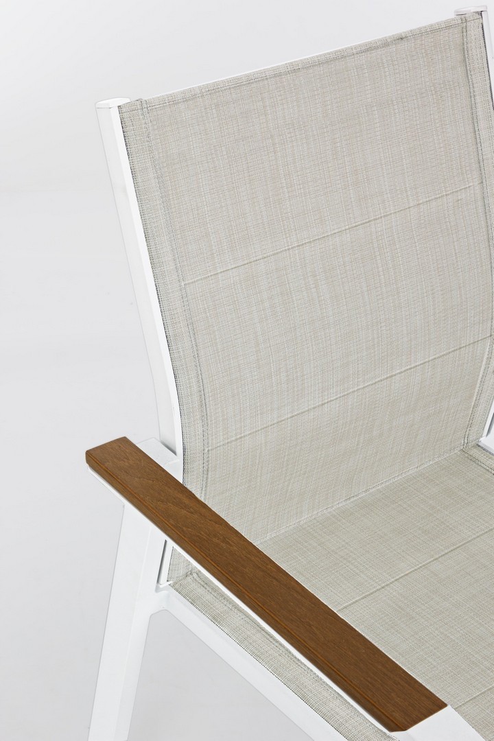 STRUTTURA IN ALLUMINIO, VERNICIATO A POLVERE (POLIESTERE). BRACCIOLI CON INSERTI IN POLYWOOD. RIVESTIMENTO SEDUTA E SCHIENALE IN TEXTILENE 2X1 (CON IMBOTTITURA). IMPILABILE. IMBALLO SENZA CARTONE.