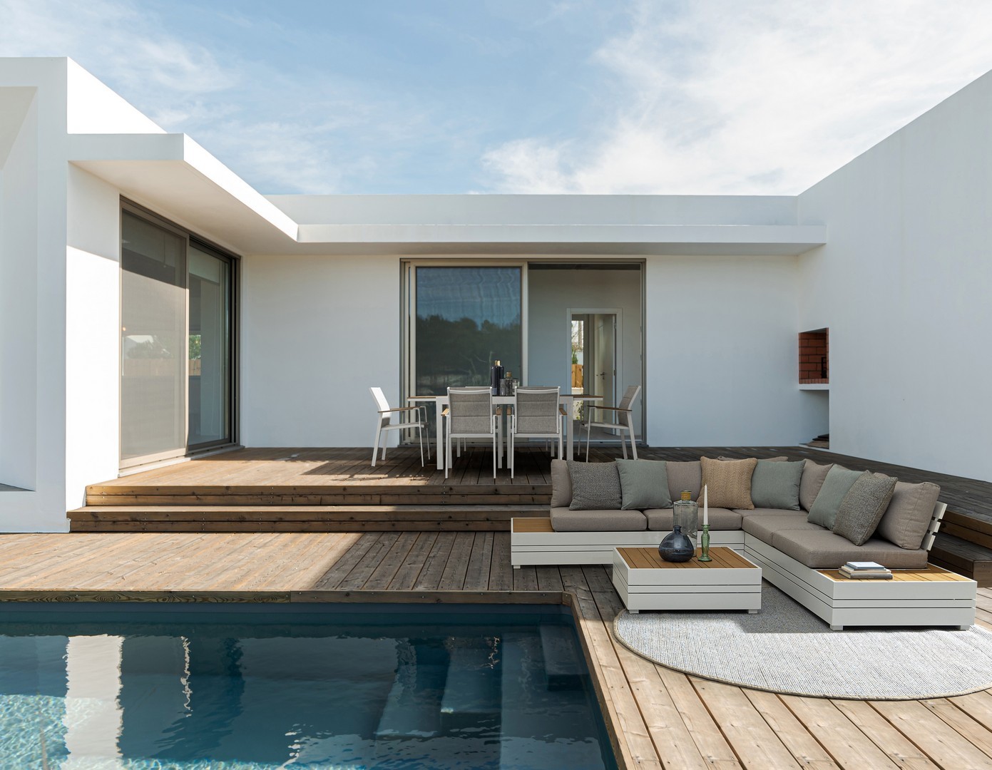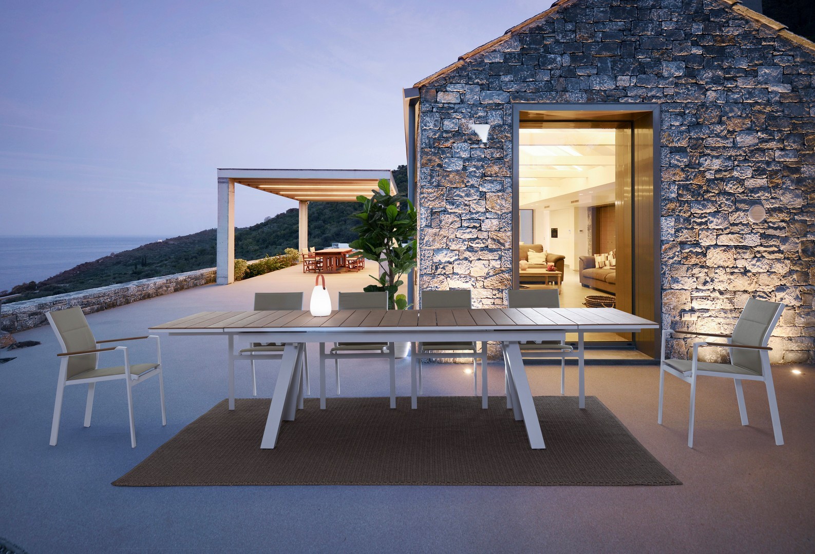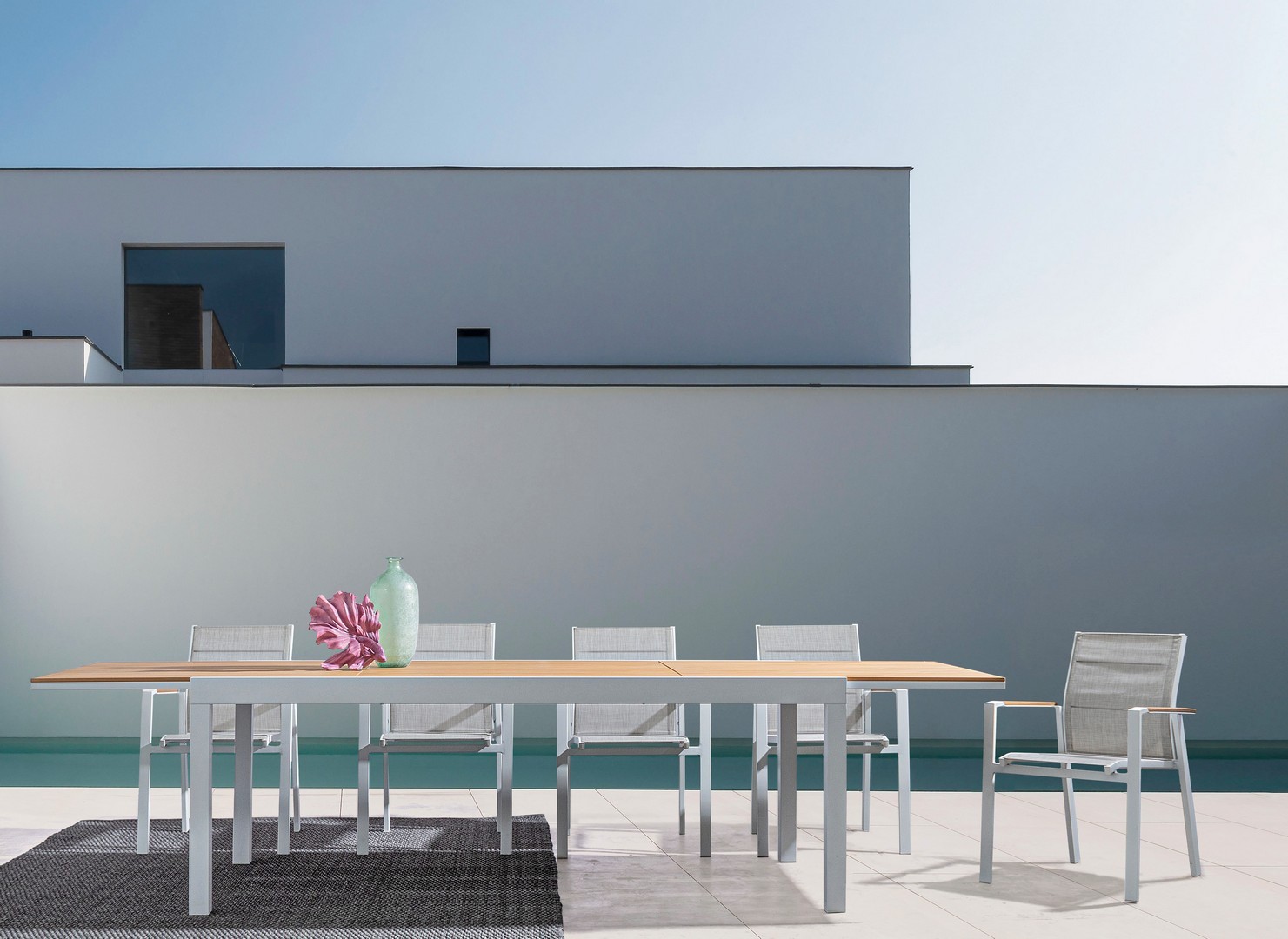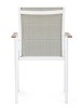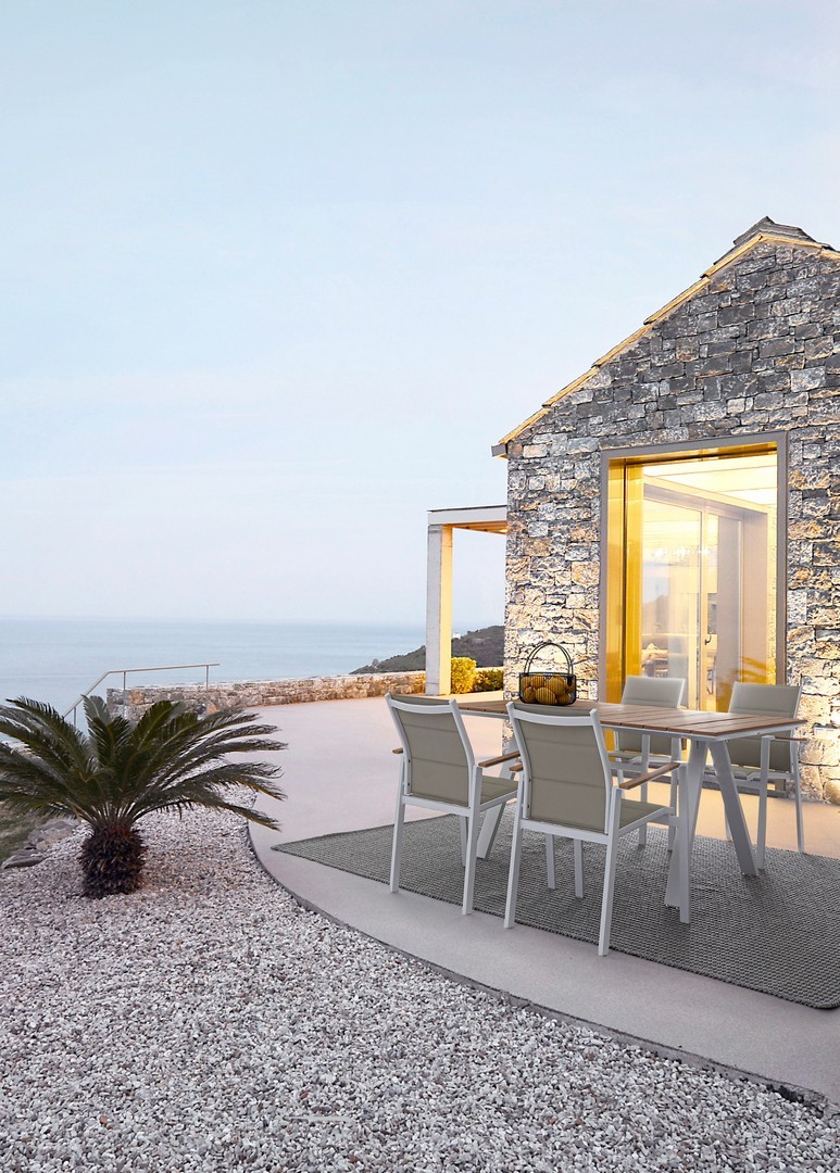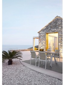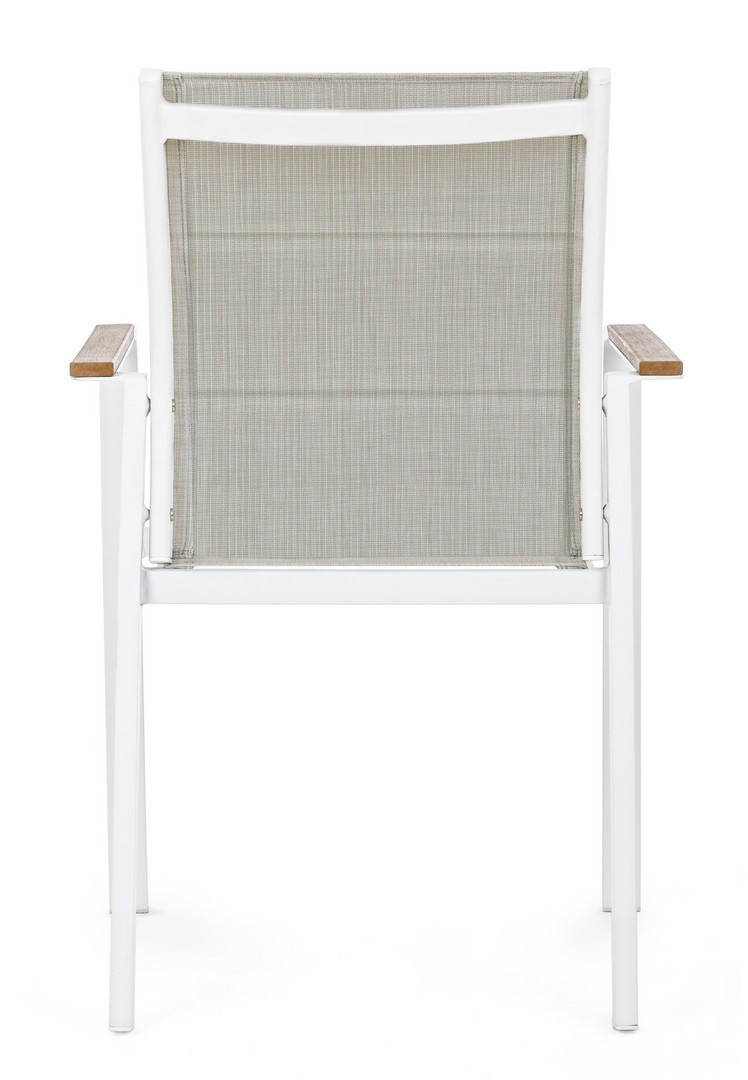 STRUTTURA IN ALLUMINIO, VERNICIATO A POLVERE (POLIESTERE). BRACCIOLI CON INSERTI IN POLYWOOD. RIVESTIMENTO SEDUTA E SCHIENALE IN TEXTILENE 2X1 (CON IMBOTTITURA). IMPILABILE. IMBALLO SENZA CARTONE.