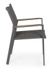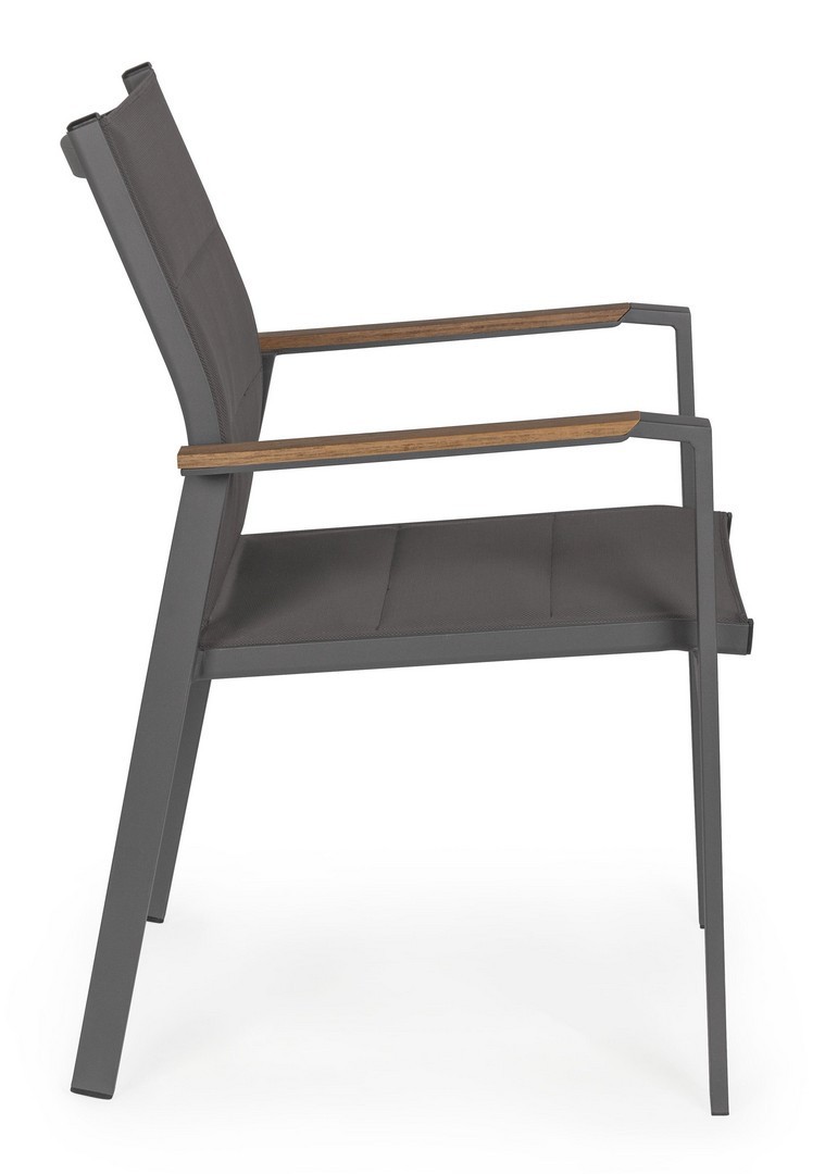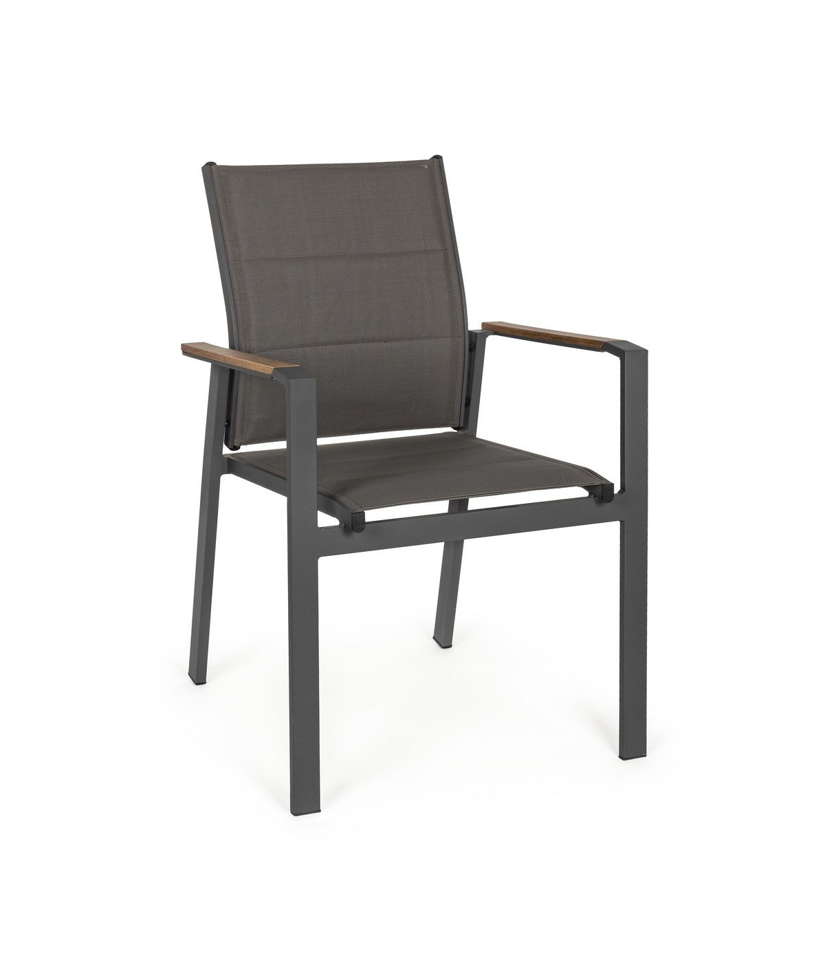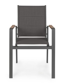STRUTTURA IN ALLUMINIO, VERNICIATO A POLVERE (POLIESTERE). BRACCIOLI CON INSERTI IN POLYWOOD. RIVESTIMENTO SEDUTA E SCHIENALE IN TEXTILENE 2X2 (CON IMBOTTITURA). IMPILABILE. IMBALLO SENZA CARTONE.