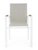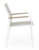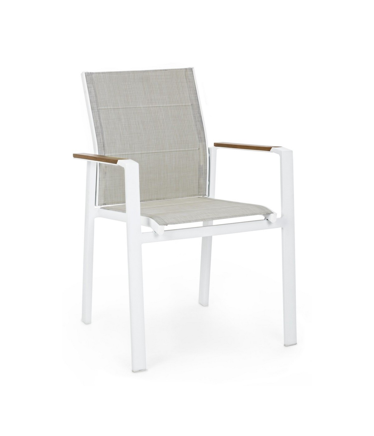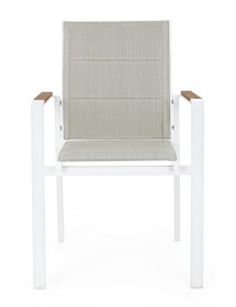 STRUTTURA IN ALLUMINIO, VERNICIATO A POLVERE (POLIESTERE). BRACCIOLI CON INSERTI IN POLYWOOD. RIVESTIMENTO SEDUTA E SCHIENALE IN TEXTILENE 2X1 (CON IMBOTTITURA). IMPILABILE. IMBALLO SENZA CARTONE.