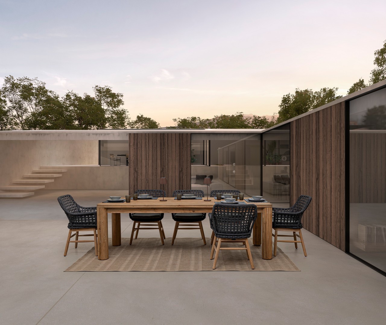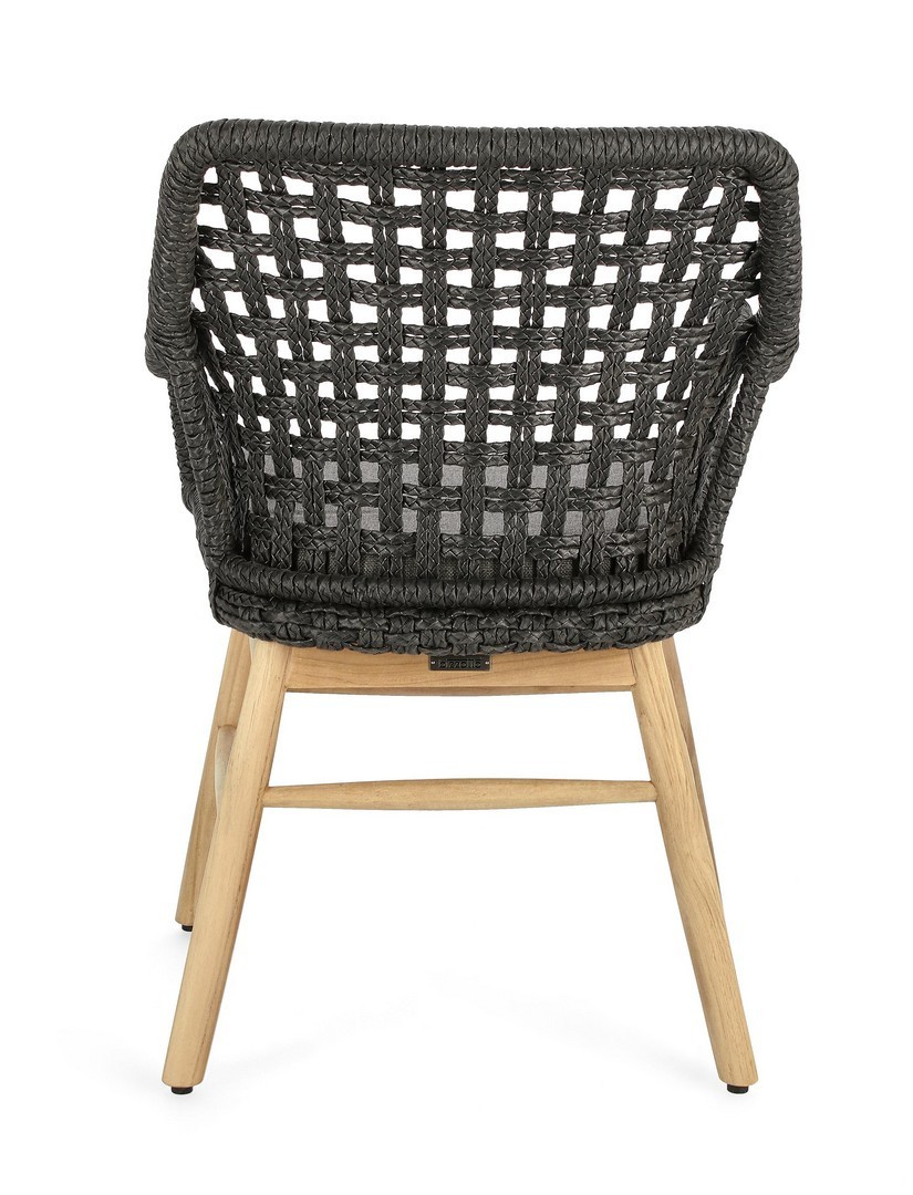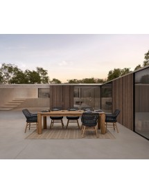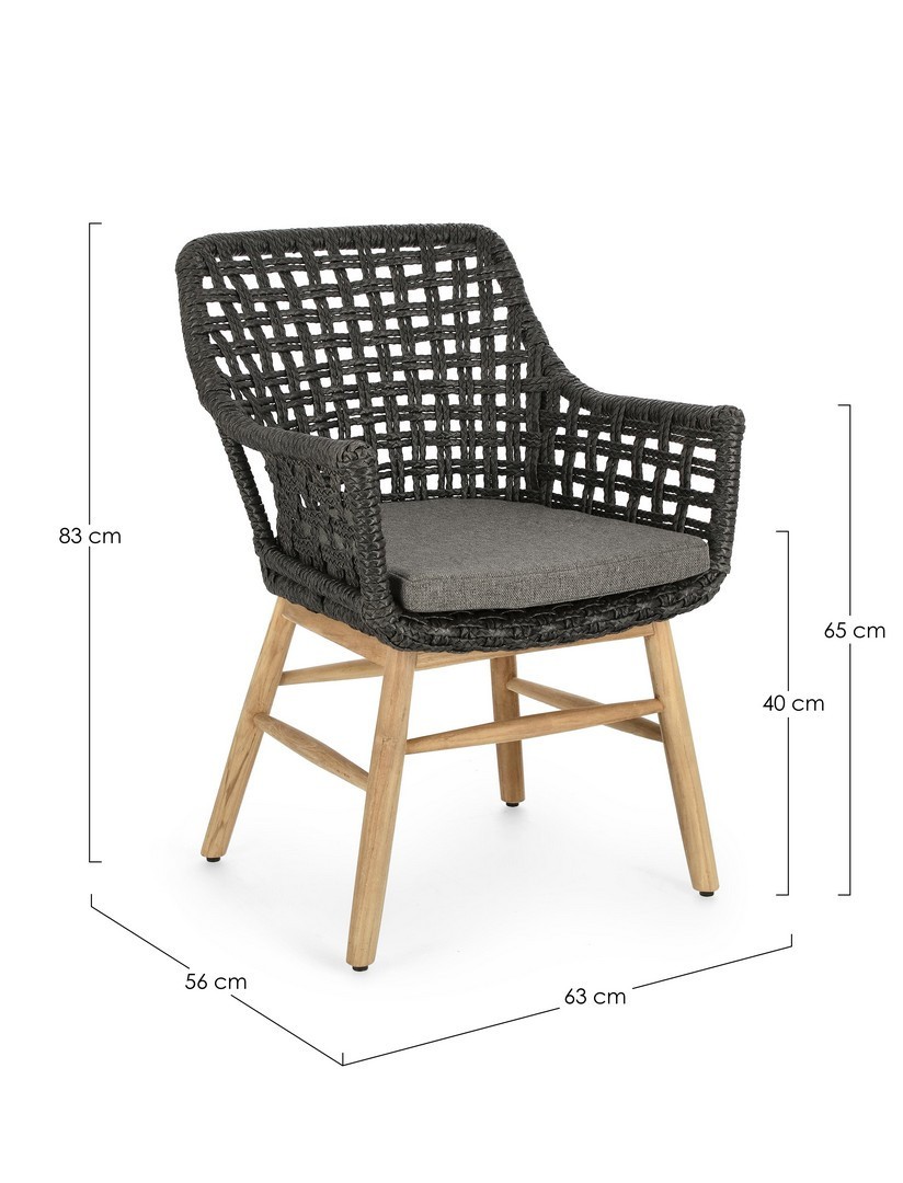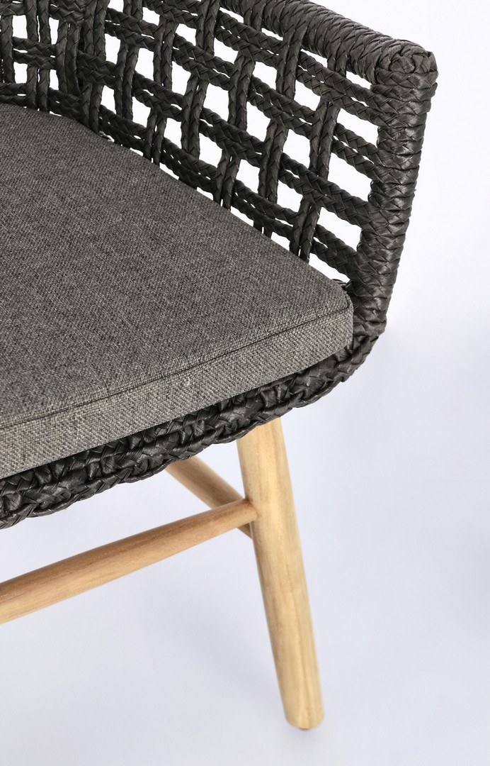 SEDUTA CON STRUTTURA IN ALLUMINIO VERNICIATA A POLVERE (POLIESTERE). INTRECCIO IN FIBRA SINTETICA VIRO CON ORIGINALE PIEGATURA A TRECCIA (EFFETTO PELLE). CUSCINO SEDUTA SFODERABILE IN TESSUTO SUNPROOF OLEFIN (100% POLIPROPILENE). GAMBE IN TEAK - SVLK (LEGNO CERTIFICATO PROVENIENTE DA FORESTE SOSTENIBILI). VITERIA IN ACCIAIO GALVANIZZATO. GAMBE DA ASSEMBLARE