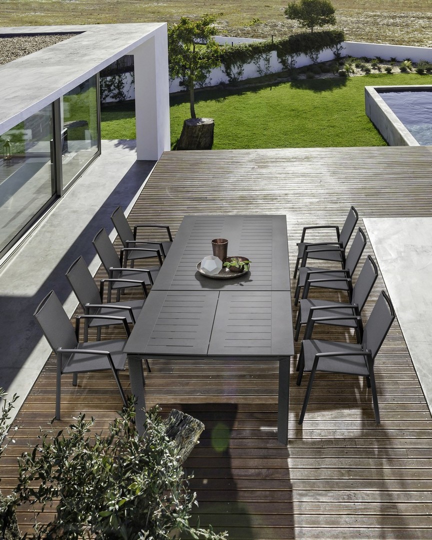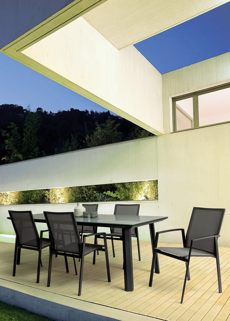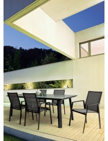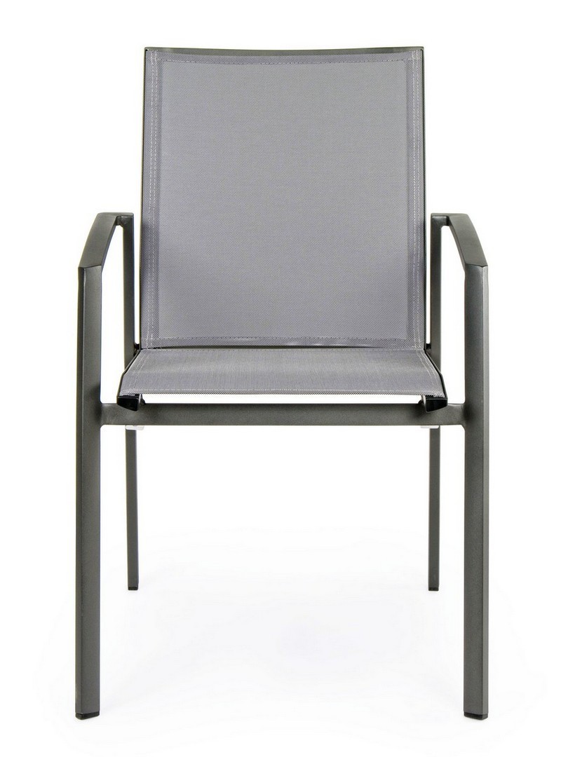 STRUTTURA IN ALLUMINIO, VERNICIATO A POLVERE (POLIESTERE). SEDUTA E SCHIENALE RIVESTITI IN TEXTILENE PHIFER 1X1. IMPILABILE.
